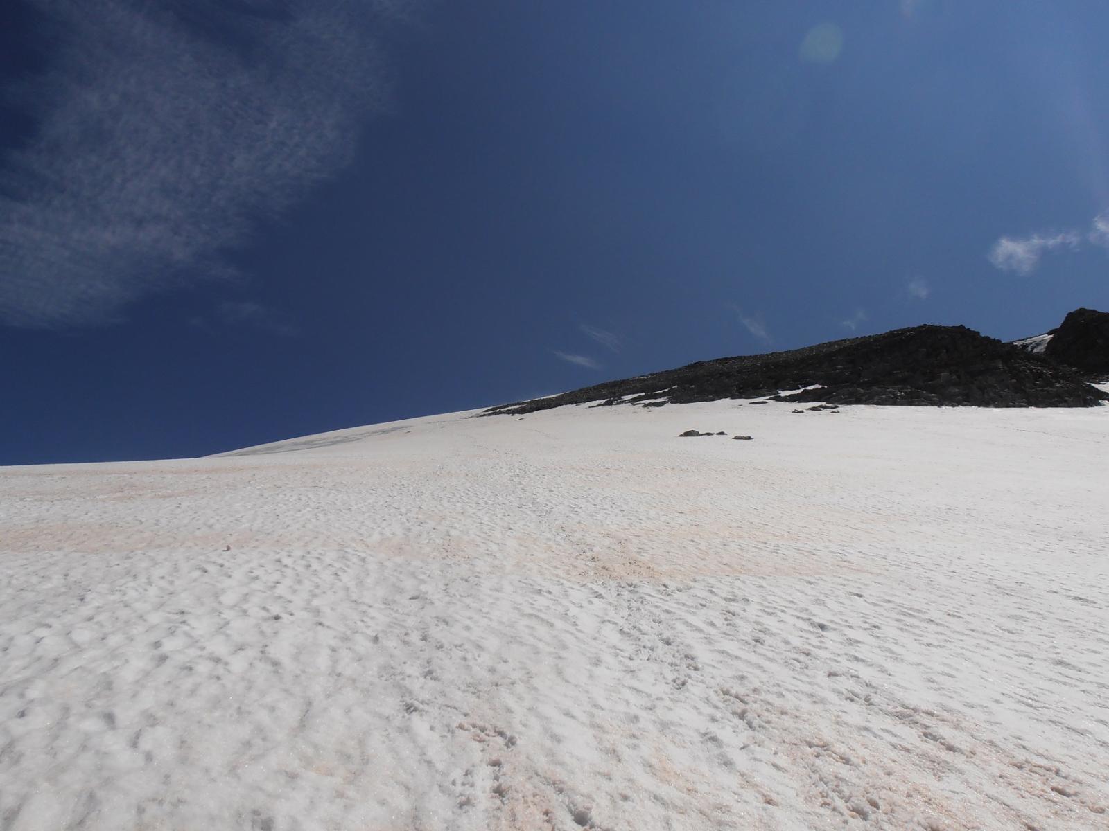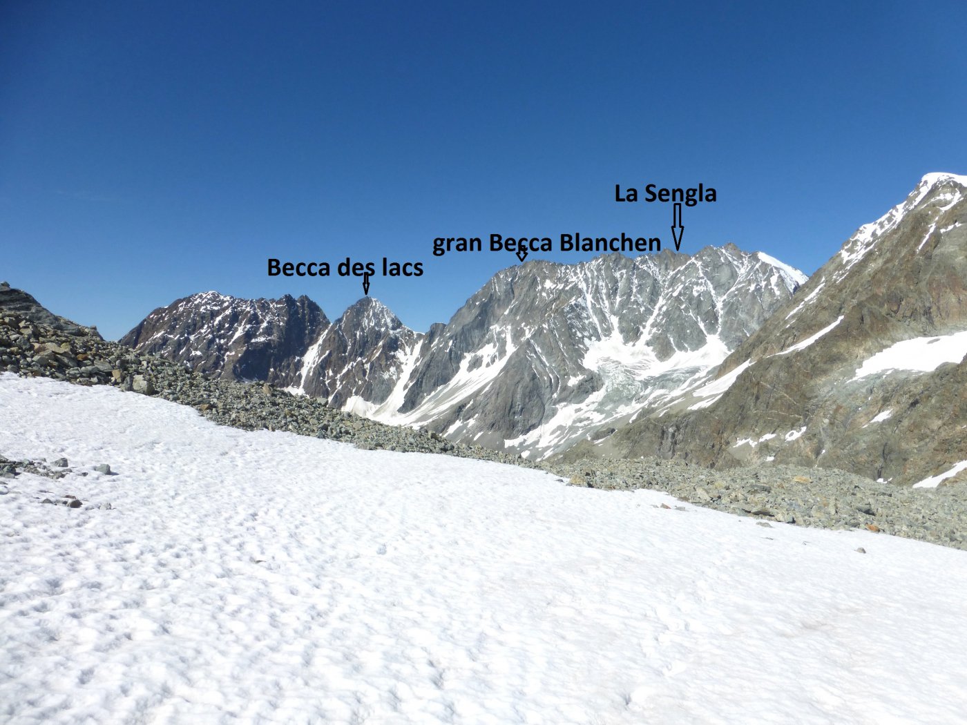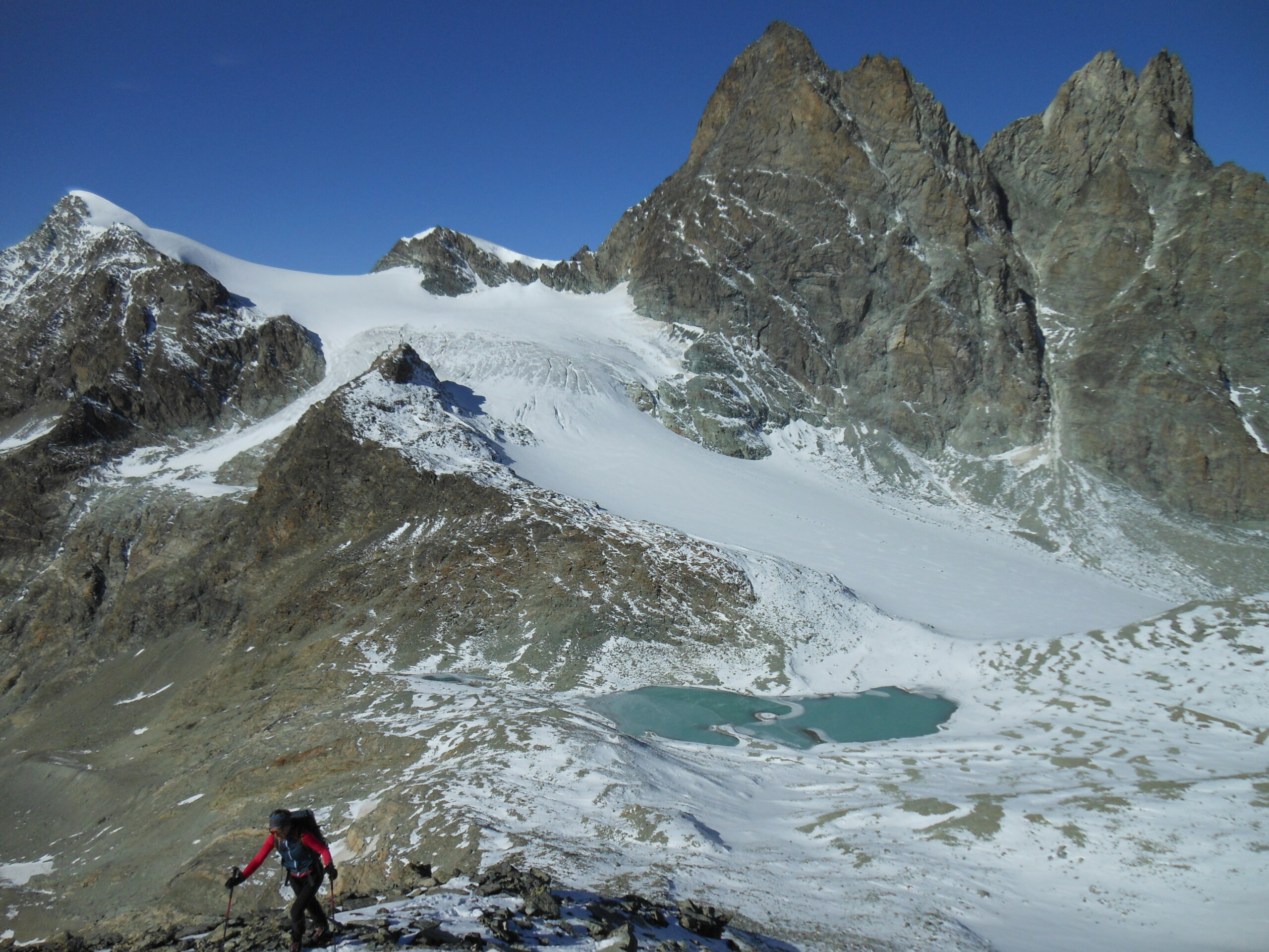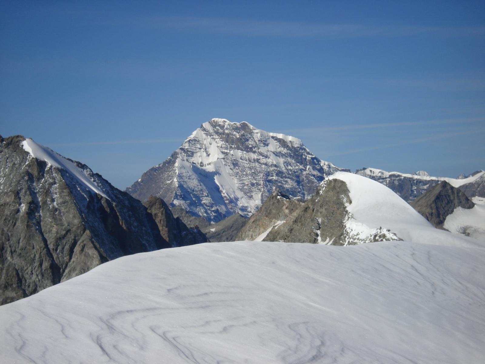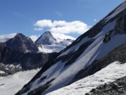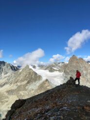 Si sale ora senza percorso obbligato il ripido pendio di neve a inizio stagione o di detriti un po’ faticosi a fine estate, raggiungendo la spianata della dorsale ovest dove si possono incontrare glacio-nevai residui. Si sale ancora fino ad un dosso che si può considerare l’anticima dove ha origine il breve tratto di cresta conclusivo; qui la cresta diventa più stretta (non esposta ma un po’ aggettante per il salto sul lato italiano e lo scivolo sul versante svizzero), comunque il percorso è in scarsa pendenza e non si incontrano ostacoli fino a raggiungere l’ometto della cima 3496 m.