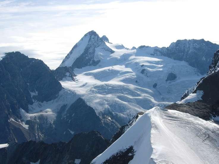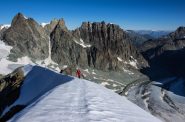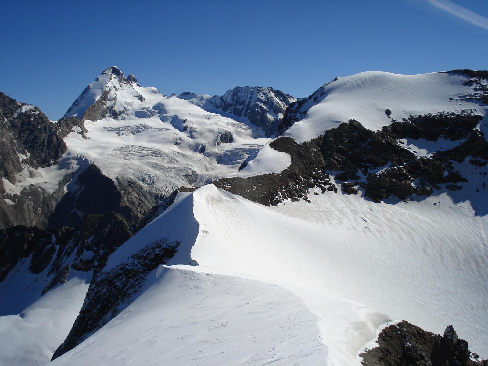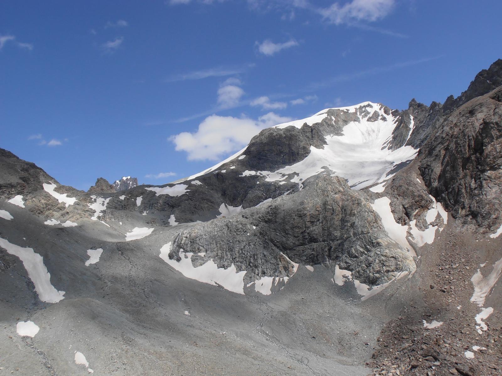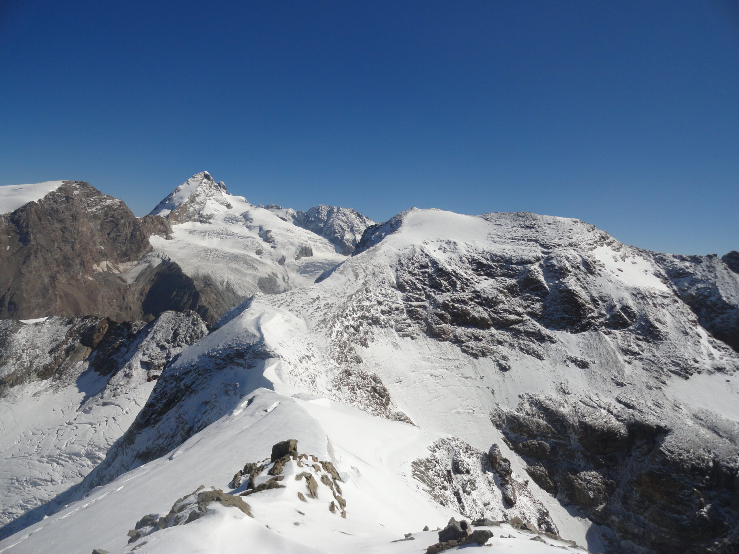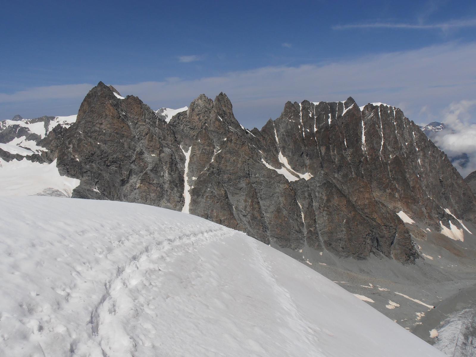 Si sale ora senza percorso obbligato il ripido pendio di neve a inizio stagione o di detriti un po’ faticosi a fine estate, raggiungendo la spianata della dorsale ovest dove si possono incontrare glacio-nevai residui. Si sale ancora fino ad un dosso che si può considerare l’anticima dove ha origine il breve tratto di cresta conclusivo; qui la cresta diventa più stretta (non esposta ma un po’ aggettante per il salto sul lato italiano e lo scivolo sul versante svizzero), comunque il percorso è in scarsa pendenza e non si incontrano ostacoli fino a raggiungere l’ometto della cima 3496 m.