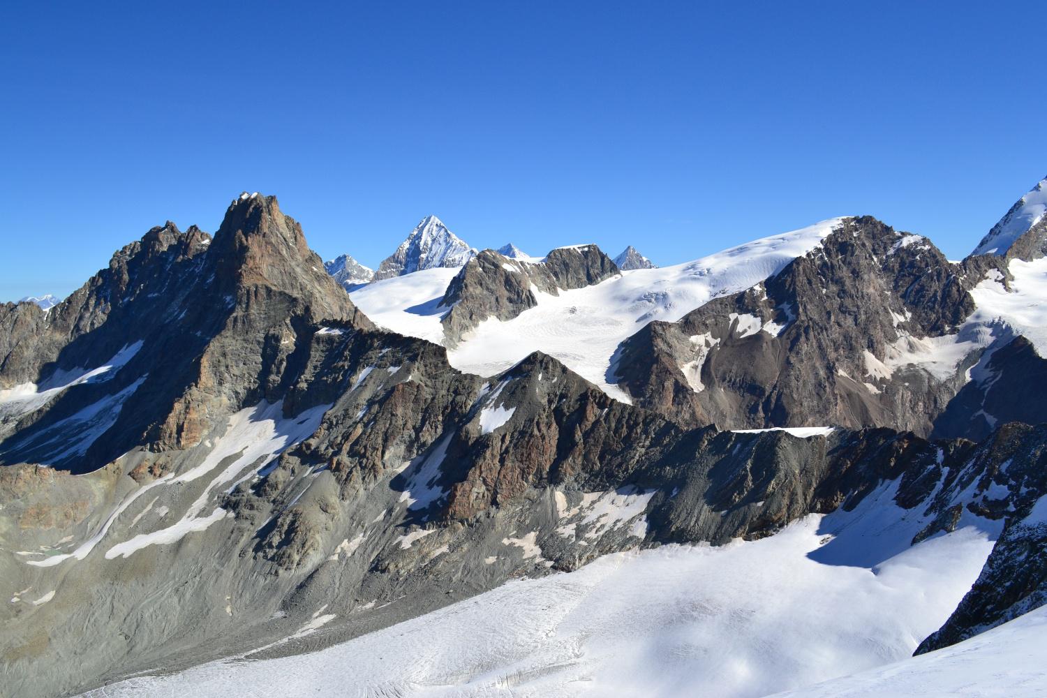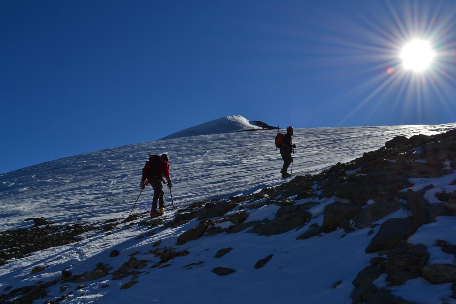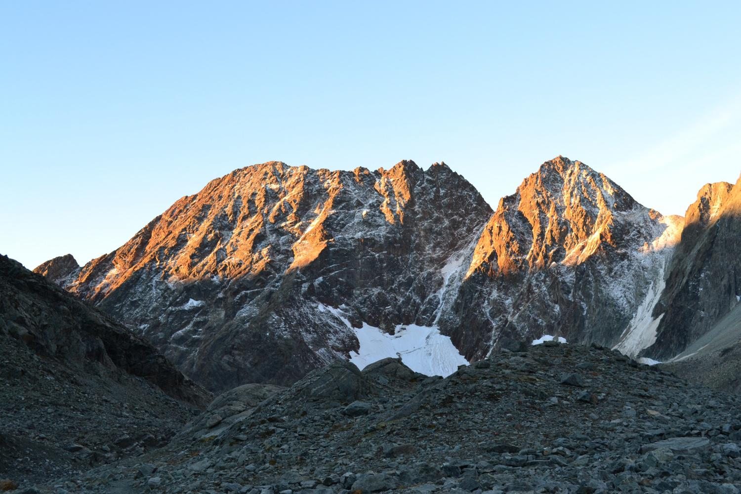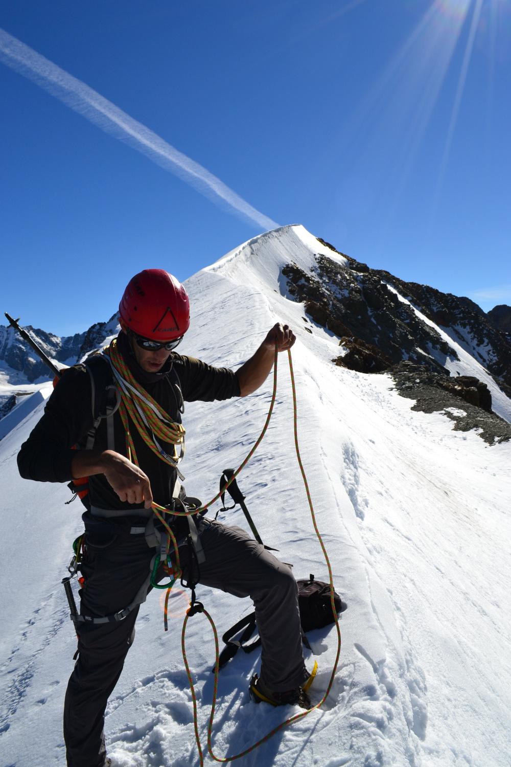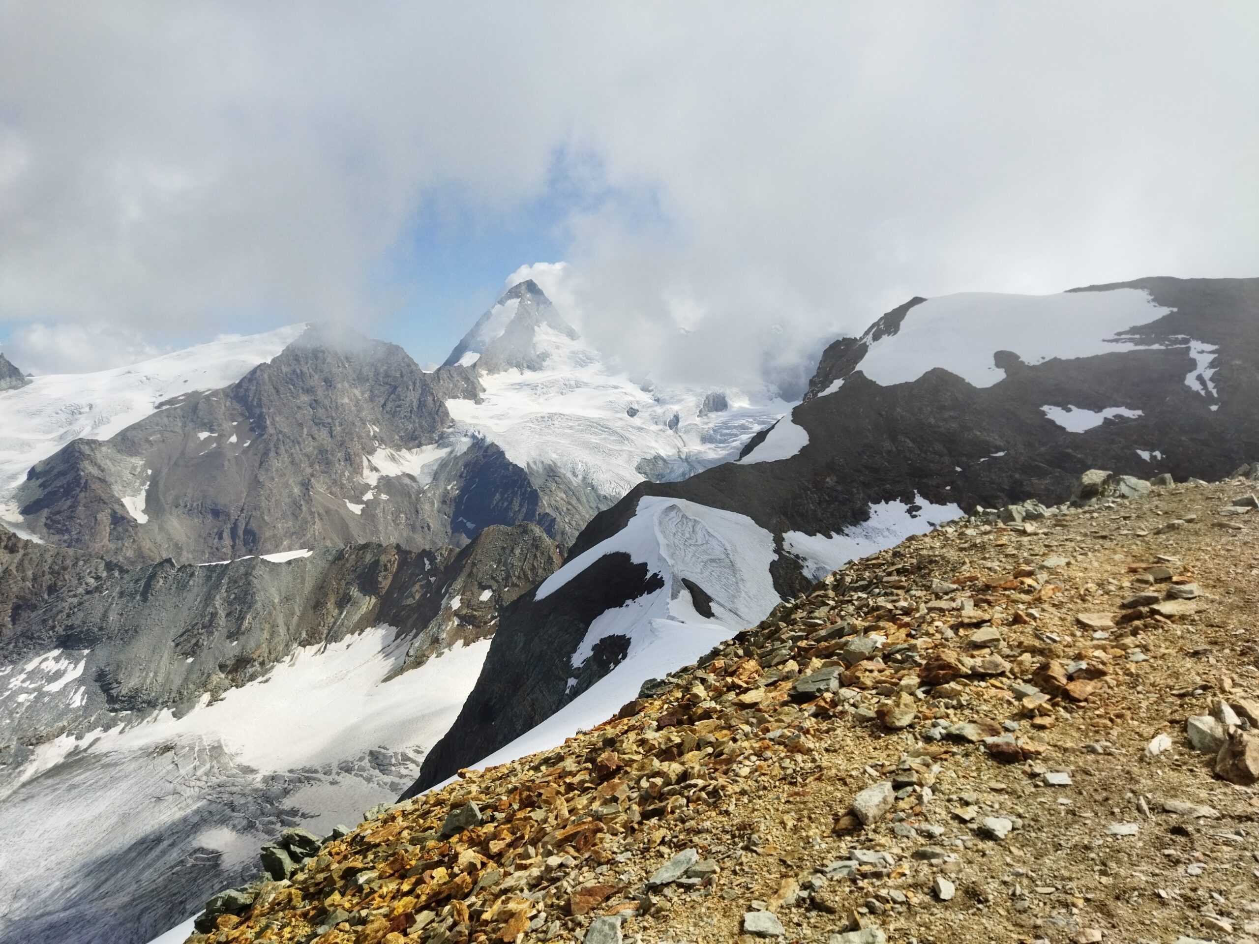 Si sale ora senza percorso obbligato il ripido pendio di neve a inizio stagione o di detriti un po’ faticosi a fine estate, raggiungendo la spianata della dorsale ovest dove si possono incontrare glacio-nevai residui. Si sale ancora fino ad un dosso che si può considerare l’anticima dove ha origine il breve tratto di cresta conclusivo; qui la cresta diventa più stretta (non esposta ma un po’ aggettante per il salto sul lato italiano e lo scivolo sul versante svizzero), comunque il percorso è in scarsa pendenza e non si incontrano ostacoli fino a raggiungere l’ometto della cima 3496 m.