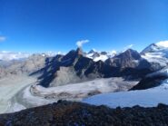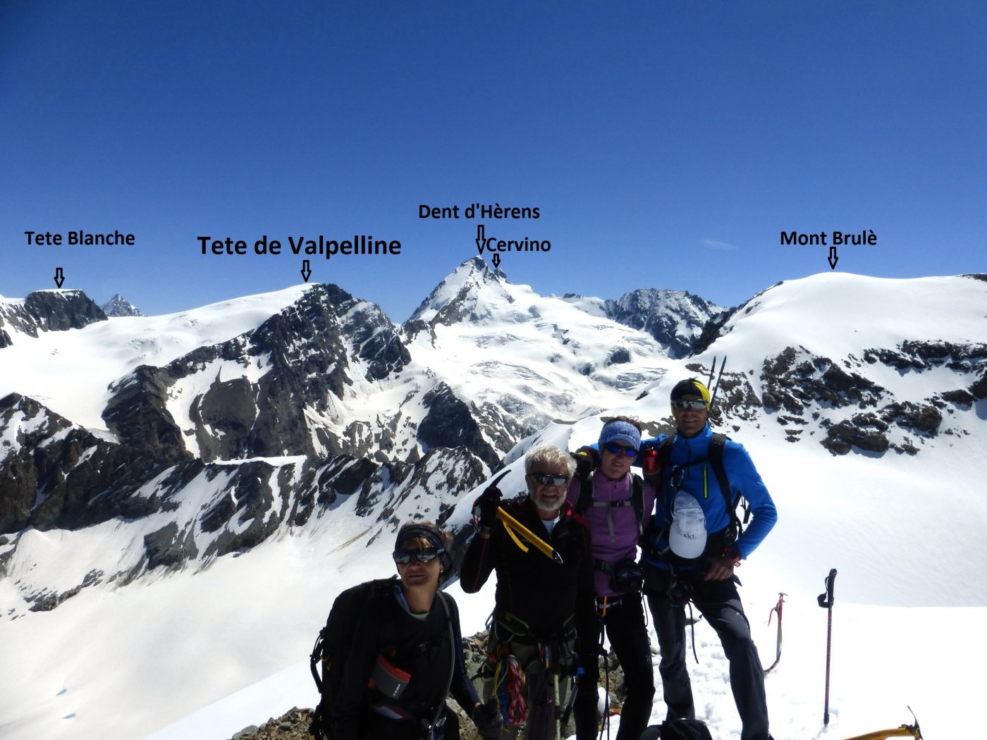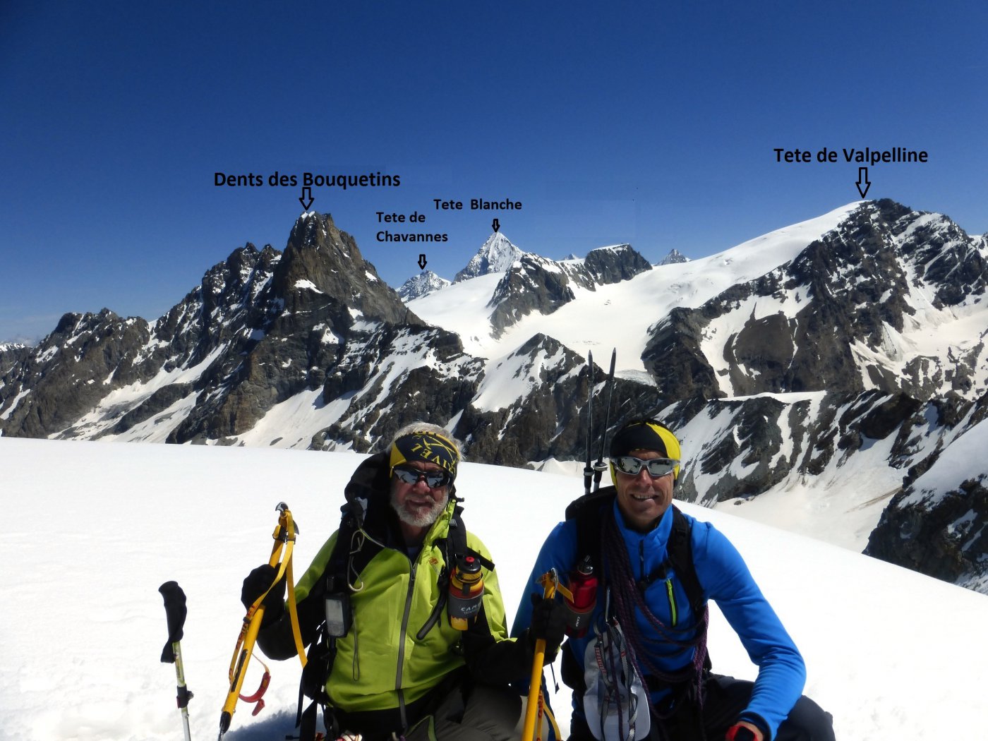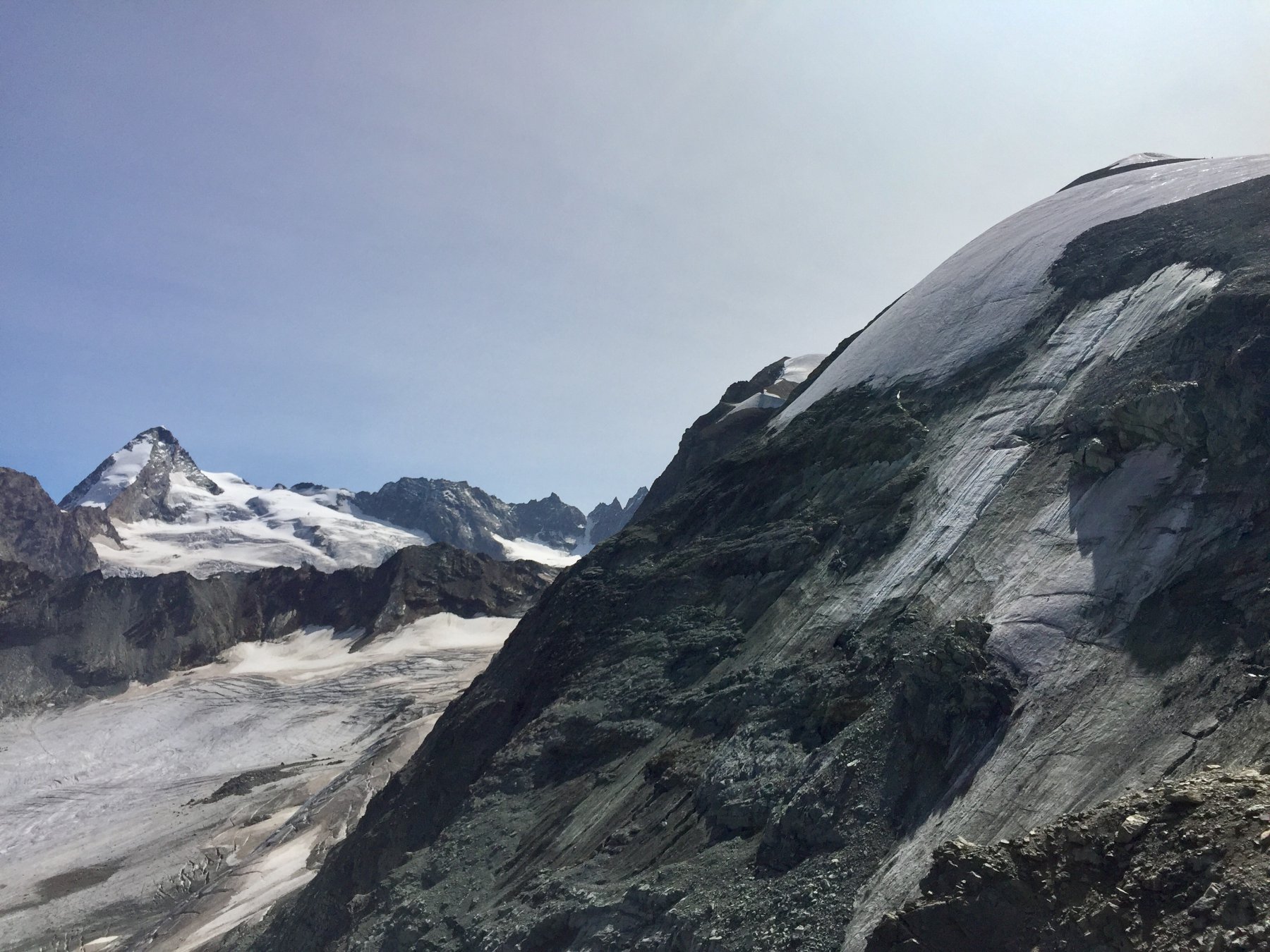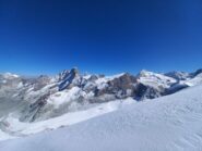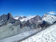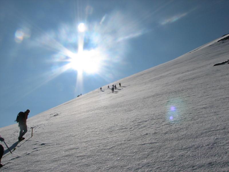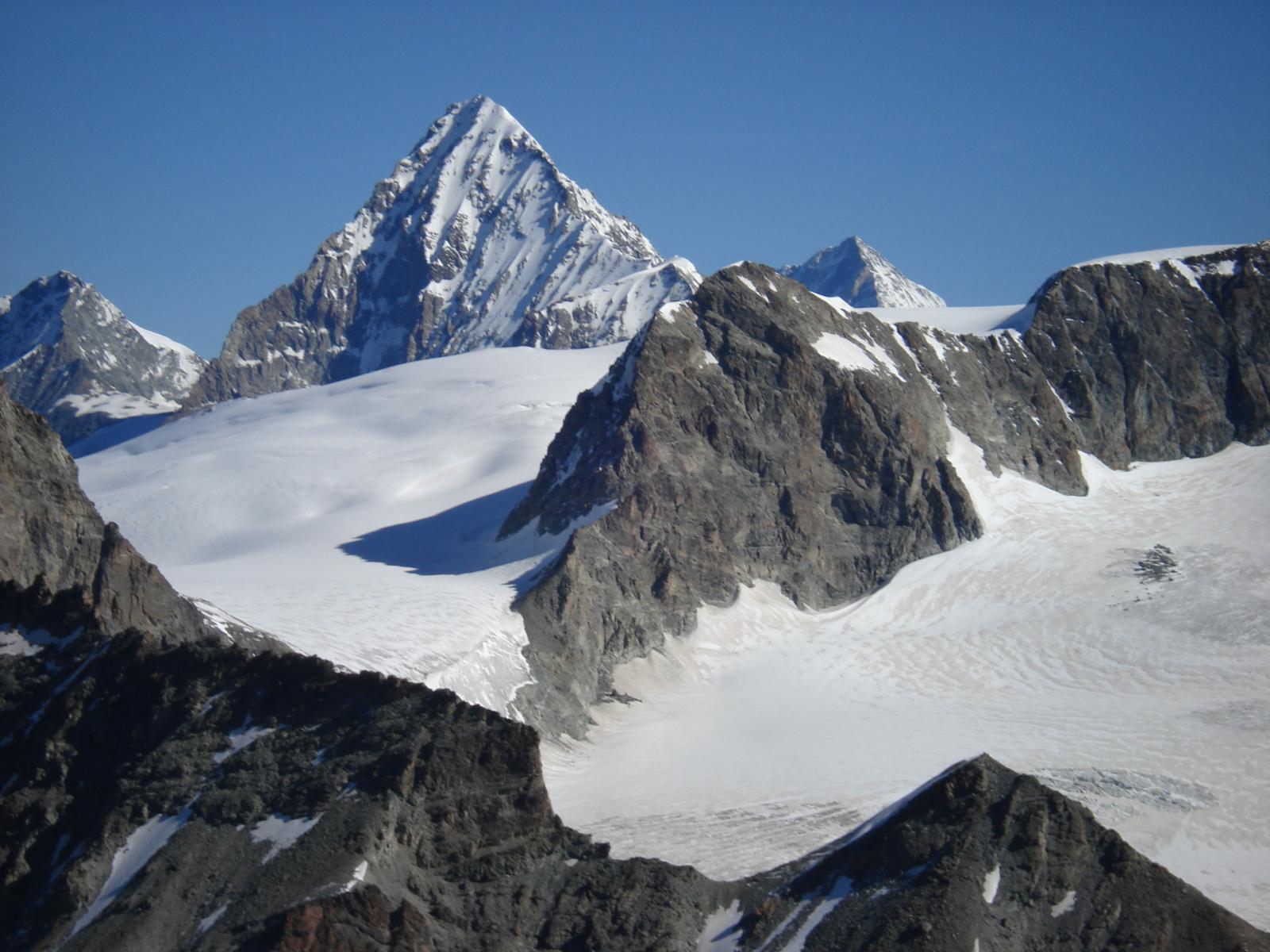 Si sale ora senza percorso obbligato il ripido pendio di neve a inizio stagione o di detriti un po’ faticosi a fine estate, raggiungendo la spianata della dorsale ovest dove si possono incontrare glacio-nevai residui. Si sale ancora fino ad un dosso che si può considerare l’anticima dove ha origine il breve tratto di cresta conclusivo; qui la cresta diventa più stretta (non esposta ma un po’ aggettante per il salto sul lato italiano e lo scivolo sul versante svizzero), comunque il percorso è in scarsa pendenza e non si incontrano ostacoli fino a raggiungere l’ometto della cima 3496 m.