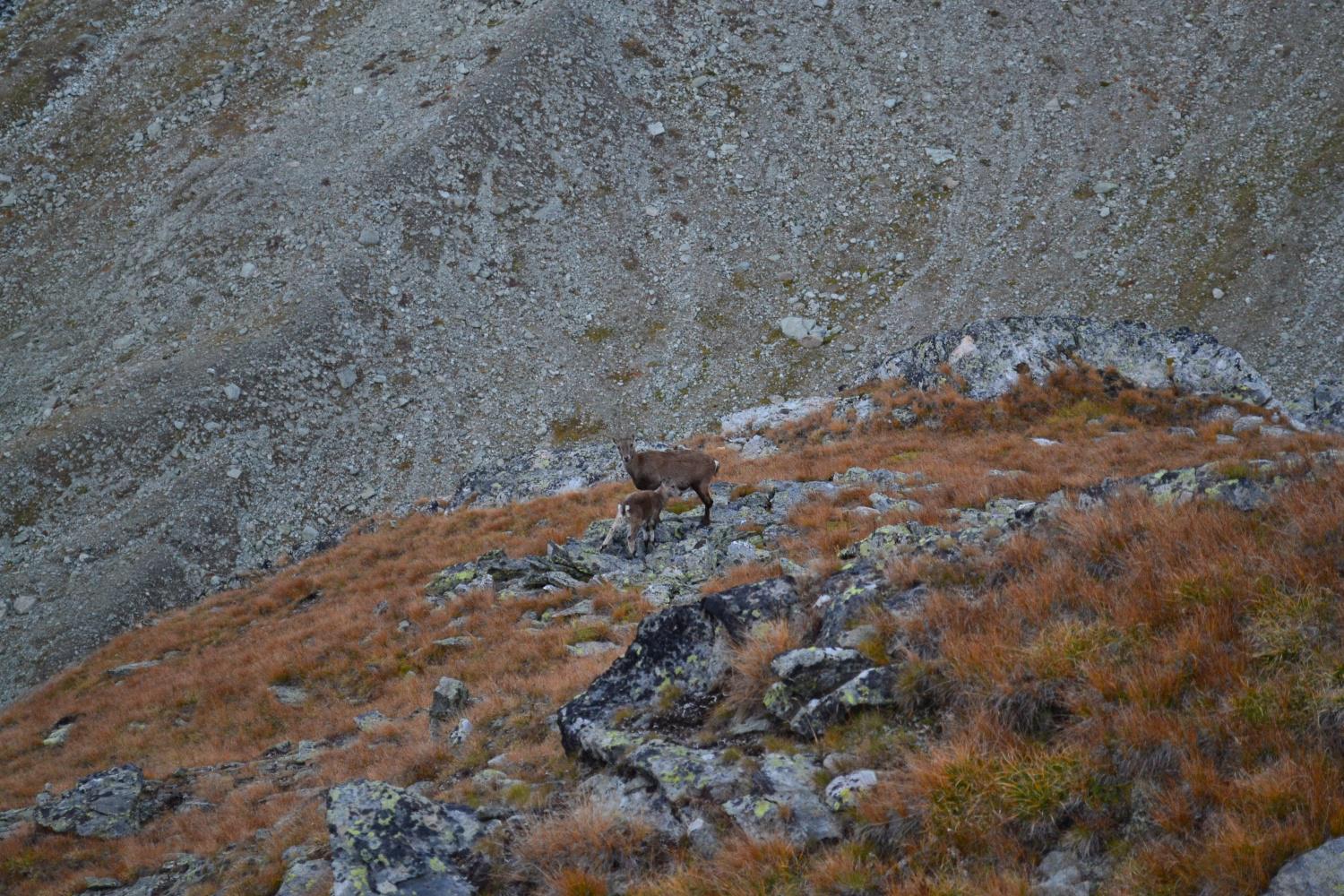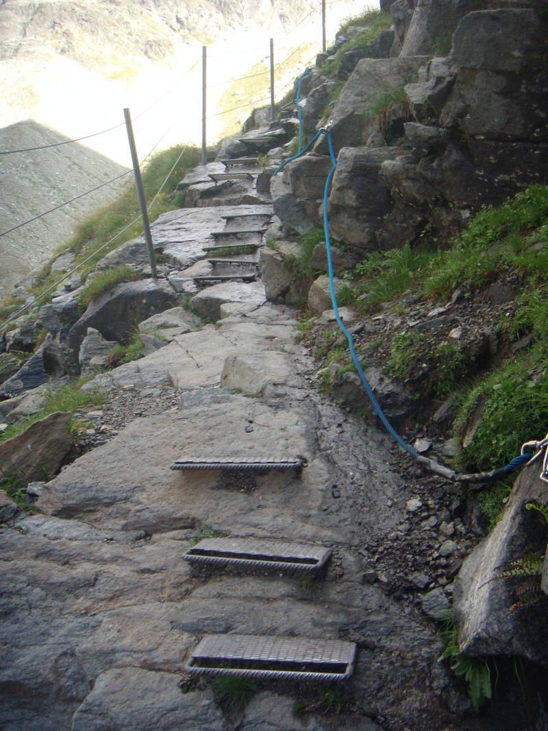 Ora si piega a destra seguendo per un breve tratto il corso del vallone, salvo poi abbandonarlo per iniziare una ripida salita su una modesta balza di rocce e terrazzi erbosi, attrezzata con scalini metallici ed alcune corde fisse (utili in caso di neve o ghiaccio, altrimenti superflue).