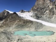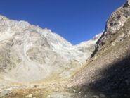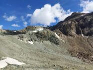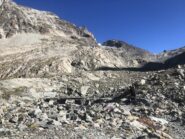 Tra detriti prima, e poi su una fascia rocciosa si raggiunge il bordo della morena sopra il lago glaciale del Col Collon, con a destra le pendici di Punta Kurz, e a sinistra la Becca d’Oren. Ora non conviene proseguire per il Col Collon 3114 m (croce visibile alla sponda opposta della conca con il lago), ma piuttosto si inizia a salire gradualmente a destra su dei dossi morenici (presenti ometti e tracce di sentiero, in assenza di neve), puntando in diagonale ascendente alla sella tra il pendio/crestone N/NO e la Verge.