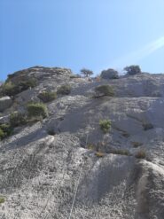 Ottimo calcare grigio a gocce e buchetti, chiodatura varia, da ravvicinata a lunghetta, soprattutto al primo spit.