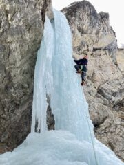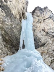 Cascata ancora in buone condizioni, la parte alta è adesa alla roccia e non si vedono fratture orizzontali. Si lavora, quasi sempre, in aggancio e si scarica bene sui piedi. Nonostante gli innumerevoli passaggi, mantiene una bella verticalità.