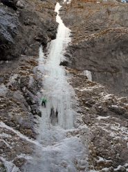 La cascata si trova subito dopo “La spada nella roccia”, sulla sponda opposta della valle. Bella colata di rara formazione, che purtroppo nella parte alta risente parecchio dei rialzi termici, scollandosi velocemente. Soste attrezzate per la discesa.