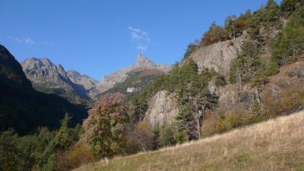 Si prosegue a piedi prendendo una strada sterrata che parte in leggera discesa e passa a valle del villaggio di La Voella, si continua lungo questa strada pianeggiante che porta verso il torrente Chalamy, e in 10 min. si arriva sotto la prima falesia.