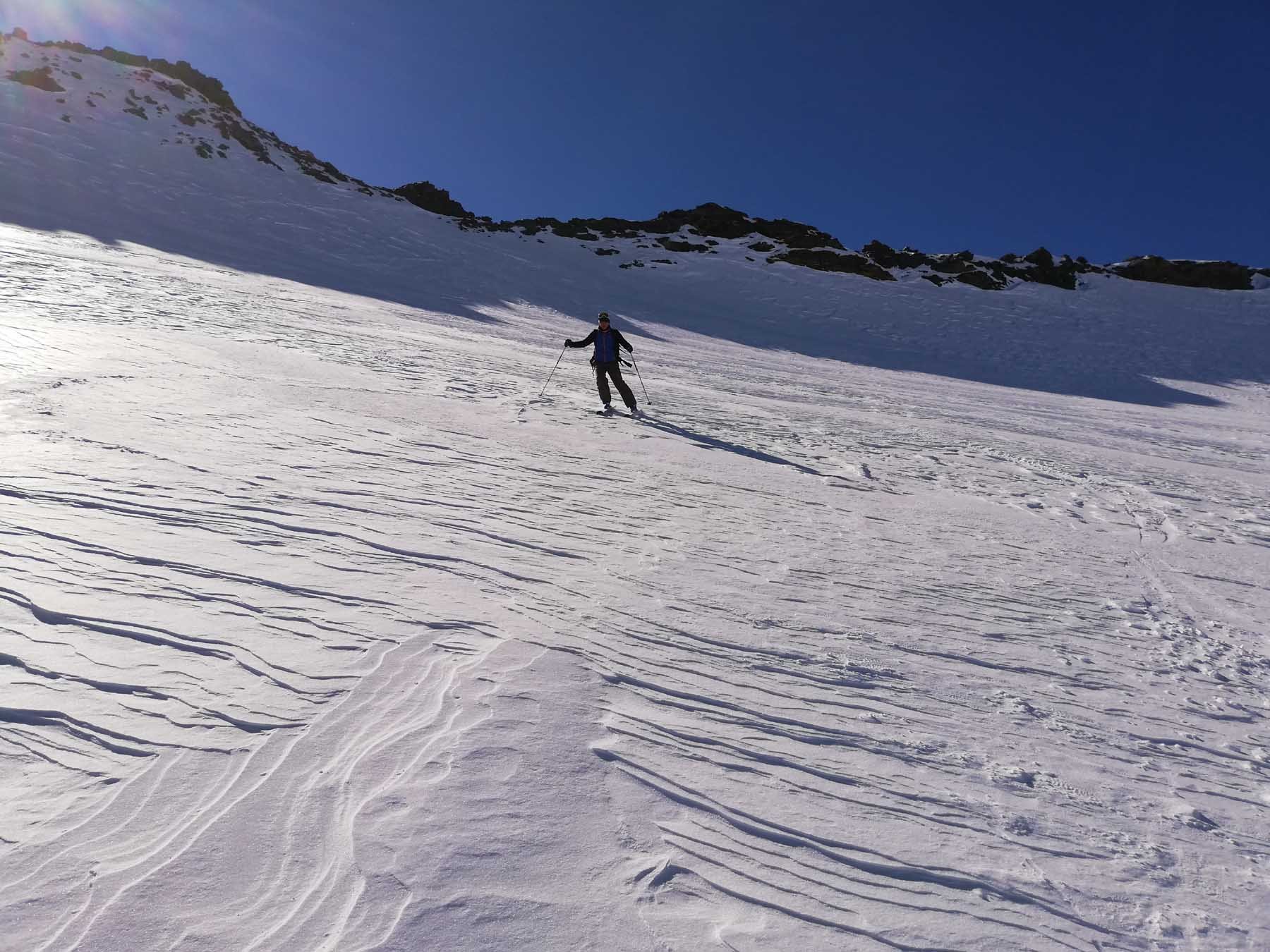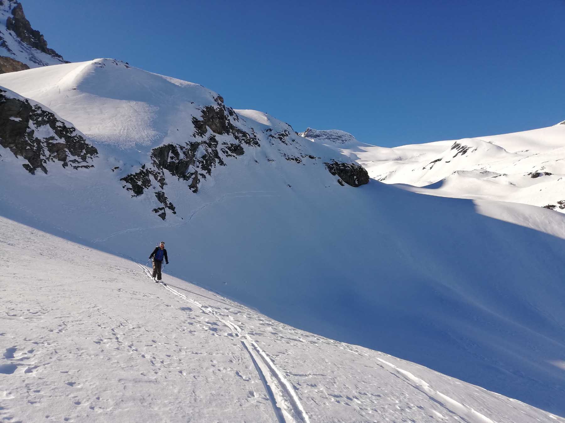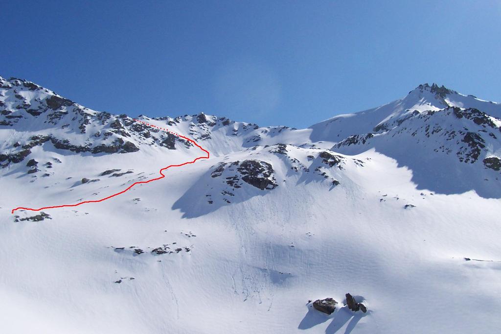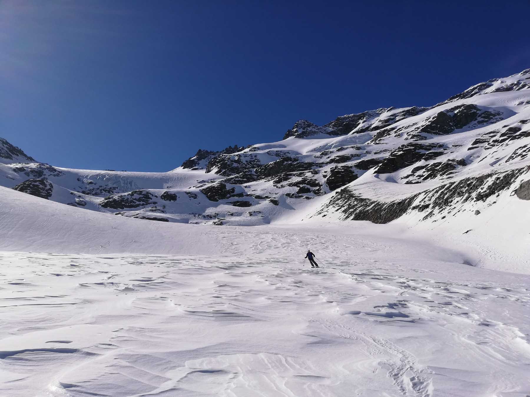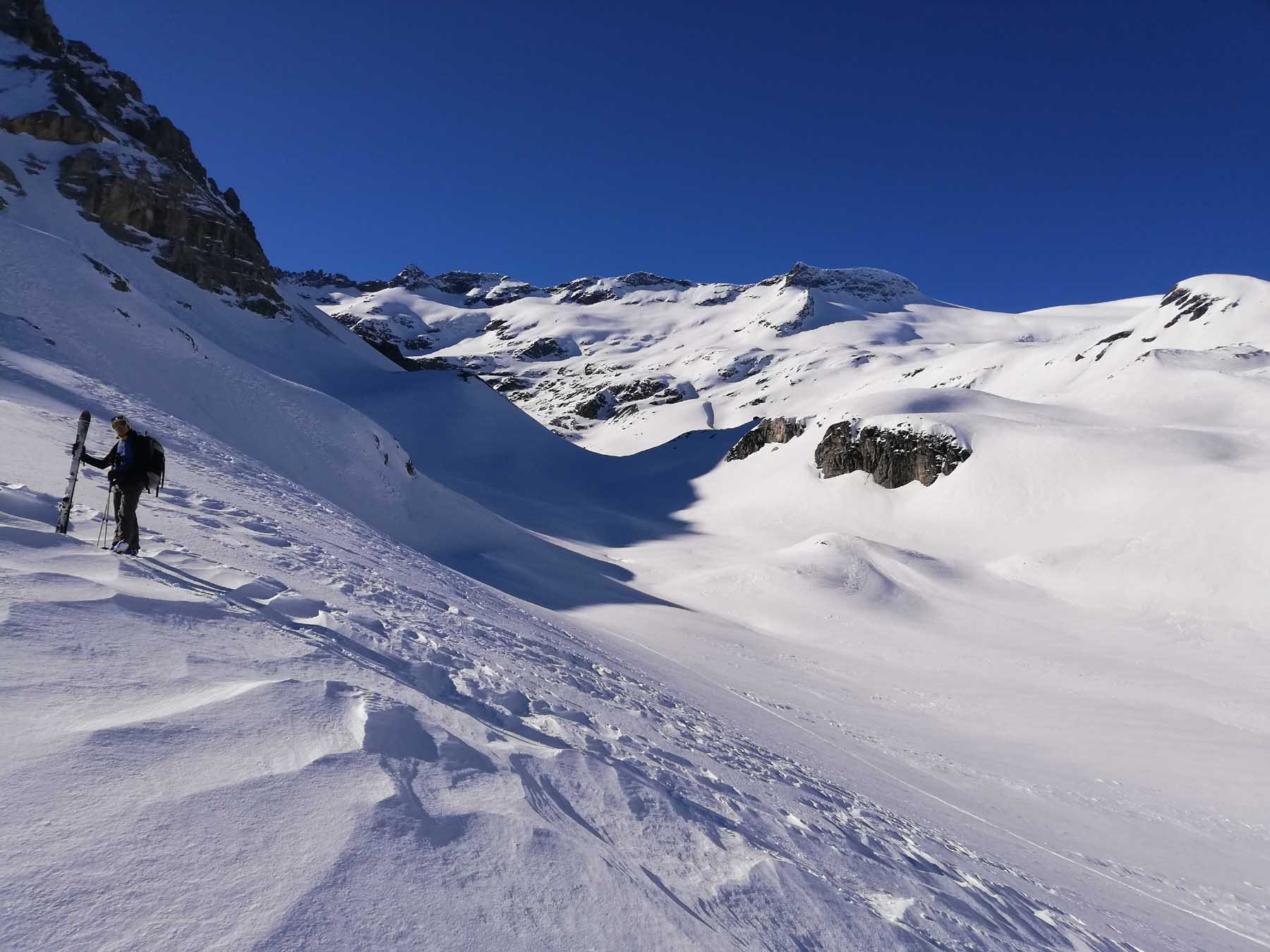 Al ritorno, per non dover spingere nei falsipiani, dalla comba al di sotto del Refuge de la Fournache conviene ripellare fino al dosso 2487 dal quale passando a Plan Sec e poi sulle piste o lateralmente ad esse, si scende comodamente ad Aussois.