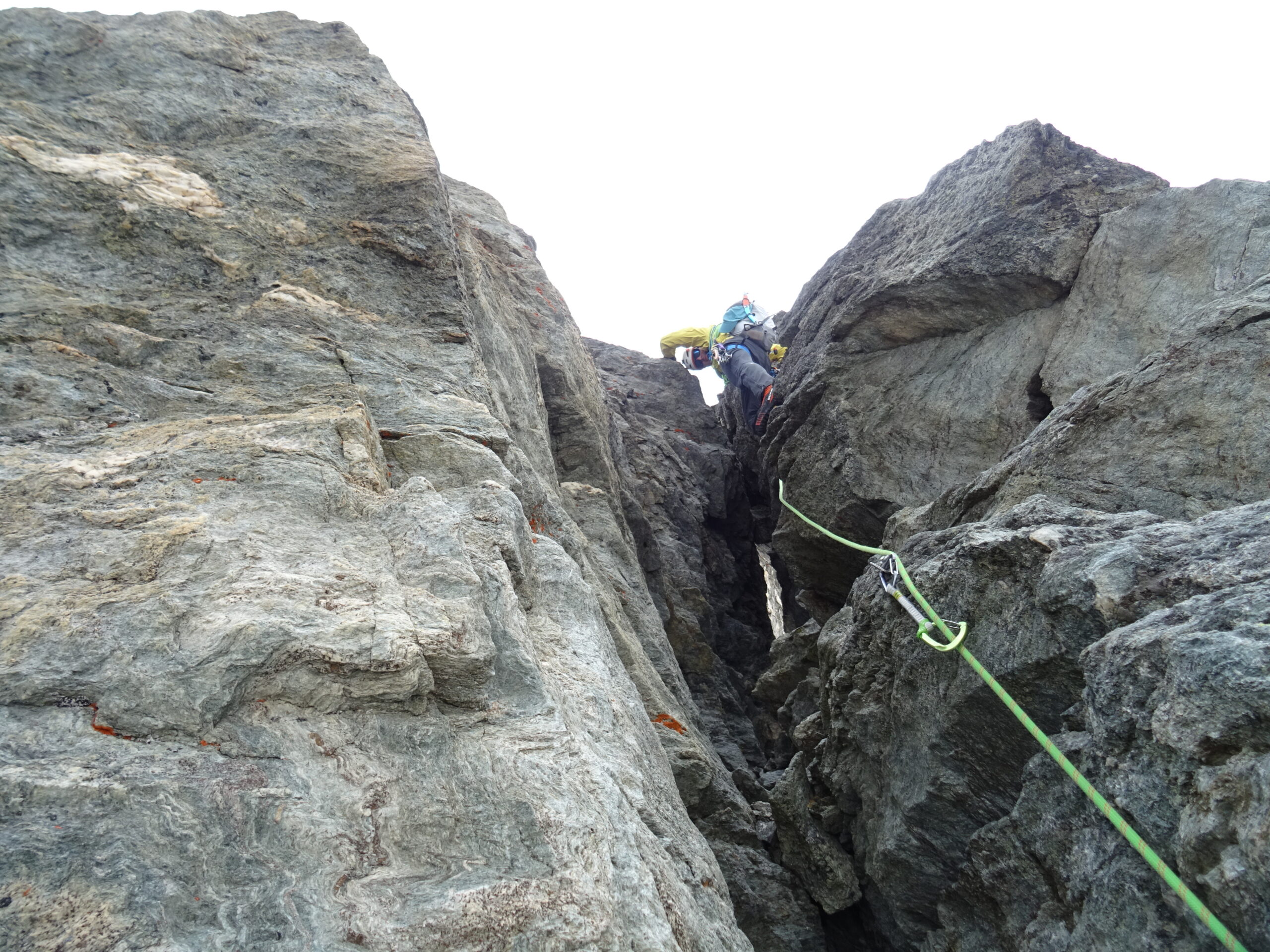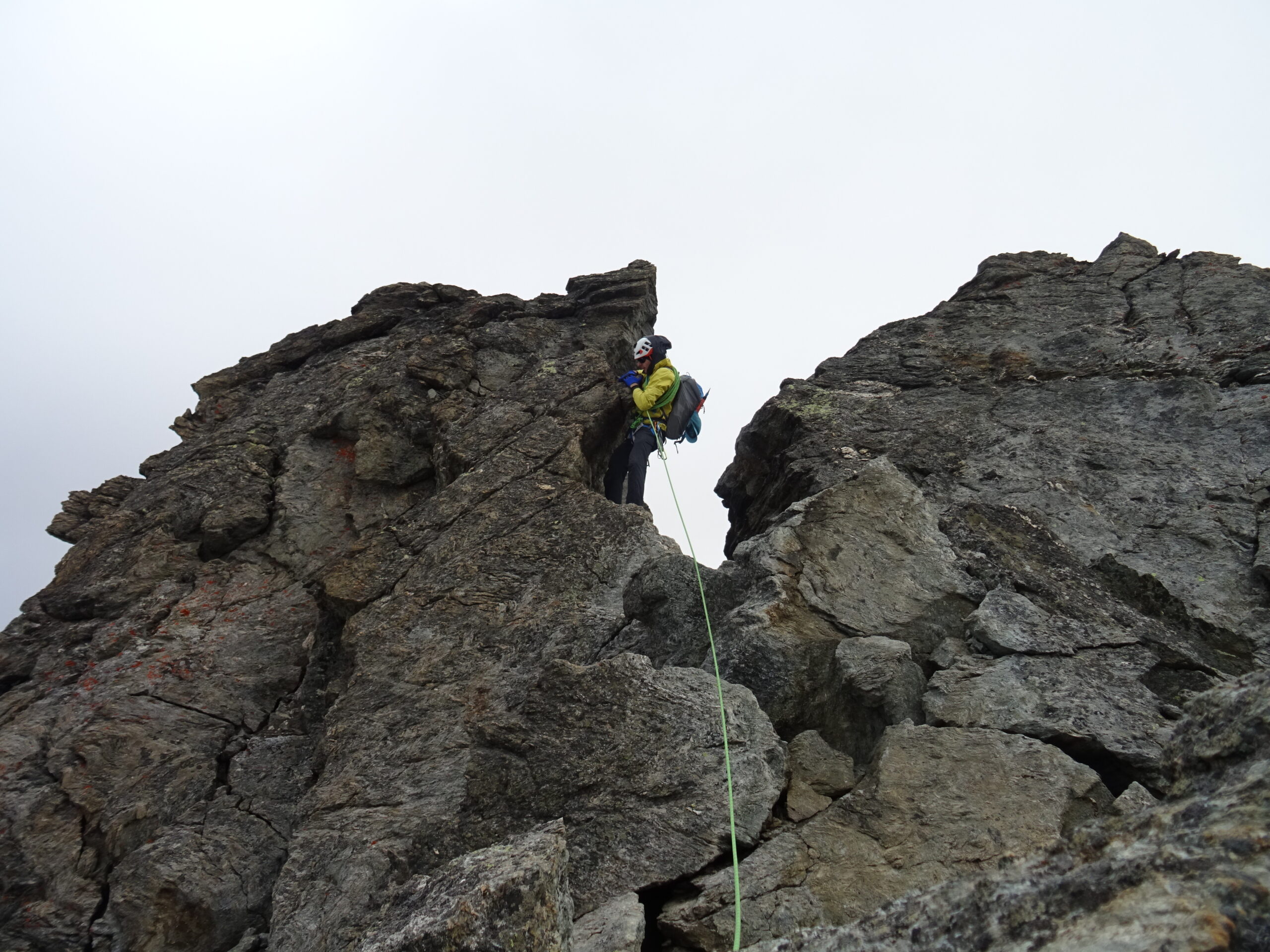 Iniziare passando tra due grosse lame di roccia e proseguire su cresta esposta ma pressoché orizzontale, fino ad una breve disarrampicata lato W che porta alla base di un salto verticale. Salire prima lato E (IV) e quindi lato W, per tornare sul filo. Superare un tratto facile ma molto affilato e quindi spostarsi lato E fino alla base di un evidente diedro rosso-giallastro. Salire il diedro (IV) e quindi proseguire lato W per qualche metro fino a riprendere il filo. Passare un tratto affilato (preferibilmente lato W) e raggiungere un intaglio alla base di un torrione affilato e delicato, dove sulla dx si notano gli evidenti segni di un crollo del 2018. Salire sul filo (IV) prestando attenzione alla roccia delicata, quindi traversare lato W tra lame di roccia fino ad una terrazza, lato W. Una calata di 10m permette di scendere al terrazzo sottostante e di continuare lungo la cresta. Alla base della prima grande punta, ci si sposta lato W fino alla base di un evidente camino, con partenza verticale (IV+), quindi si prosegue e si esce a dx. Ci si cala di 20m sullo spigolo fino alla base della 2° torre. Si traversa lato W per qualche metro, si risale una placca che permette di tornare sul filo dopo un passaggio leggermente strapiombante (IV). Raggiunta una terrazza, si risale la bella parete sovrastante (IV) e si esce a dx fino a raggiungere il filo del gendarme. Calarsi di 15m sul versante opposto. Proseguire passando nel passaggio del “buco della serratura”. Proseguire in cresta fino a trovare la 4° e ultima calata, che permette di scendere un breve saltino strapiombante. Proseguire in cresta fino ad un passaggio in traverso in leggera discesa (IV), che permette di accedere alla base della Pointe de Labby, che si raggiunge con ultimi facili passaggi.