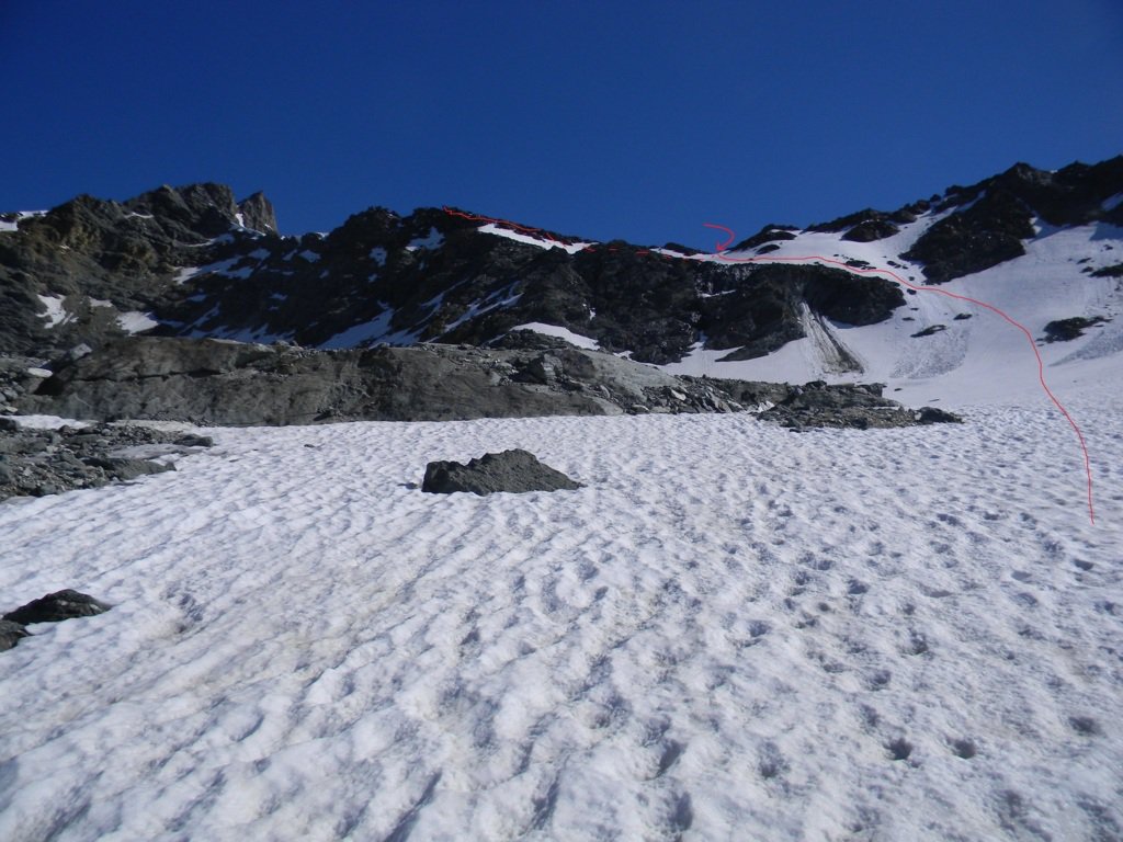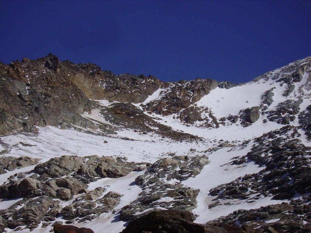 Variante di salita (PD): a inizio stagione, con ancora abbondante innevamento, è possibile salire direttamente alla breccia fra anticima Sud e cima dal versante E per un evidente canale (100 m 45°/50°).