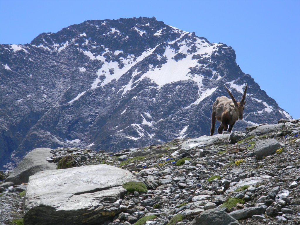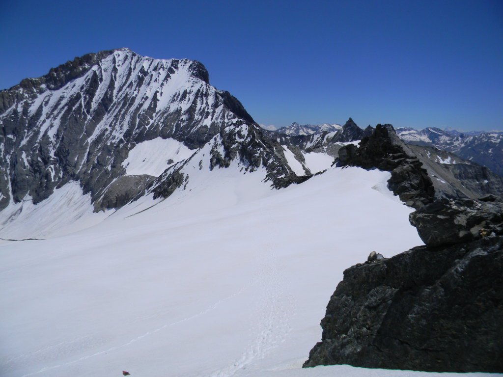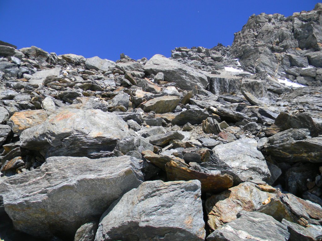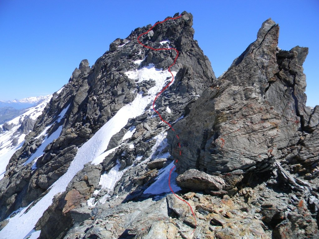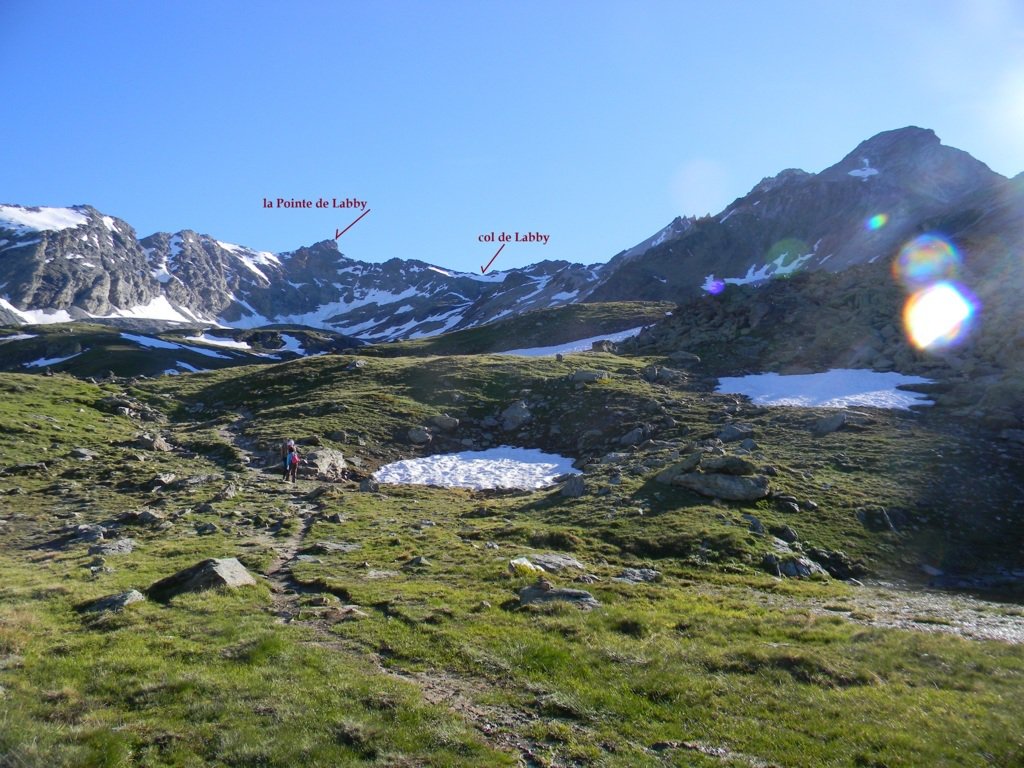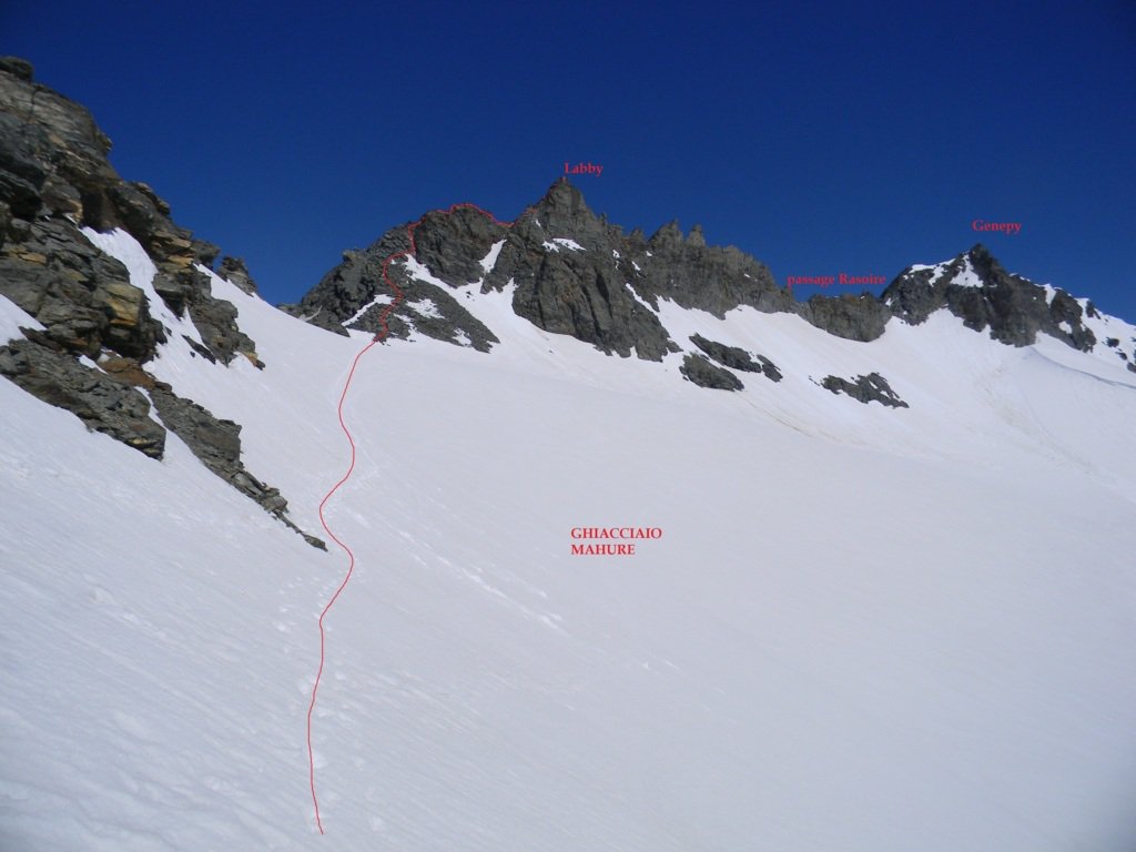 Aggirarlo sulla sx e salire sul ghiacciaio, con una lunga diagonale verso destra poco ripida ci si porta alla base di una breve rampa (30°) che con decisa svolta a sx porta in breve al col du Labby m 3328 (4h), scendere sul ghiacciaio de la Mahure e traversare verso nord fino alla base dell’anticima della pointe de Labby, risalirla al meglio (traccia) su grossi sfasciumi fino alla base rocciosa dell’anticima, traversare sul versante nord (esposto) fino alla breccia che precede la vetta, il traverso può presentare placche di ghiaccio, quindi in breve su roccette si arriva in cima (5h).