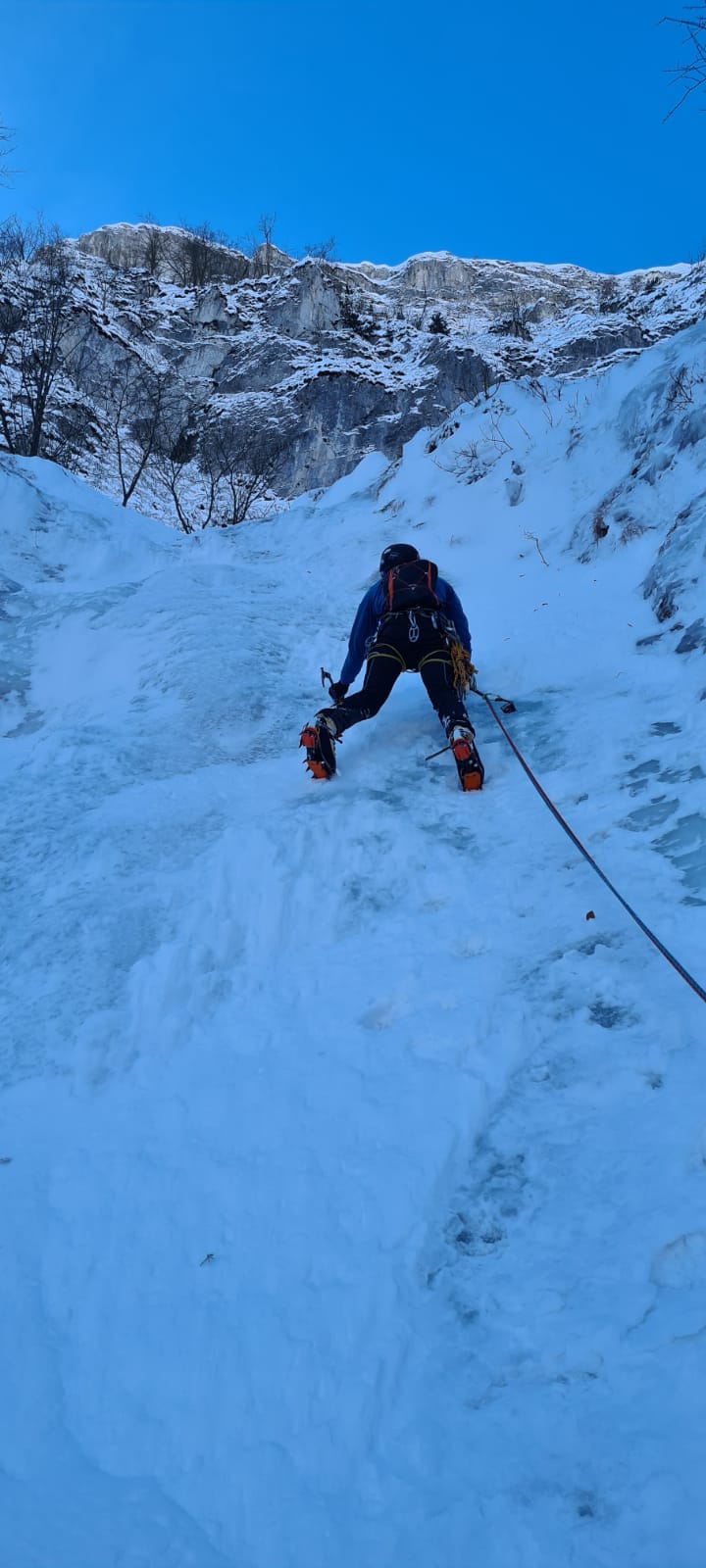 Di qui si può scendere , oppure con un traverso delicato (dry tooling ) collegarsi all’altro ramo della cascata per poi uscire ,salendo un ultimo muro di 5 mt , sul pendio soprastante. Sosta su albero dx orografica .Discesa in corda doppia (1 da 60 mt ) e poi nel canale fino alla base della cascata .
