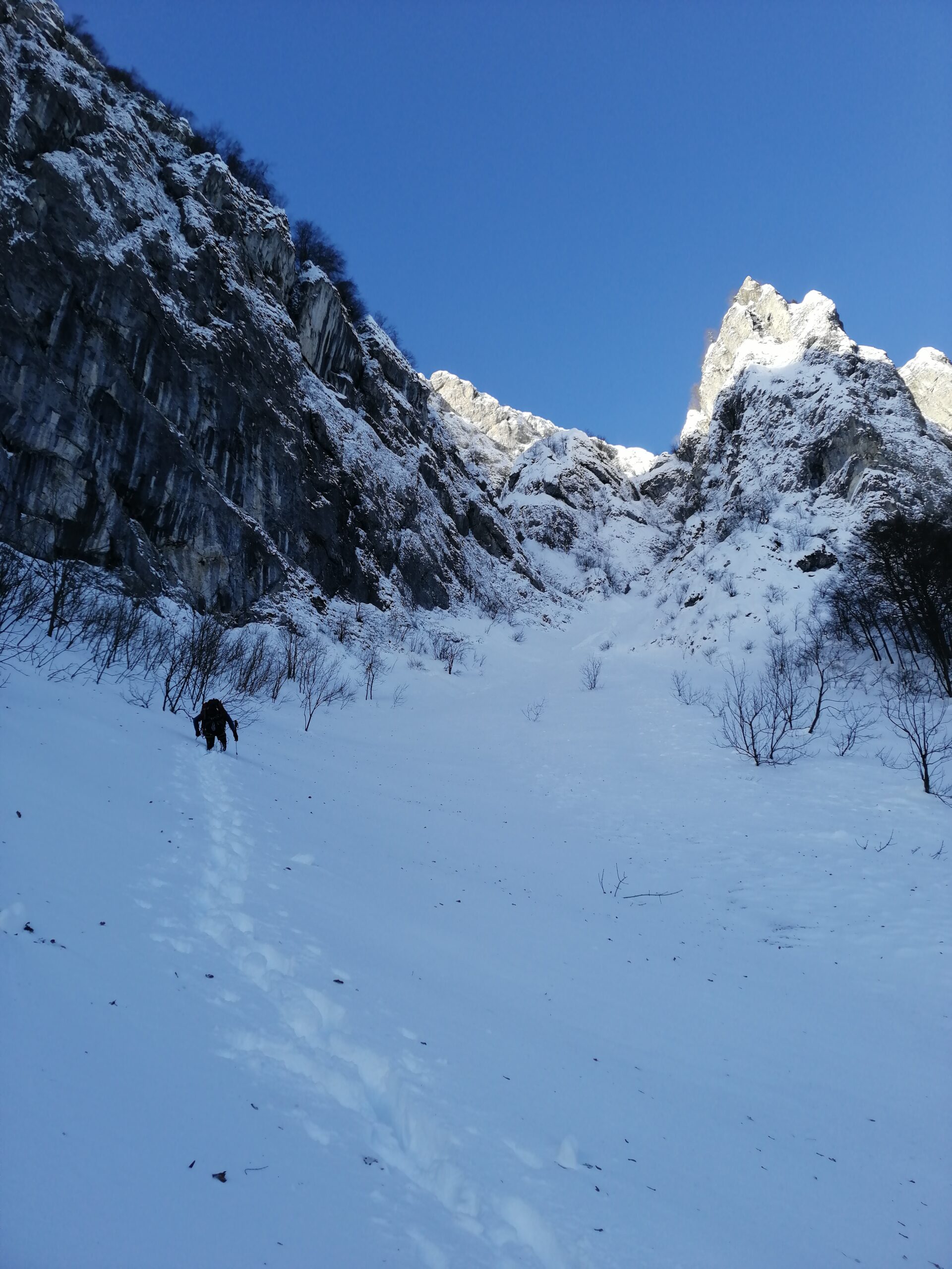 Seguire ora il canale per arrivare all’attacco delle colate di ghiaccio (L’avvicinamento in base alle condizioni del manto nevoso, può richiedere anche tre ore).