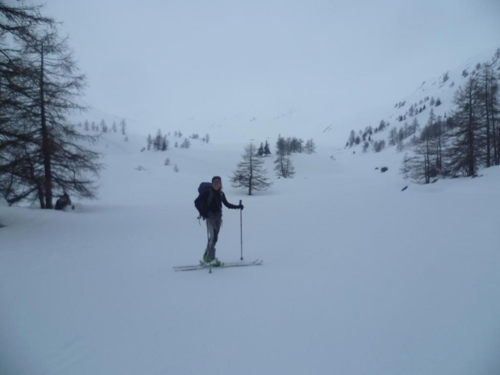 La meteo non prevede nulla di buono e decidiamo per la Labiez vista la quota non elevata e la recente nevicata che ha riportato un po’ di neve anche a quote basse. Si parte e si torna dal piazzale sci ai piedi su poca neve che basta appena a coprire la poderale. Il tratto nel bosco si fa bene in salita ma per la discesa un po’ di neve in più non sarebbe male. All’uscita dal bosco e nel bel vallone superiore parecchia neve ma tutta crosta non portante. Arrivati sopra l’ultimo alpeggio nel tratto ripido sotto la cresta e abbandonato per peggioramento del tempo e visibilità nulla. Discesa faticosa con poca visibilità in alto su crosta non portante e nel bosco si cerca di limitare i danni.