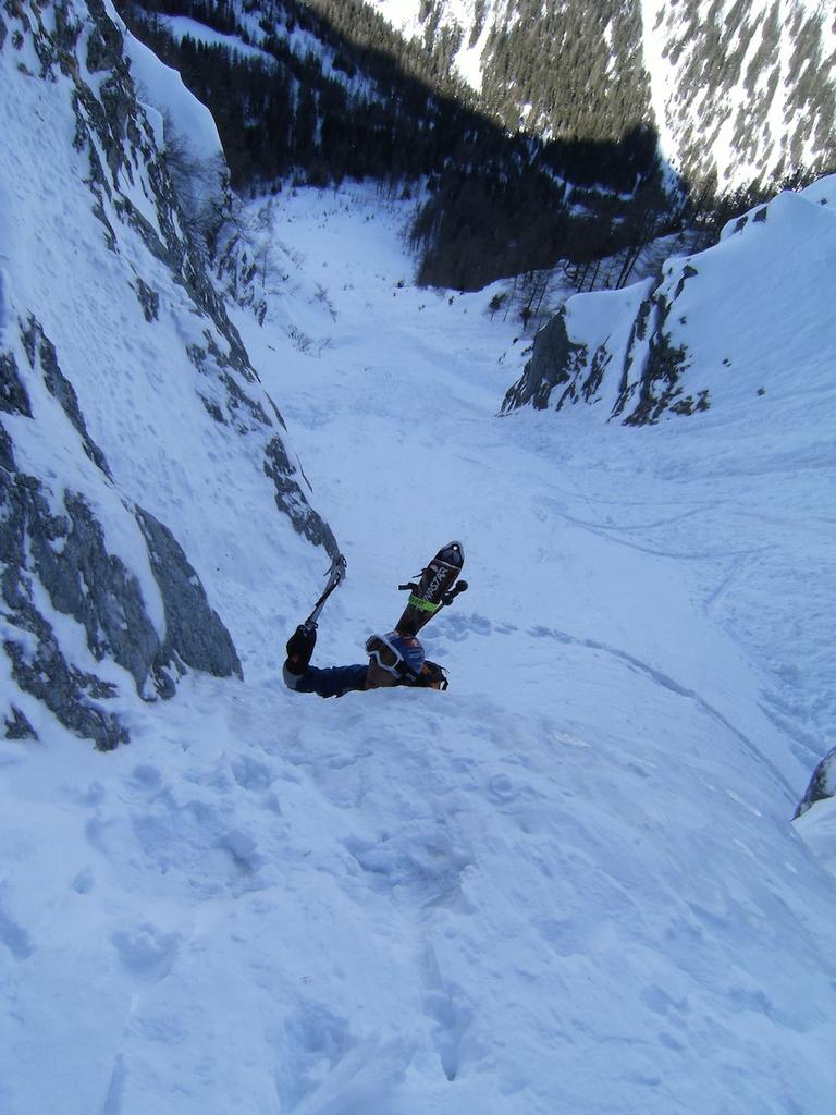 Discesa in condizioni, anche se il vento ha lavorato un po. Globalmente sicura, un paio di piccoli accumuli sono presenti a metà canale comunque ben coesi con il manto sottostante. Neve generalmente farinosa più o meno profonda a seconda del trasporto eolico, comunque sempre bella,a tratti impegnativa fisicamente. La cascata d’accesso è ridotta all’osso si supera agevolmente sia in salita che in discesa. Il giovane Feis l’ha addirittura saltata con gli sci.