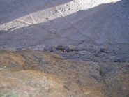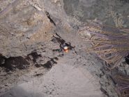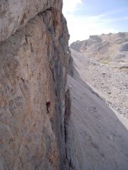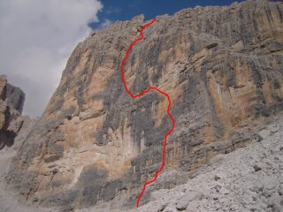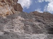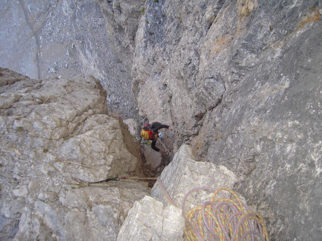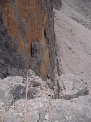 N.B. Alla fine del tiro chiave e del traverso verso sinistra, non sostare subito ma alzarsi nel diedro successivo fino alla buona sosta seguente (3 chiodi). Non proseguire per il diedro successivo al chiodo con cordino e moschettone!!! Abbassarsi poi (friend camalot incastrato) a sinistra per alcuni metri, V-, fino ad atraversare successivamente (1 chiodo) su facile cengia a sinistra (sosta, 2 chiodi e 1 friend incastrato). Il secondo di cordata può scendere a corda tesa (moschettone in sosta).