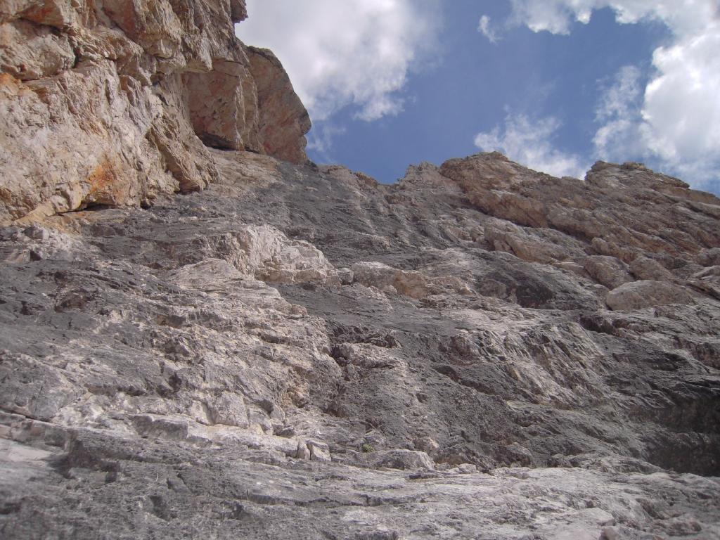 Seguire verso destra (faccia alla parete) la cengia e di seguito la cresta fino alla forcella fra il Lagazuoi Nord e quello Sud (ometti e tracce), passaggi di I°-II° su sfasciumi. Attenzione!! Arrivati alla forcella seguire sentiero di guerra e infine il ghiaione slavato fino all’attacco (0.40h)