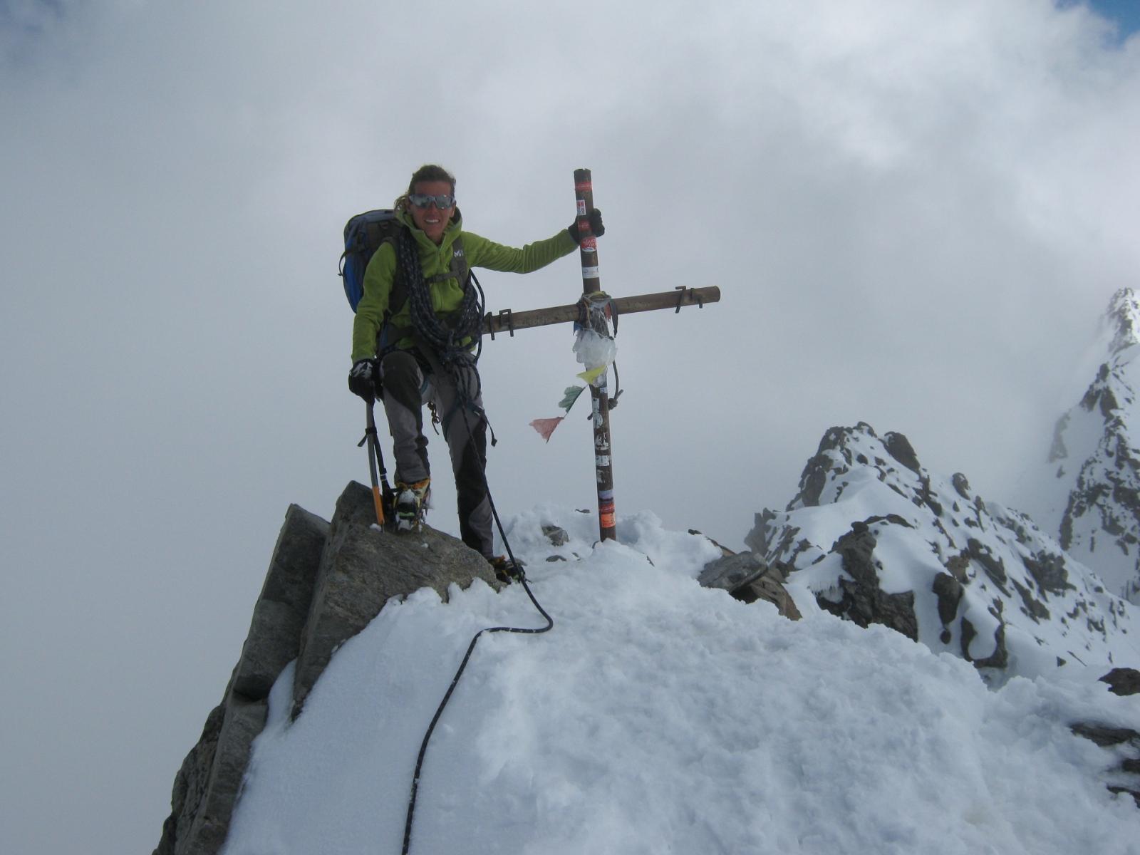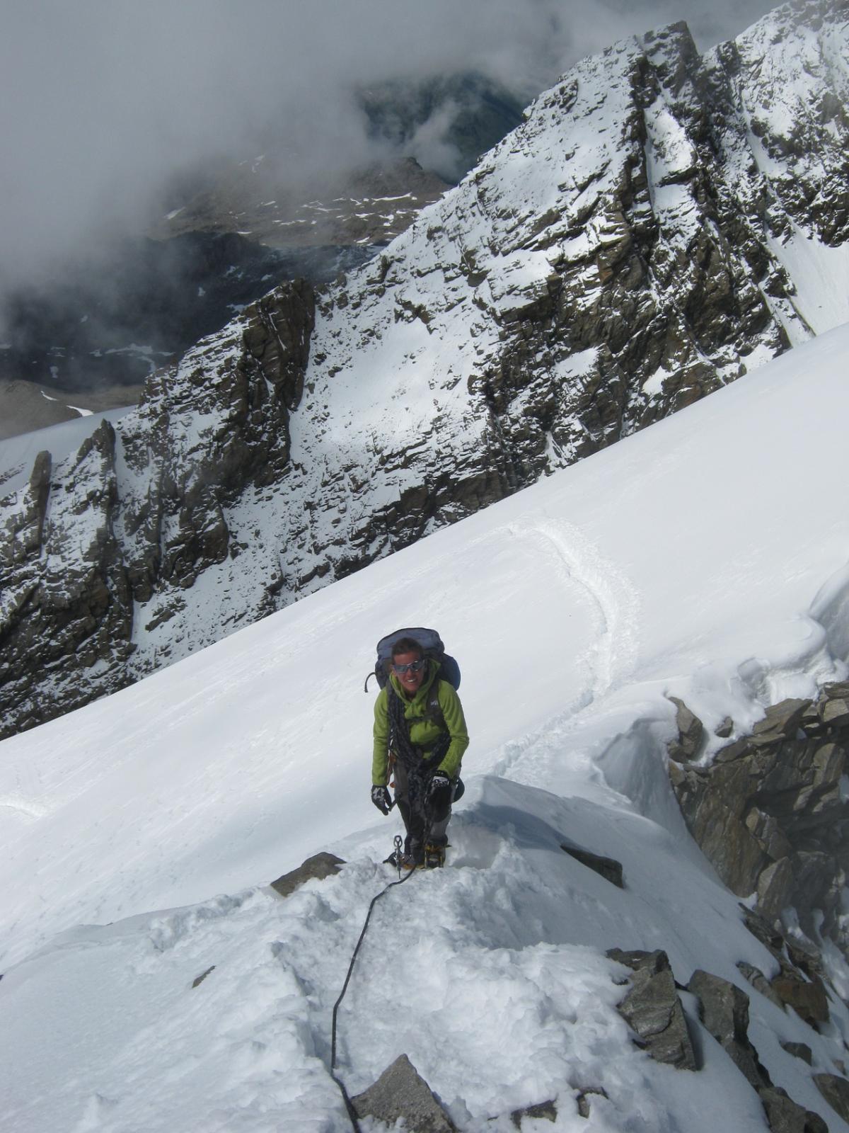 Saliti a Hohsaas in funivia alle 7,30 per una “2 giorni” sulle cime svizzere. Percorsa la cresta ovest che, causa errore di percorso iniziale, abbiamo attaccato più in basso della via descritta, aggiungendo dislivello e sfasciumi. Parecchia neve recente, circa 50 cm. nella parte alta che, anche se un po’ molle, ha reso la via di salita secondo me un po’ più agevole della pietraia che c’è sotto. Arrivo in vetta con gran caldo e visibilità limitata dalla nuvolosità che saliva dal basso. Rientro per la via normale con un occhio verso i versanti sopra il Lagginhorngletscher, dove alcune scariche oggi hanno raggiunto la traccia di salita.