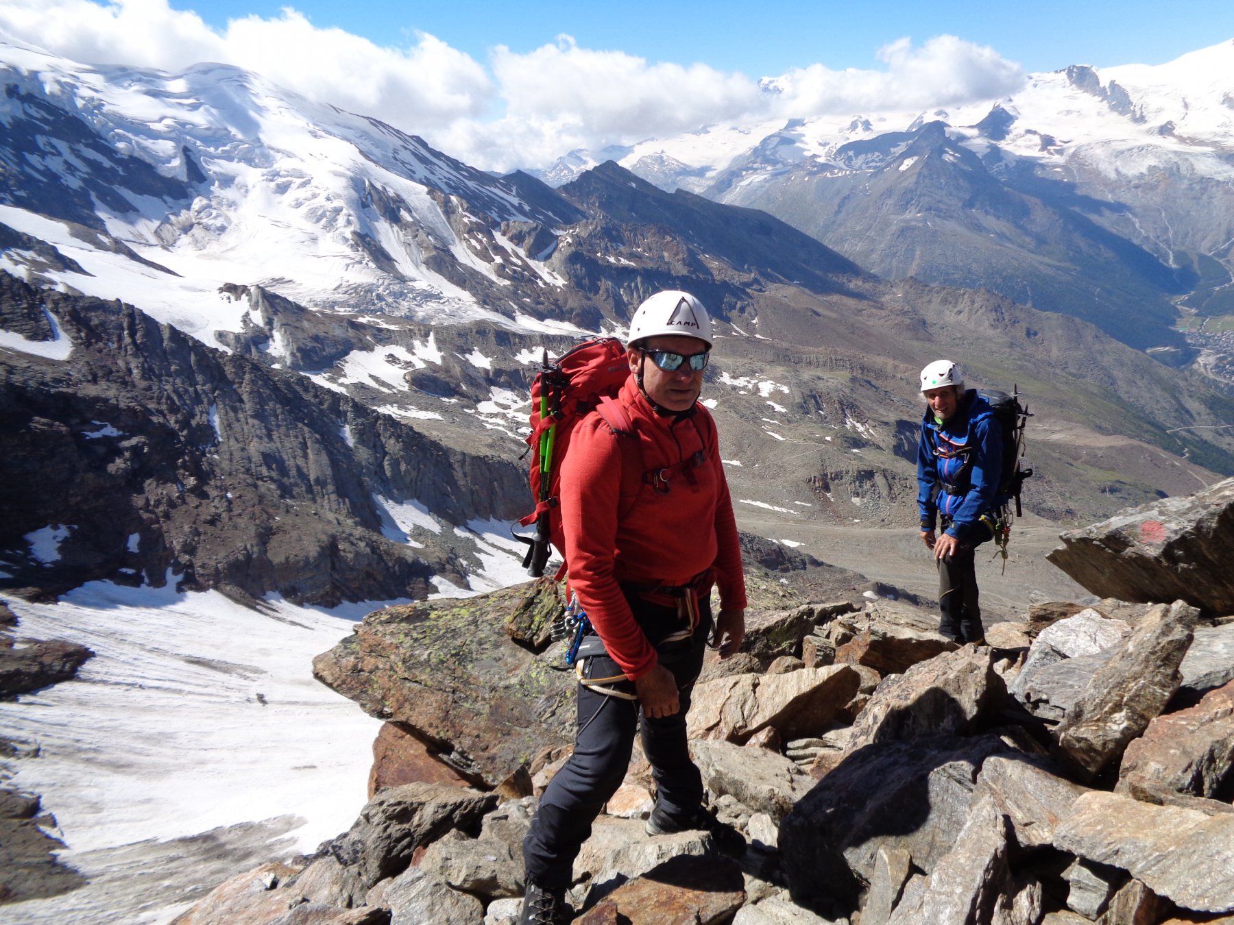 Sfruttando il pernottamento al Hohsass Hutte partiamo alle 5,30 dal rifugio e scendendo di circa 100 metri in direzione Nord e seguendo una buona traccia (nel punto piu esposta è presente un corrimano) raggiungiamo il nevaio sotto la N del Lagginhorn e da qui sulla cresta Ovest (quota circa 3350 metri). Saliamo la larga cresta rocciosa che non presenta punti esposti. Si sale con passaggi al max di II grado e nella parte finale (ultimi 80 metri) calziamo i ramponi per la presenza di ghiaccio. Terza e ultima salita della nostra 3 giorni Svizzera in una giornata con meteo splendido. (Pino, Mauro, Ivano e Massimo).