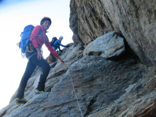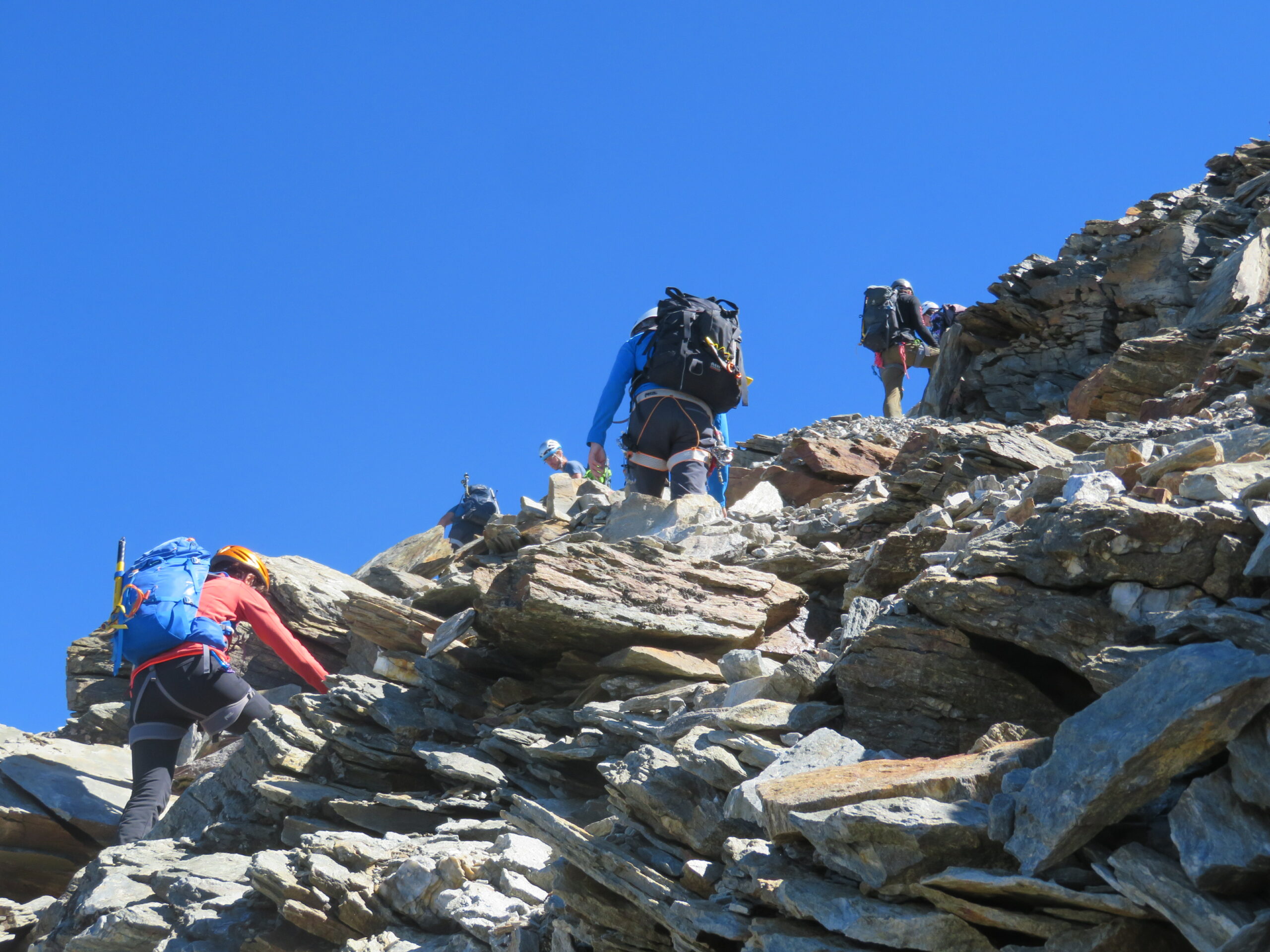 Caldo e pochissimo vento. Condizioni ottimali per effettuare questo itinerario. Tutta roccia, quasi niente neve e ghiaccio. Saliti da Hosaas con il traverso sul ghiacciaio, discesa lungo la cresta fino alla WeissmiesHutte e ripresa la funivia all’intermedia.