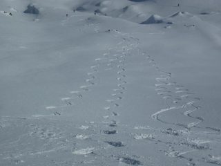 In Val Torta numerosissimi corpi valanghivi di medie dimensioni formatesi nella giornata del 25/02. Tutti gli scaricamenti erano sul lato rivolto ad occidente. Le nicchie di distacco erano tutte in corrispondenza delle variazioni di inclinazione del pendio proprio laddove le tensioni accumulate a causa dell’azione eolica erano maggiori. Molte delle valanghe avevano raggiunto il fondovalle; ed in una abbiamo supposto di aver ritrovato le buche degli estratti di ieri.