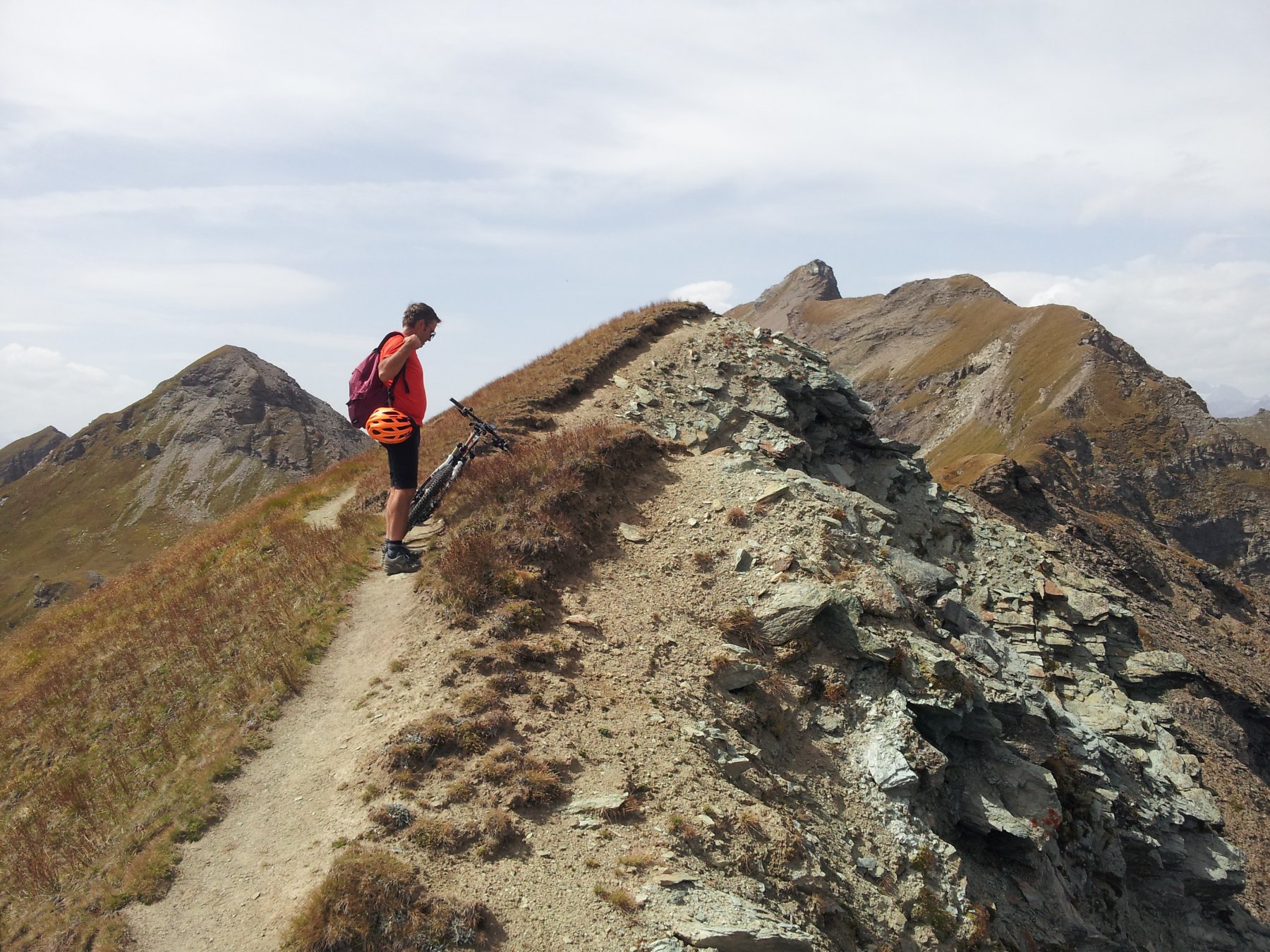 Si prosegue su comodo sentiero a mezzacosta e si raggiunge l’A.Palasina Sup. m.2420; si prosegue a spinta su sentiero (n°105, 40mt di dsl) fino al Lago della Battaglia m.2487 e superato un colletto si arriva in vista del Lago Pocia m.2518 che non si raggiunge ma si devia a destra su sentiero poco evidente fino a ricongiungersi col sentiero 105 (più ripido e non ciclabile); si pedala ancora per poco per lasciare spazio ad un po’ di portage fino al Colle Palasina m.2668 (60mt di dsl) magnifico punto per ammirare il gruppo del M.Rosa.