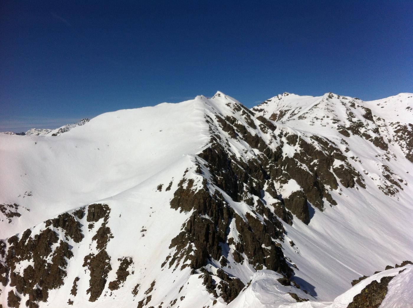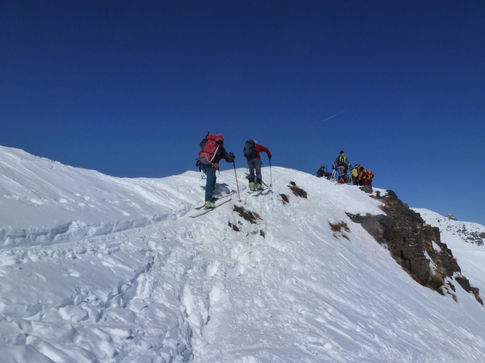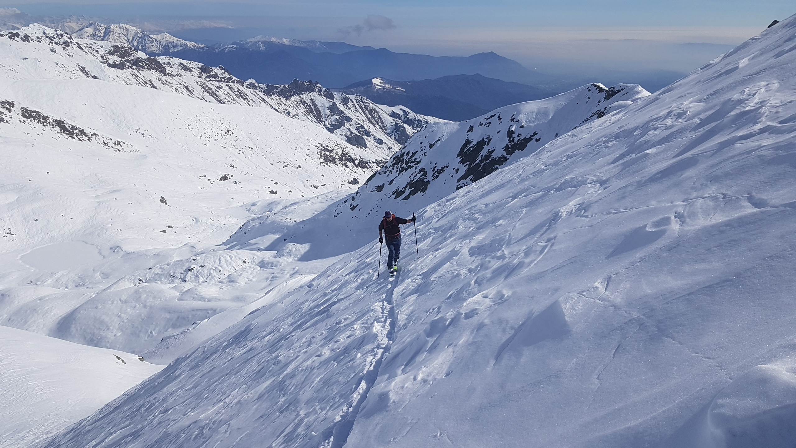 Si entra a Dx nel bosco seguendo le tracce del sentiero estivo per il Rifugio della Balma. Giunti al rifugio si continua a salire costeggiando il Lago Sottano. Non lasciandosi tentare dai ripidi pendii posti alla SX (salendo) ci si dirige lungo dossi verso una valletta che porta verso la Cresta Tirol. Risalito questo pendio più ripido si prosegue per la cresta che porta verso la cima.