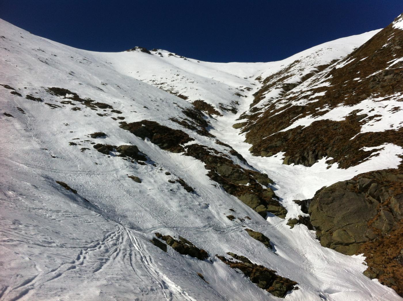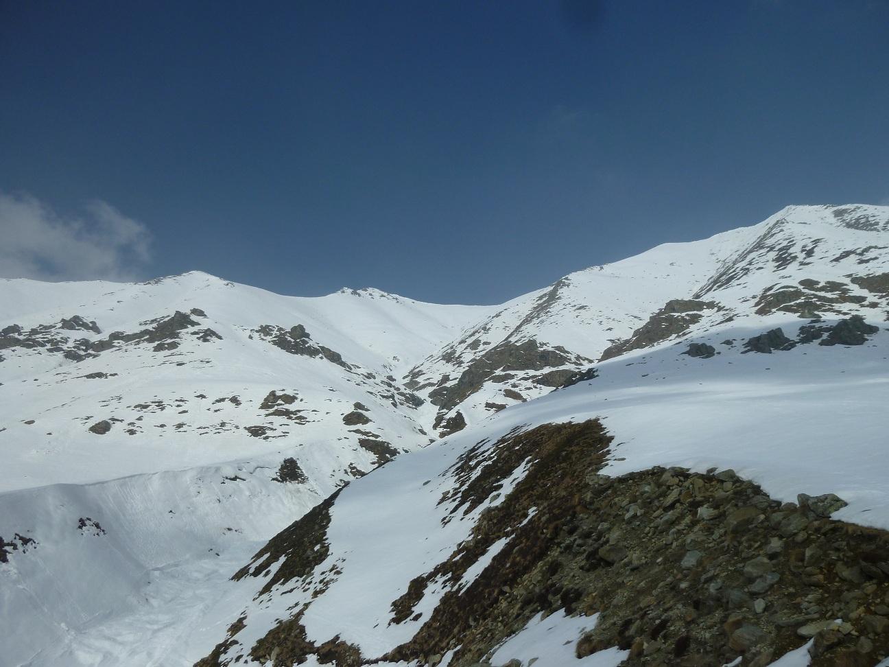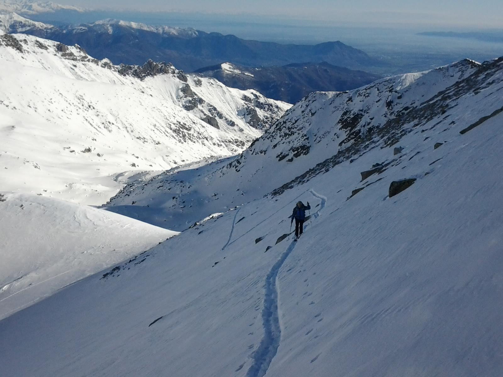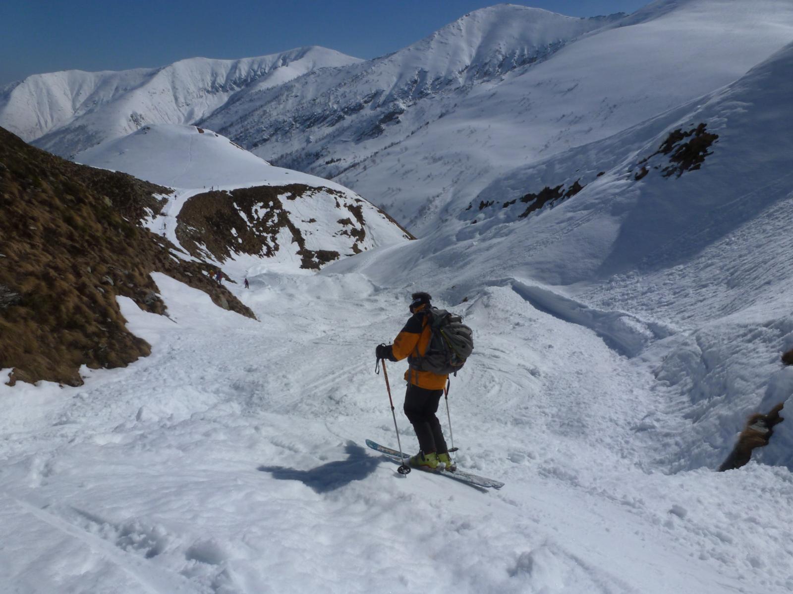 La discesa si effettua scendendo i ripidi pendii (Sud) che portano nel Vallone del C. della Rossa. La discesa prosegue lungo il Vallone omonimo.