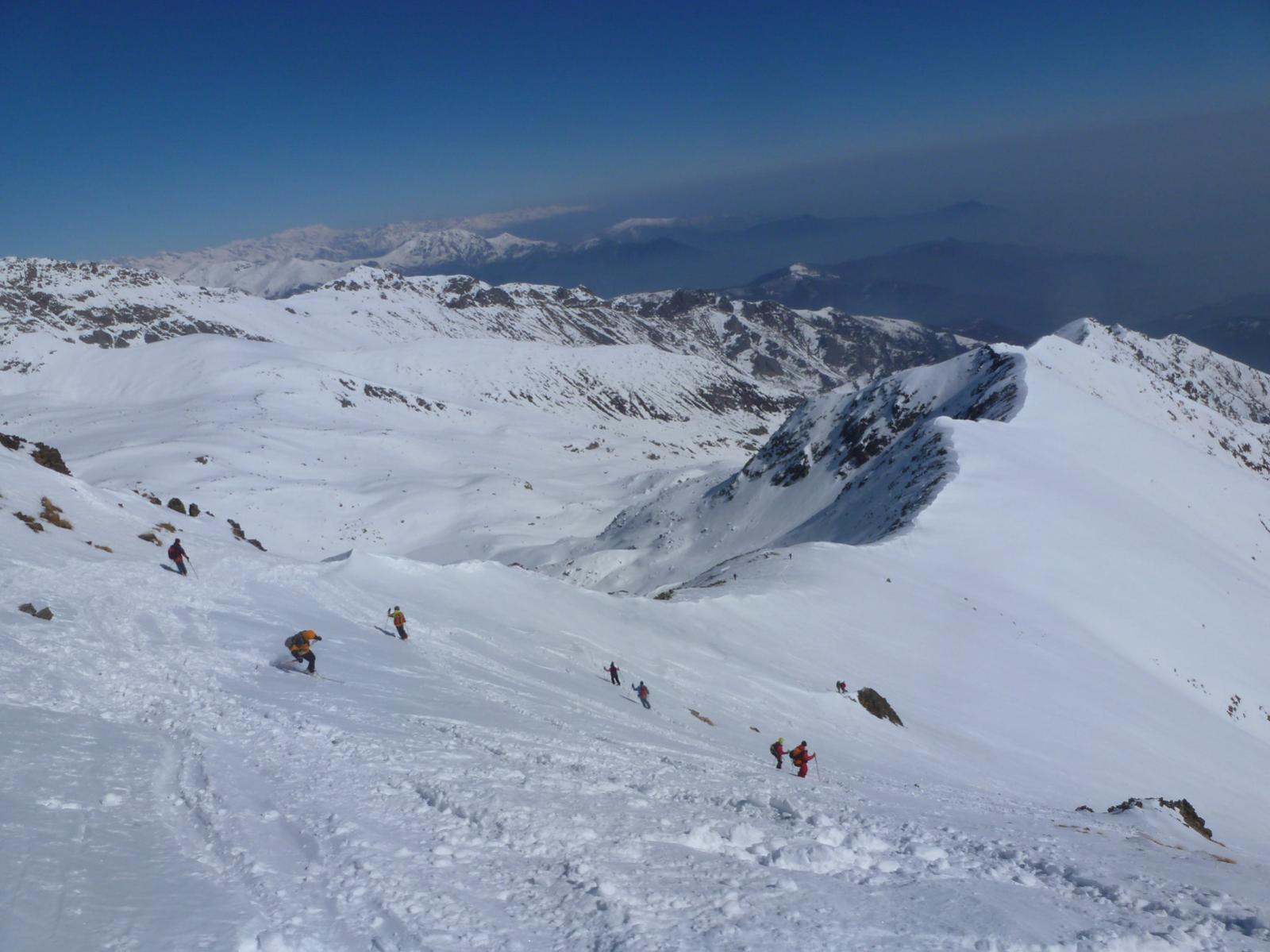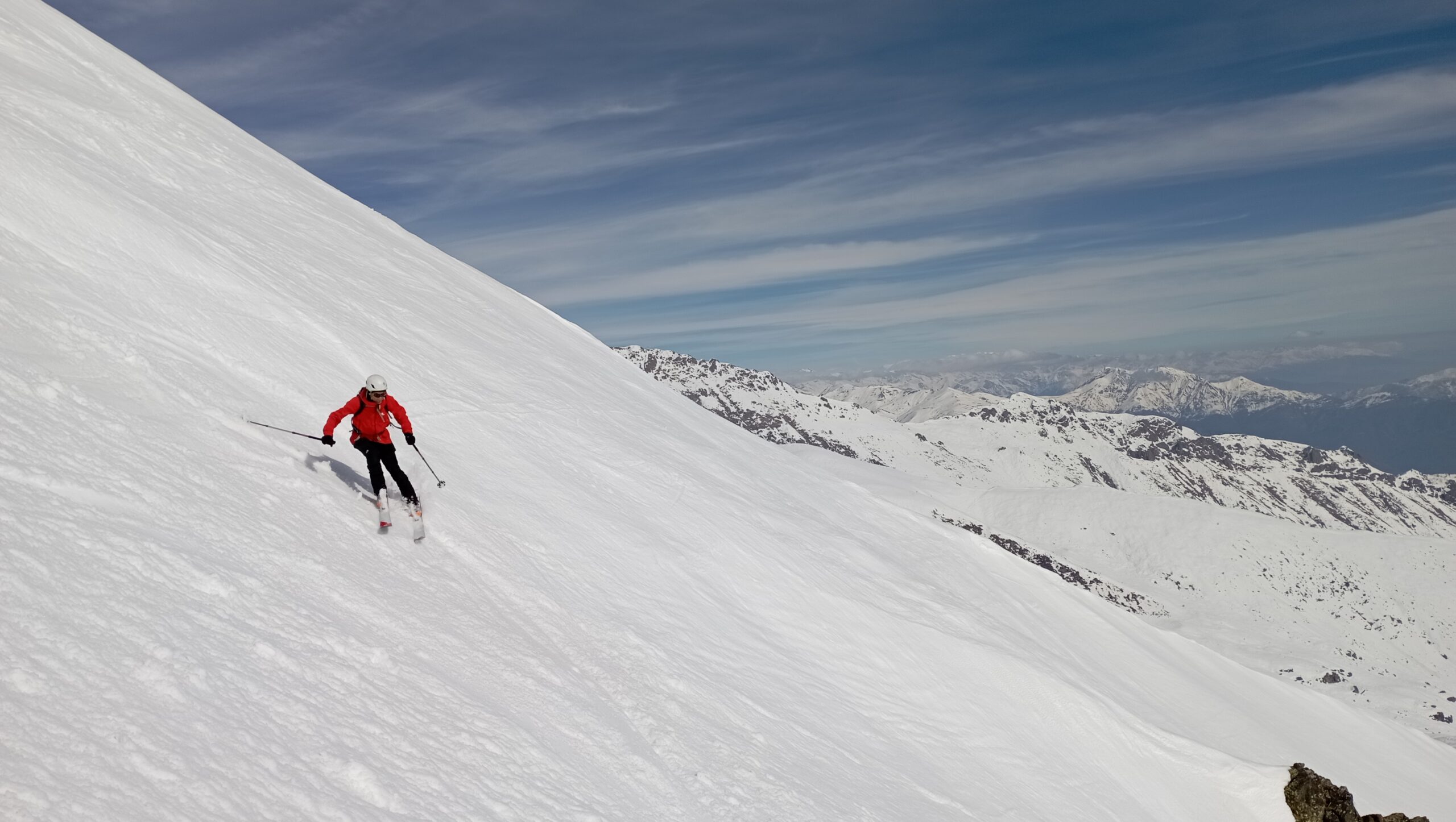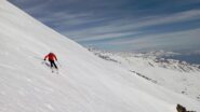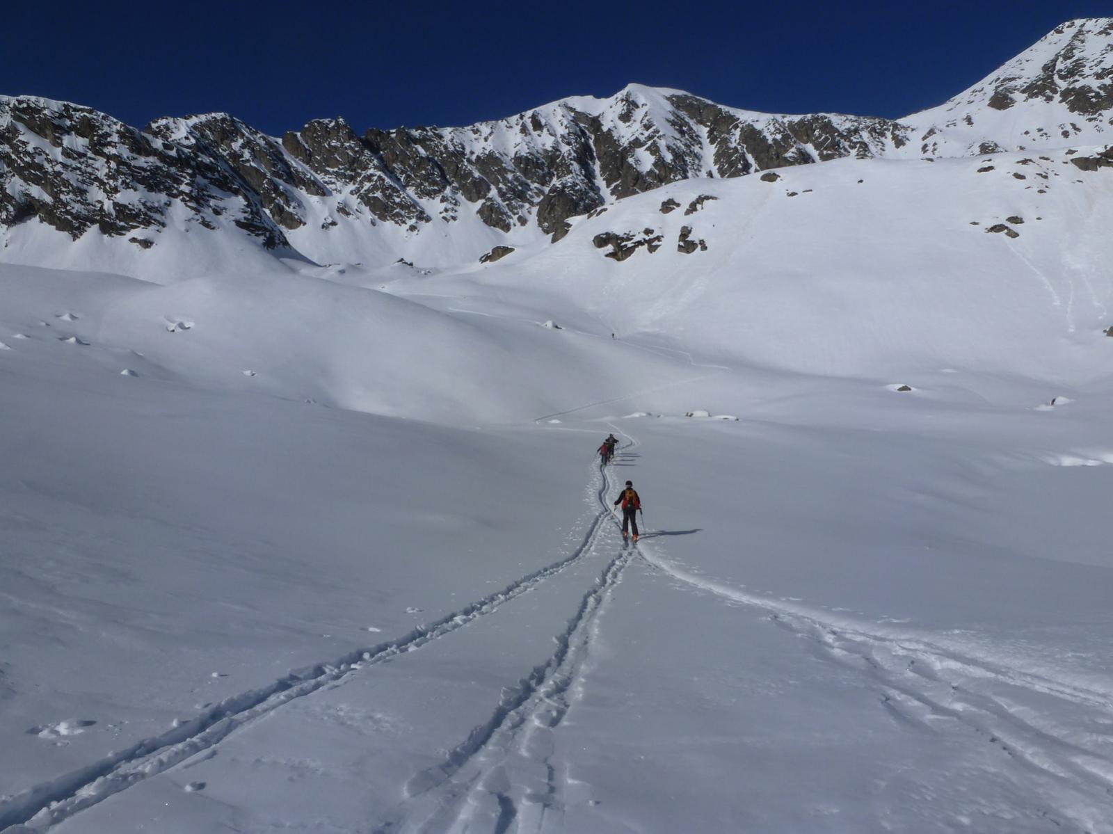 La discesa si effettua scendendo i ripidi pendii (Sud) che portano nel Vallone del C. della Rossa. La discesa prosegue lungo il Vallone omonimo.
