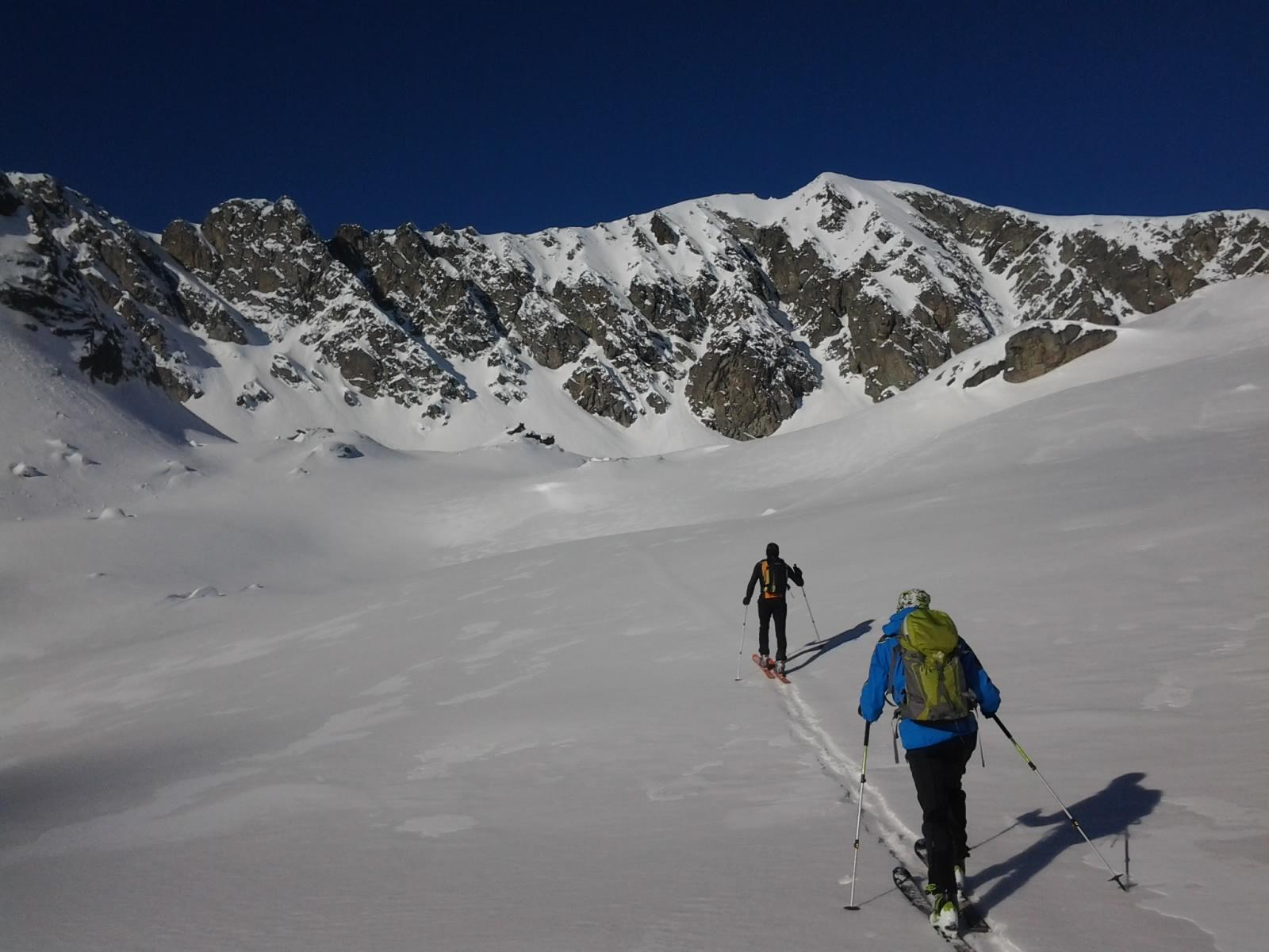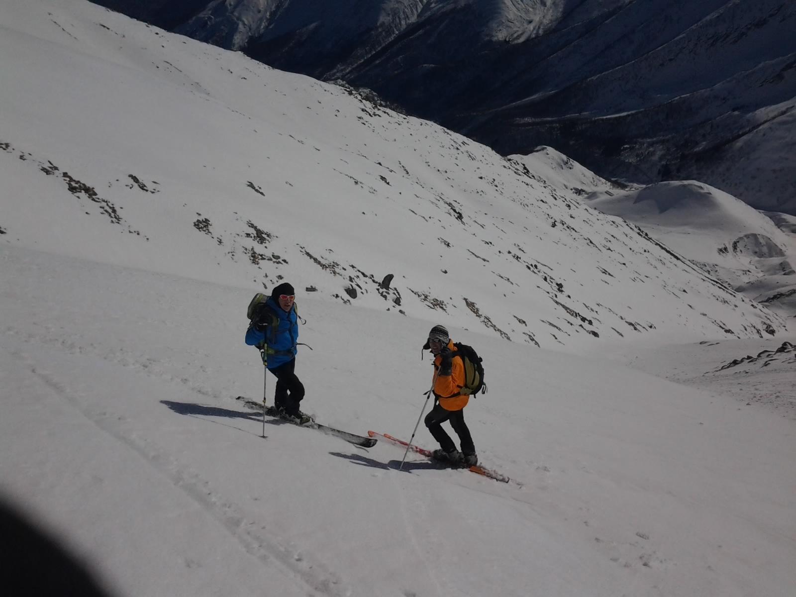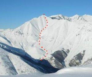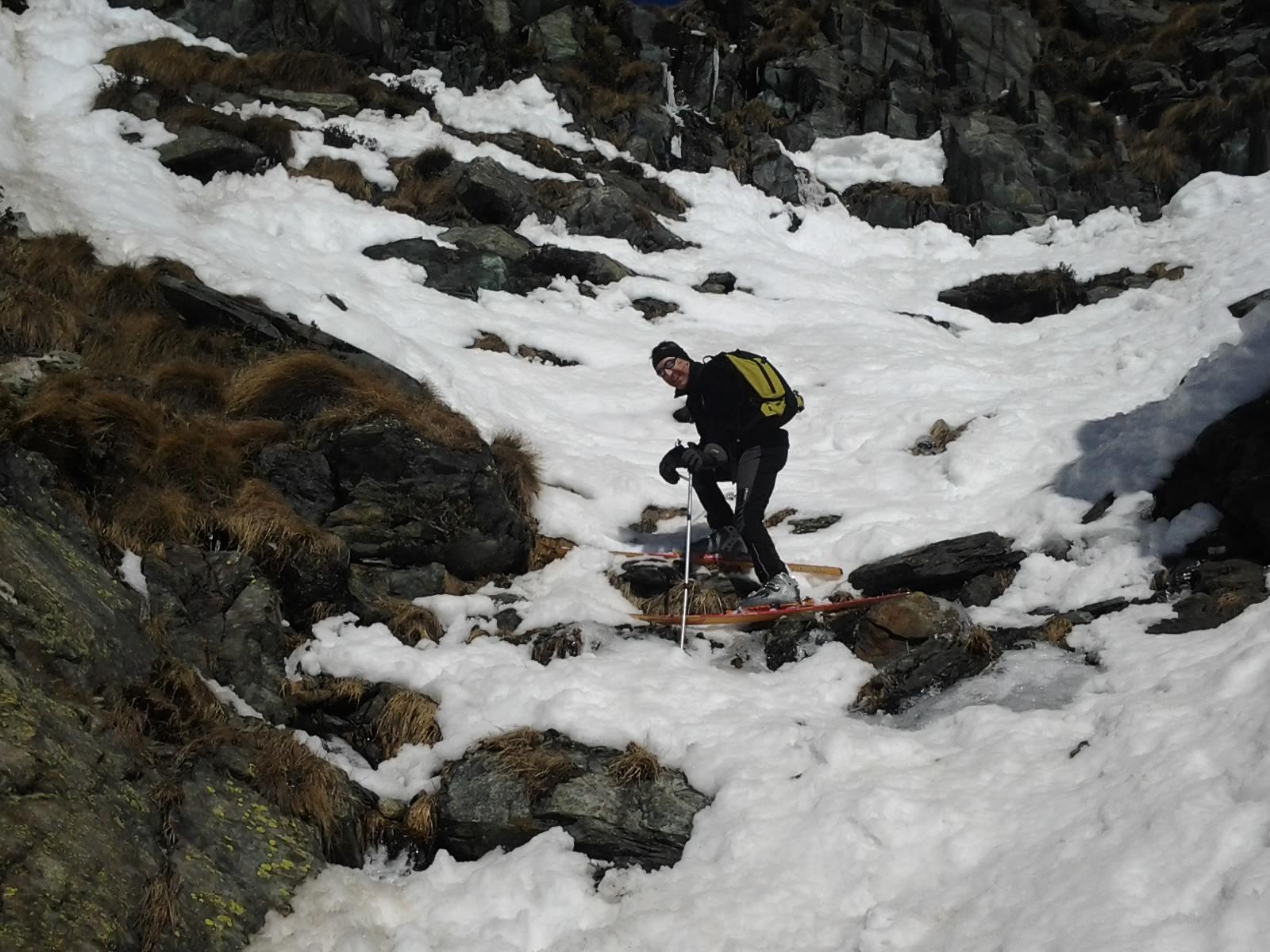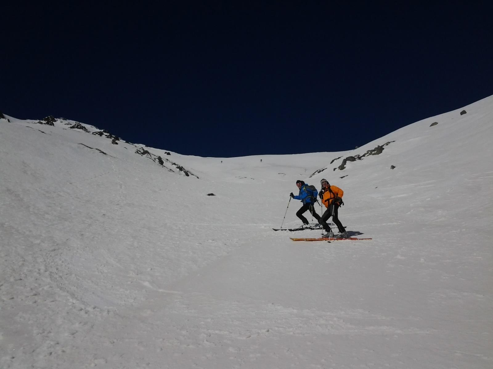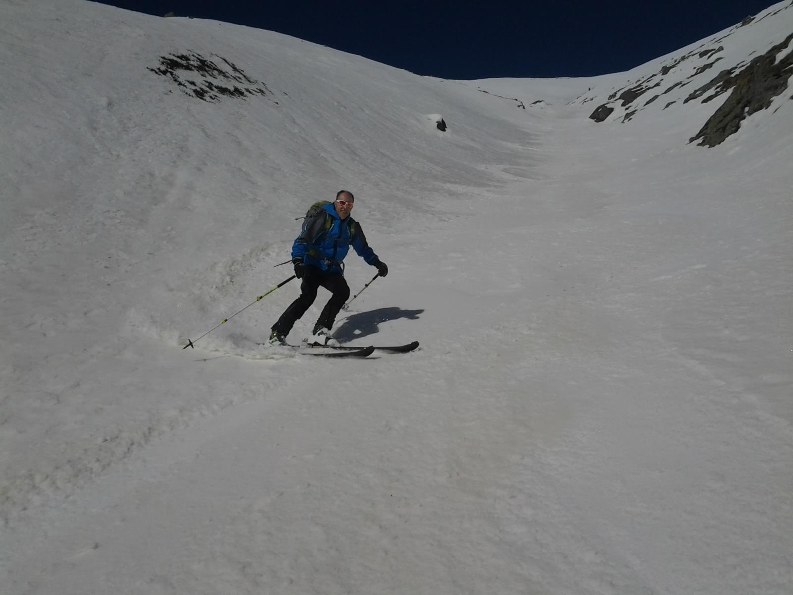 Discesa diretta nel canalone sud trovando neve portante ben sciabile. 800mt di discesa bella e ripida (max 40°). Verso la fine del canale si aggira un piccolo salto passando sulla sx (scendendo). Arrivo diretto sul guado della Palazzina Sartorio.