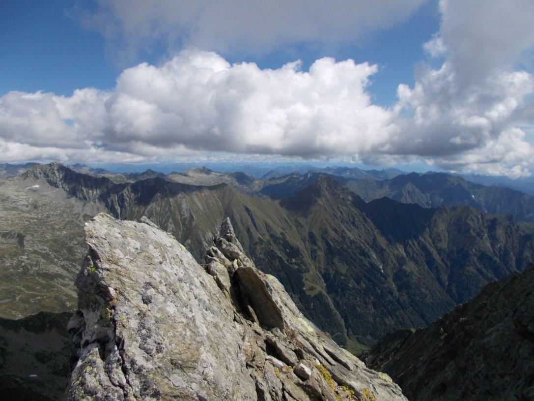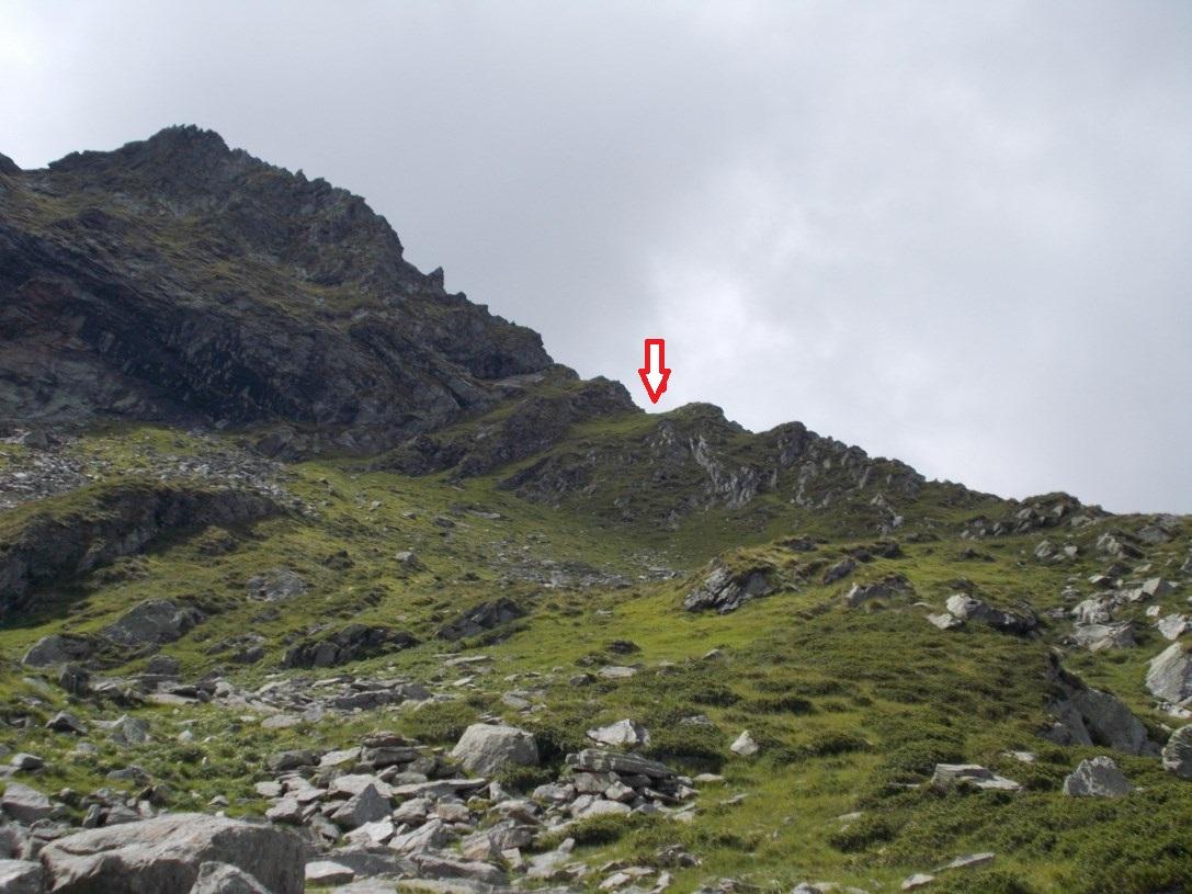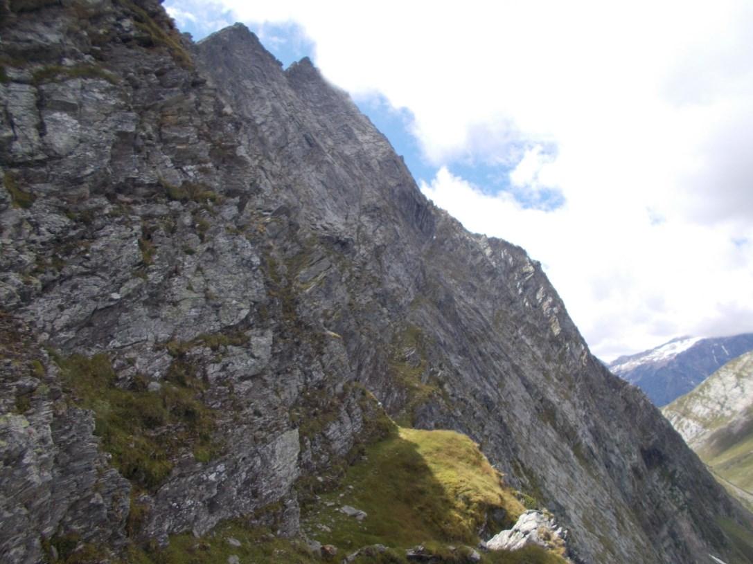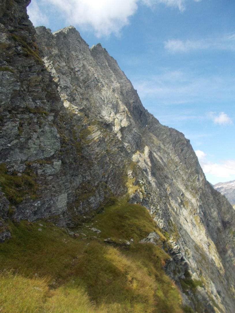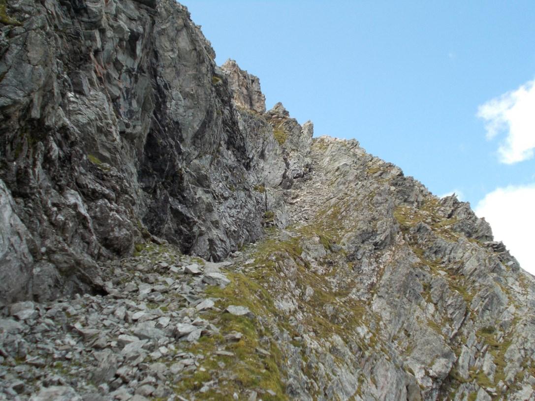 Raggiunta la cresta NE portarsi alla base della prima torre (quota 2597) da dove parte l’obliqua cengia Laida Weg.
