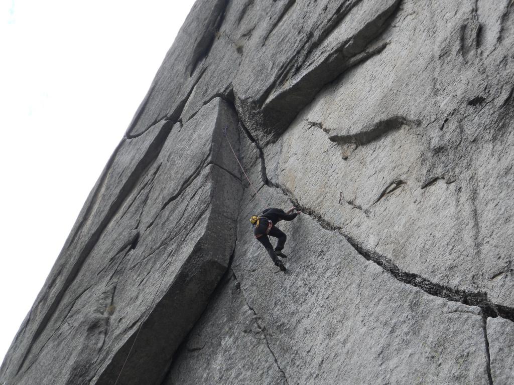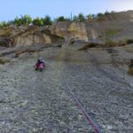 Breve corda per attraversarlo e poi una stretta cengia riattraversa tutte le placche in direzione della parete e dell’ultima corda che in breve porta all’attacco della via.