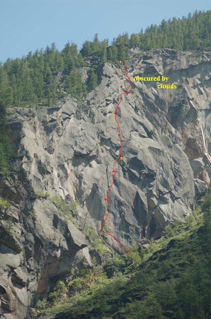 L3 in alto per entrare nel diedro ,poi blocchi sicuri sino ad un alberghetto.. (WC) poi camino complesso e fessure finali per arrivare in sosta tiro DOC 30mt,6b+