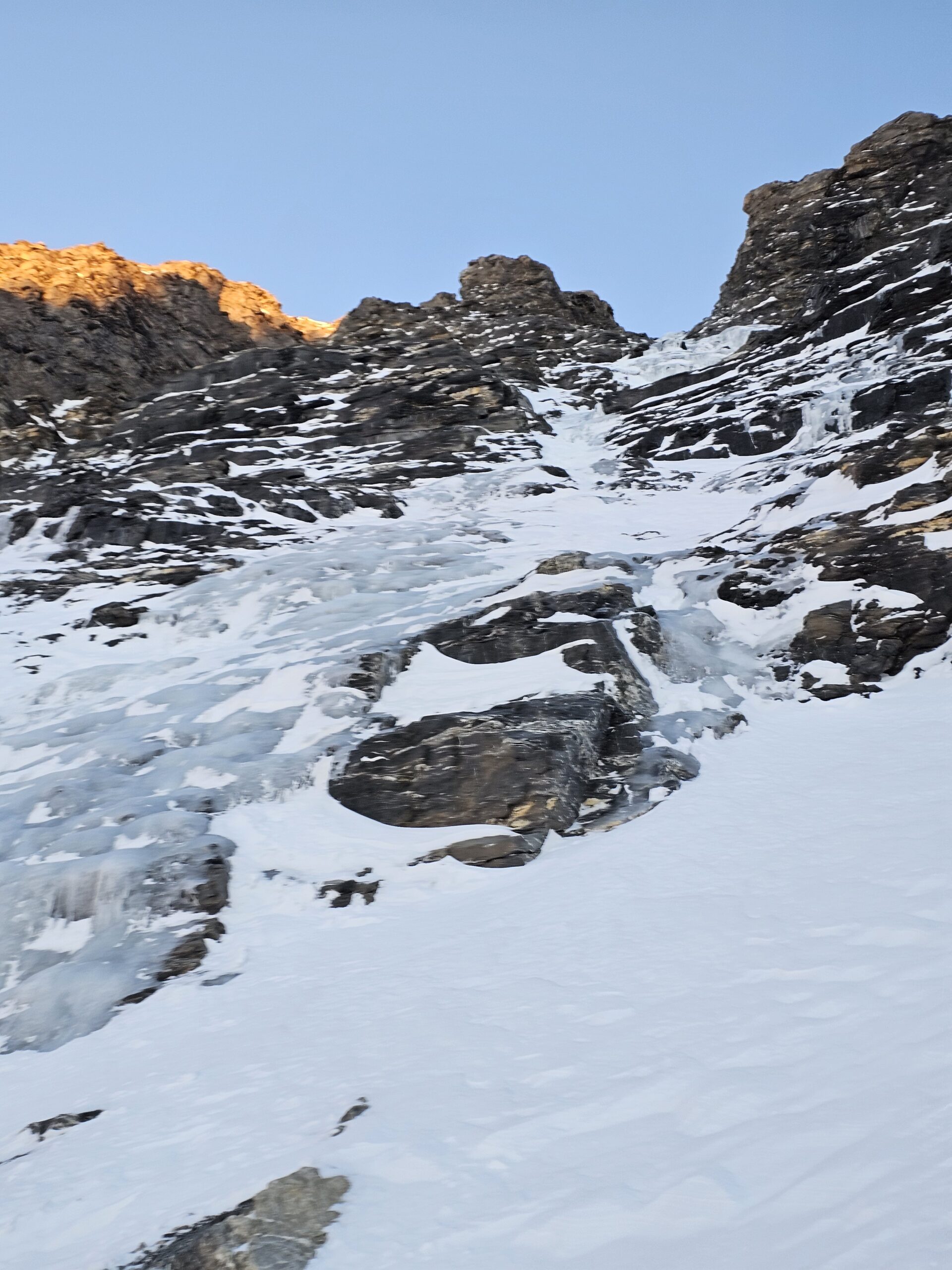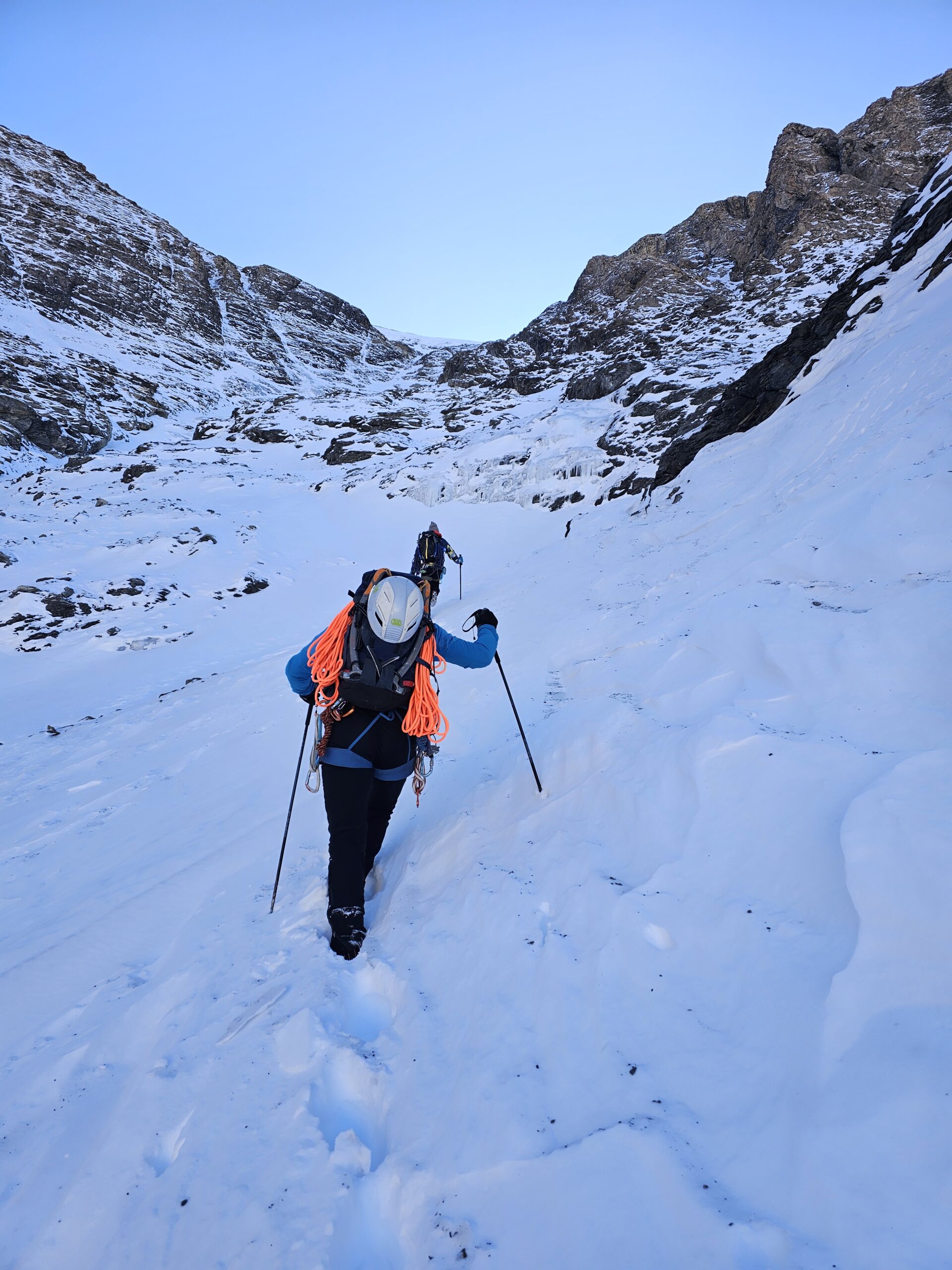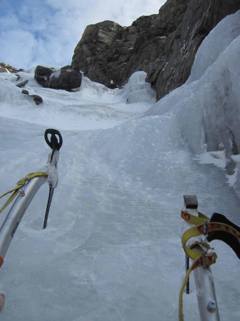 Superare interamente la goulotte, facile nella prima metà con invece diverse parti più ripide nella seconda, che offre muretti a 75° alternati a belle strettoie, il tutto per circa 200 metri di dislivello