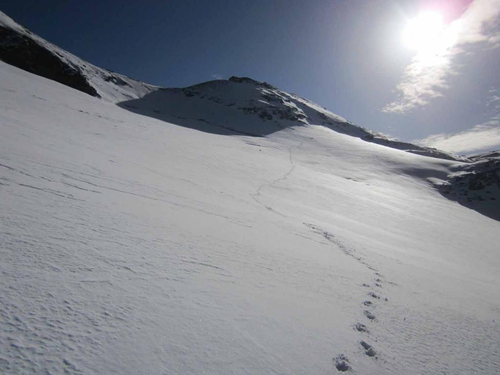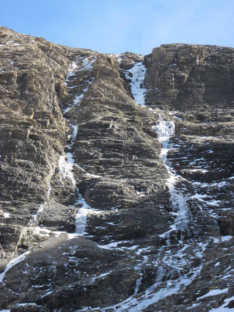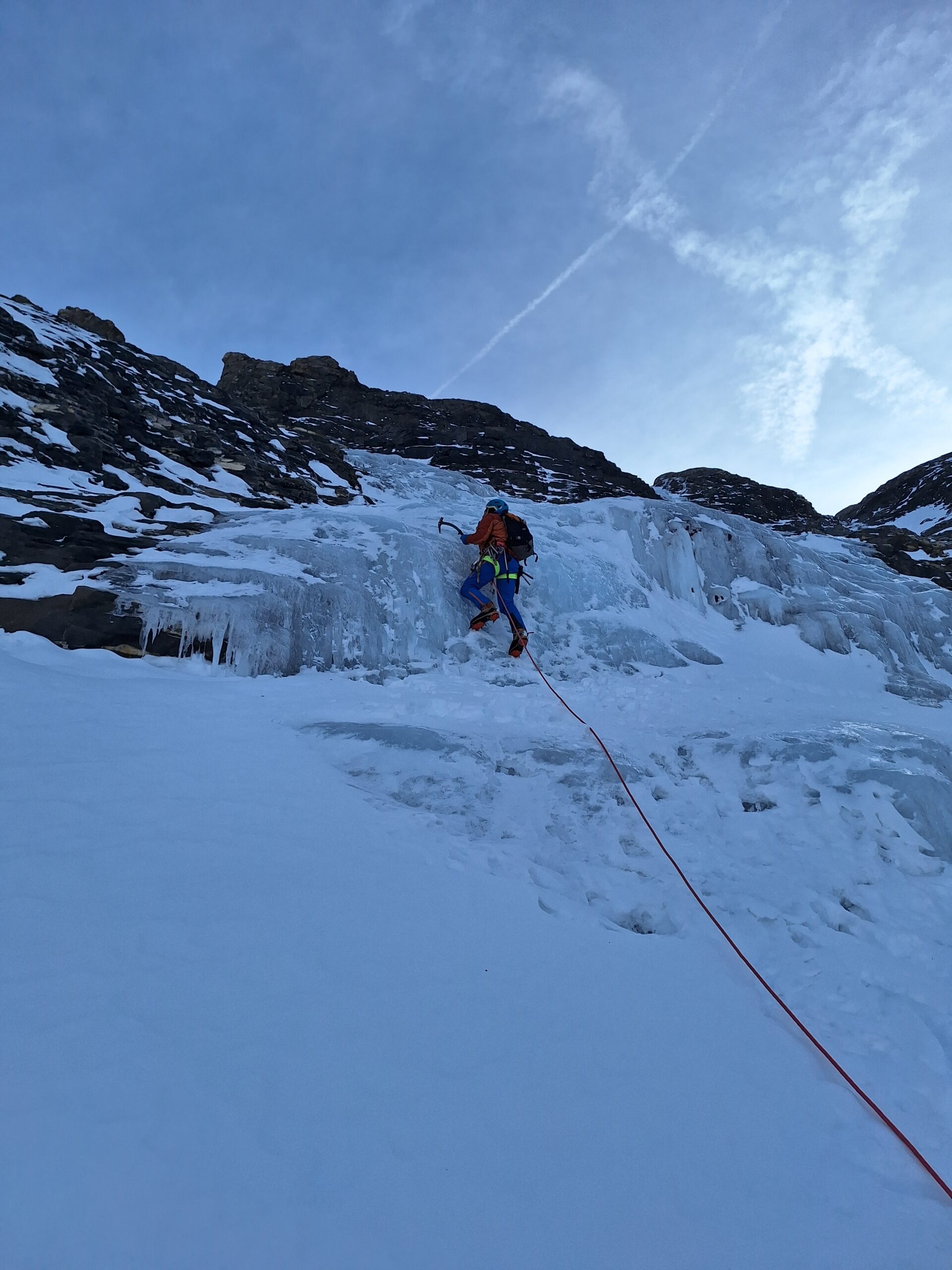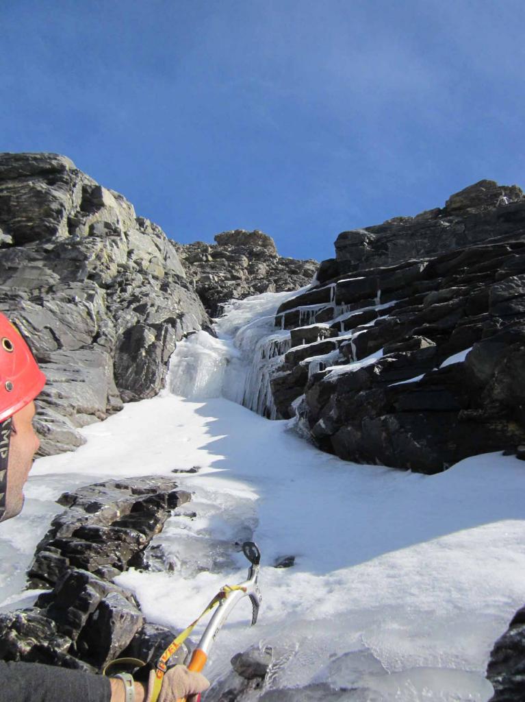 Superare interamente la goulotte, facile nella prima metà con invece diverse parti più ripide nella seconda, che offre muretti a 75° alternati a belle strettoie, il tutto per circa 200 metri di dislivello