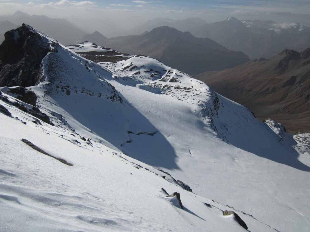 All’uscita della via, portarsi sul ghiaccio del Lamet e raggiungere la cima in 30 minuti, oppure ridiscendere alla base della via seguendo prima il ghiacciaio e poi terreno disagevole se non innevato.