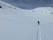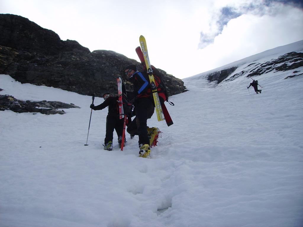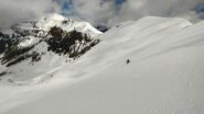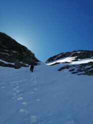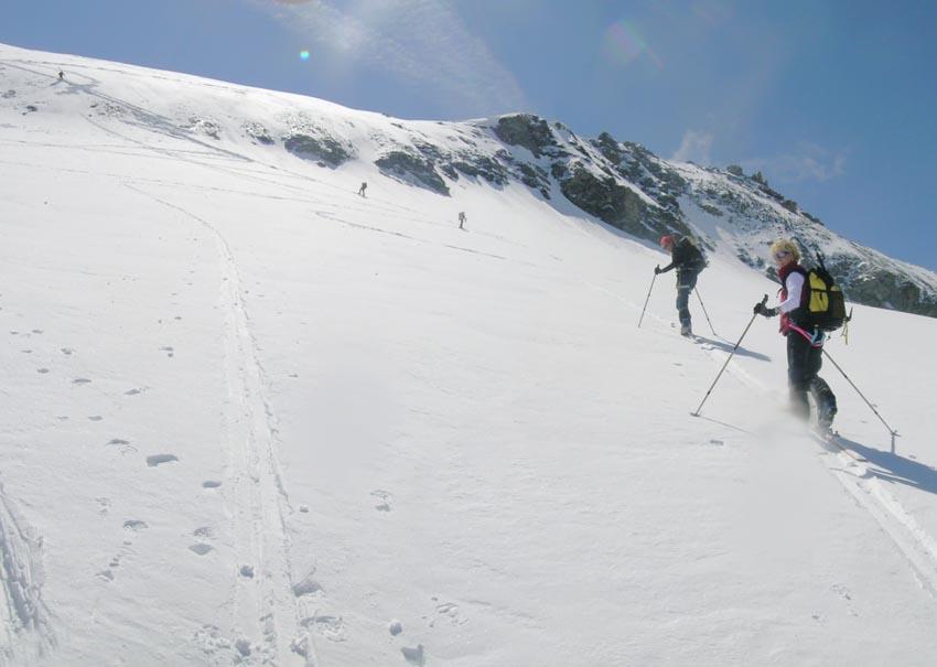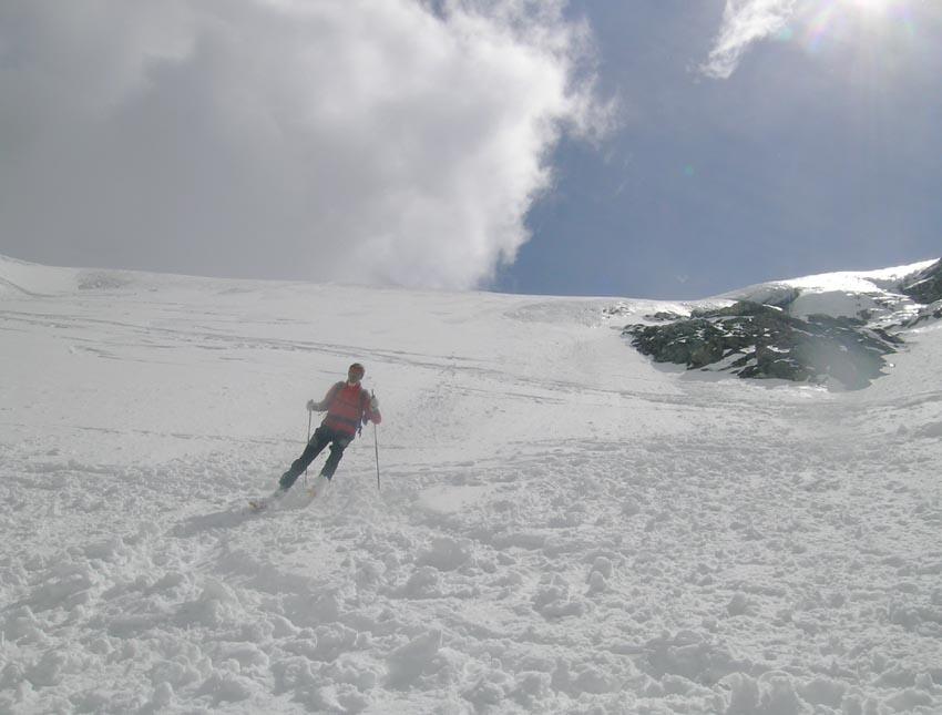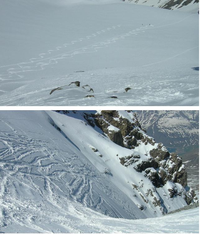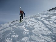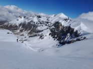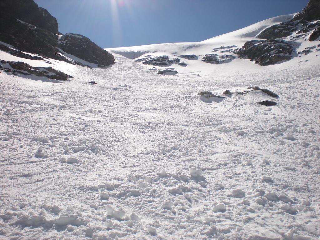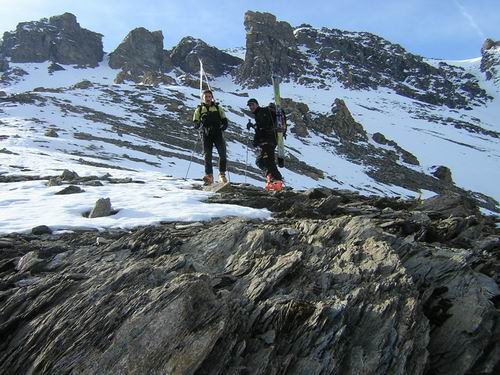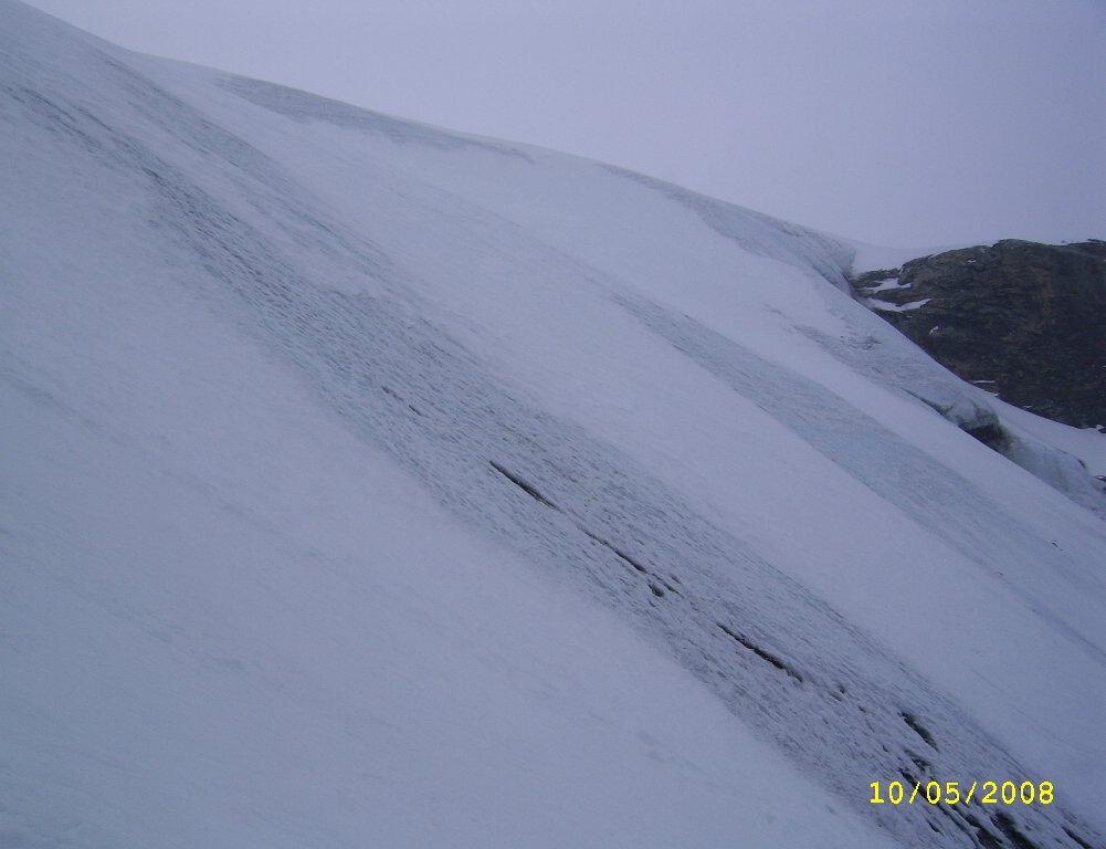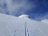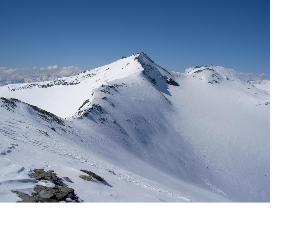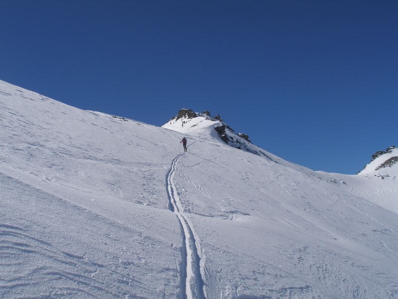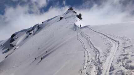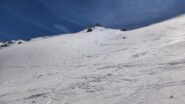 Per arrivare alla cima della Pointe du Lamet conviene raggiungere il colletto alla sua sinistra, e in breve sulla cresta si raggiungono le roccette del piccolo torrione sommitale. Per arrivare invece al Signal du Lamet, dal pendio glaciale finale, si traversa verso destra in direzione di una conca, risalendo l’ultimo pendio di neve mista a sfasciumi.