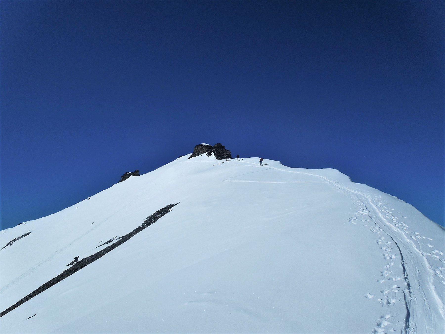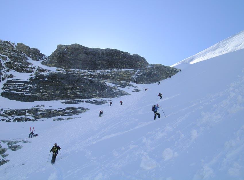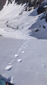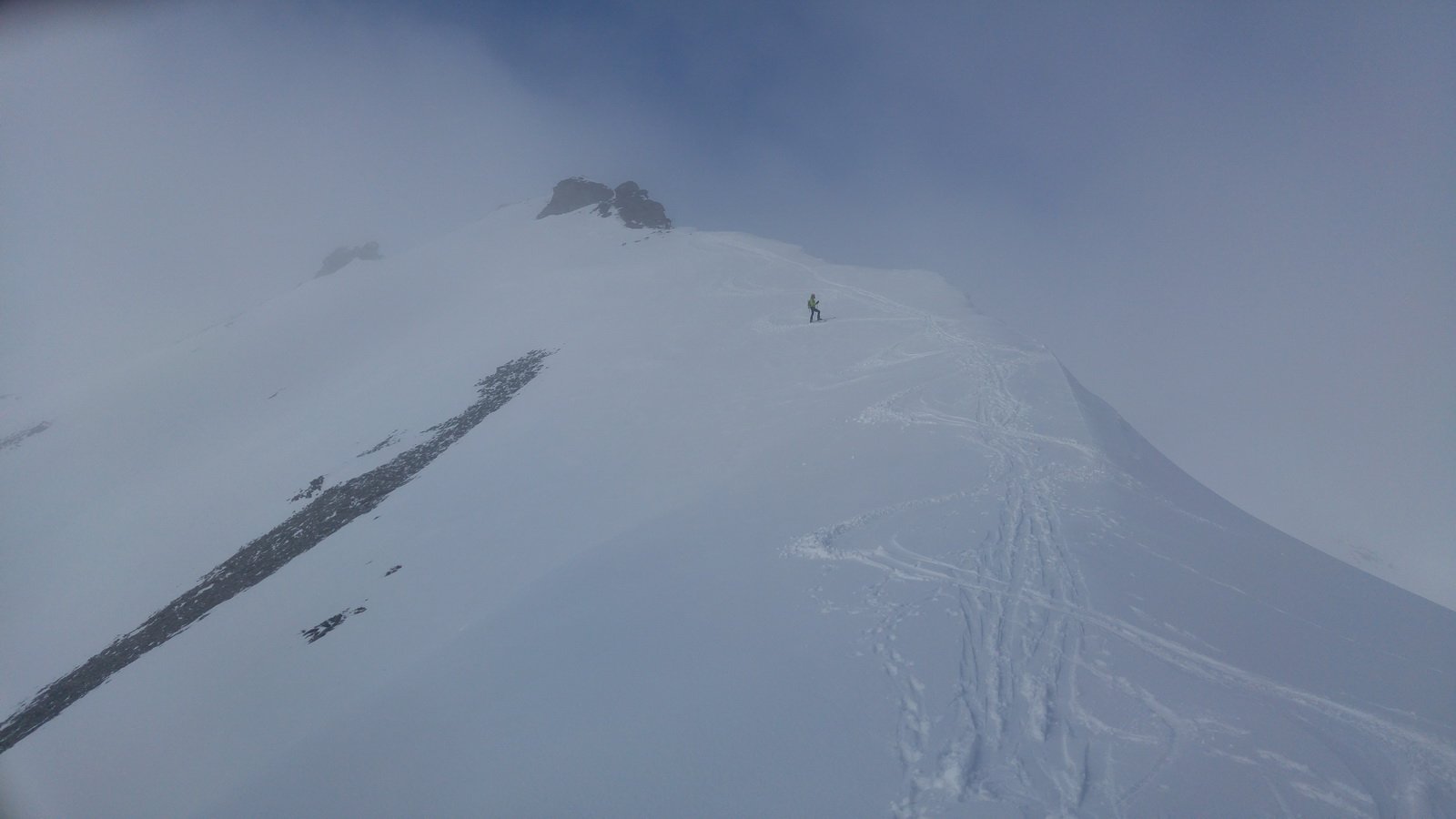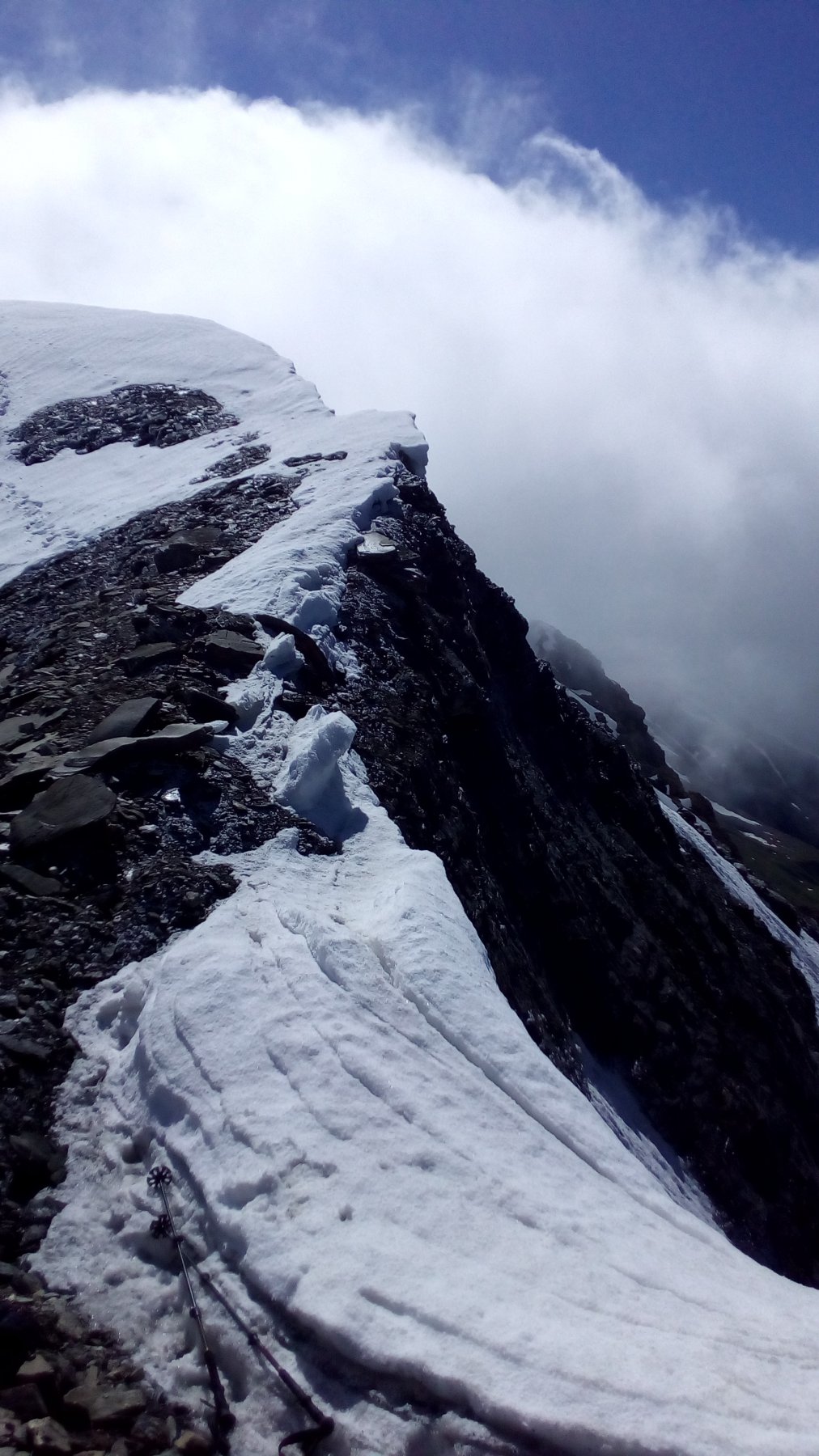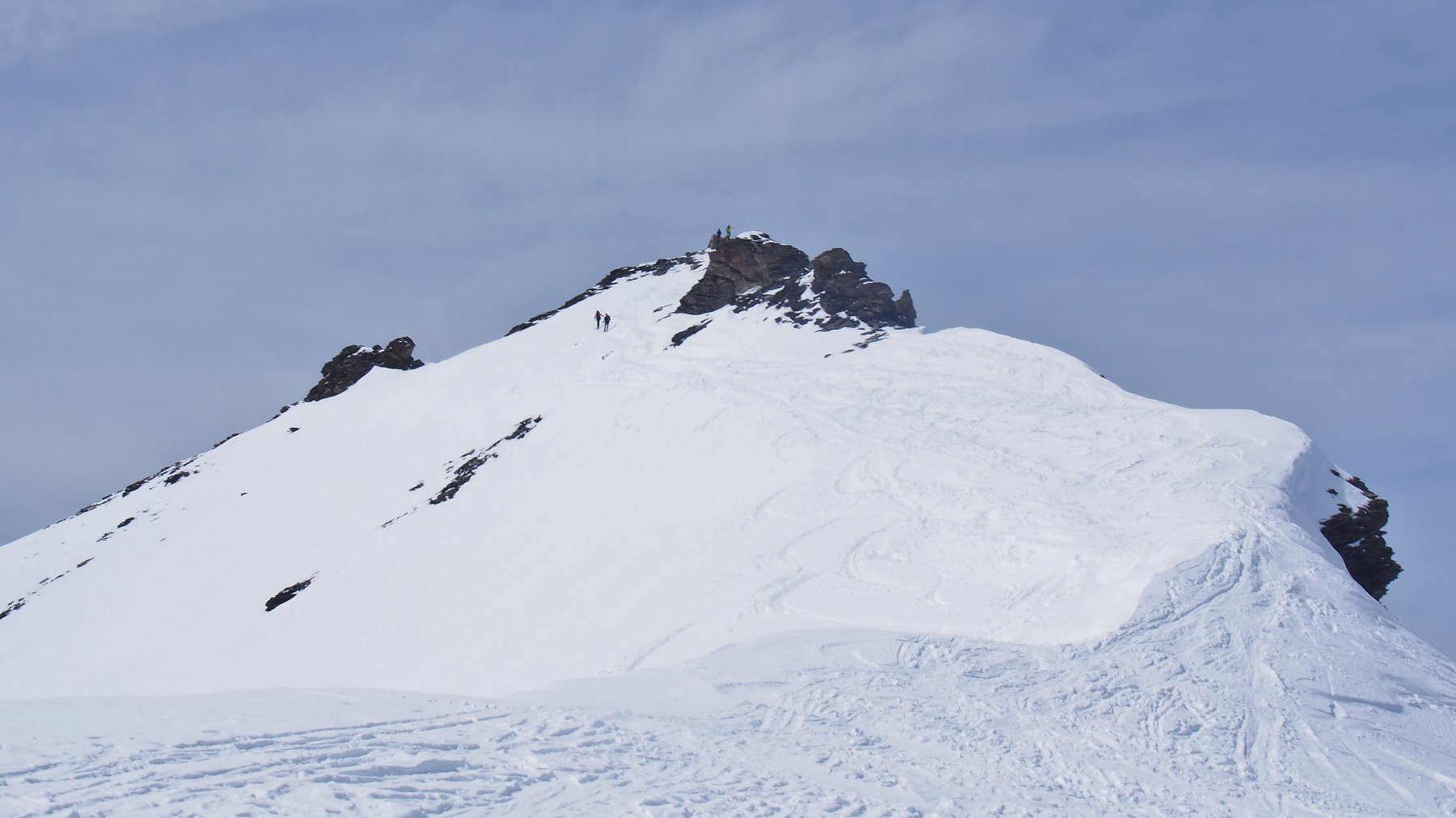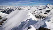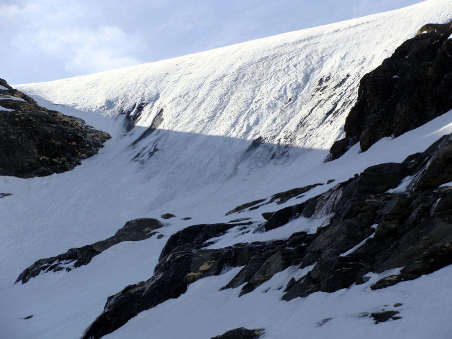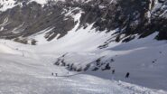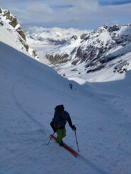 Per arrivare alla cima della Pointe du Lamet conviene raggiungere il colletto alla sua sinistra, e in breve sulla cresta si raggiungono le roccette del piccolo torrione sommitale. Per arrivare invece al Signal du Lamet, dal pendio glaciale finale, si traversa verso destra in direzione di una conca, risalendo l’ultimo pendio di neve mista a sfasciumi.