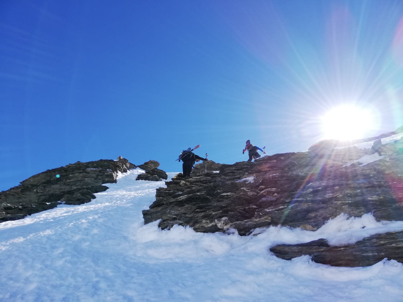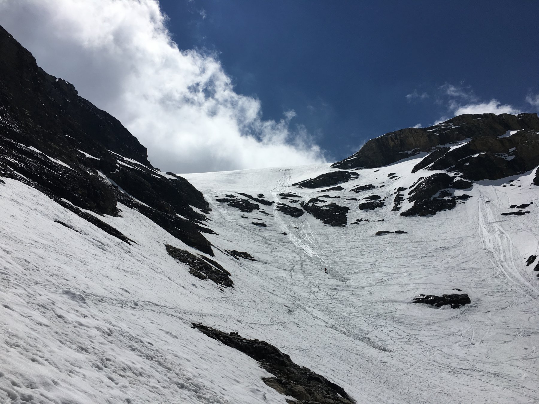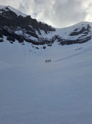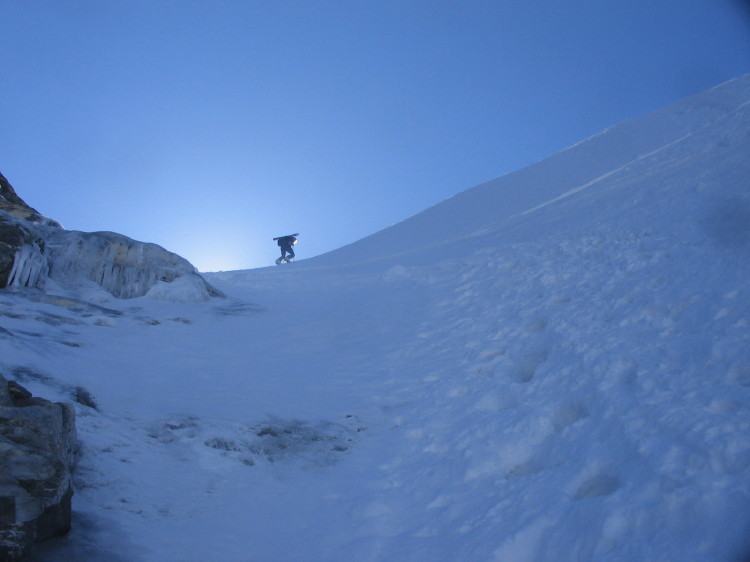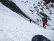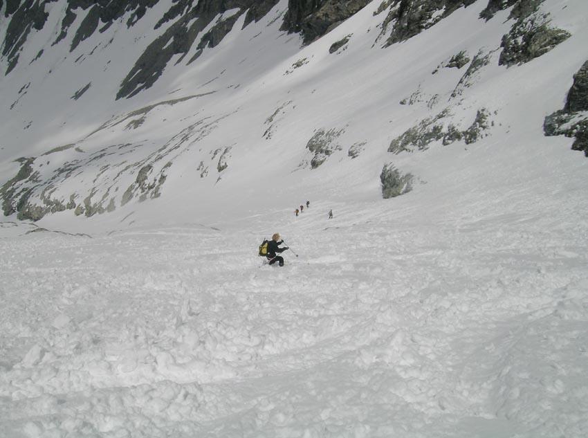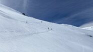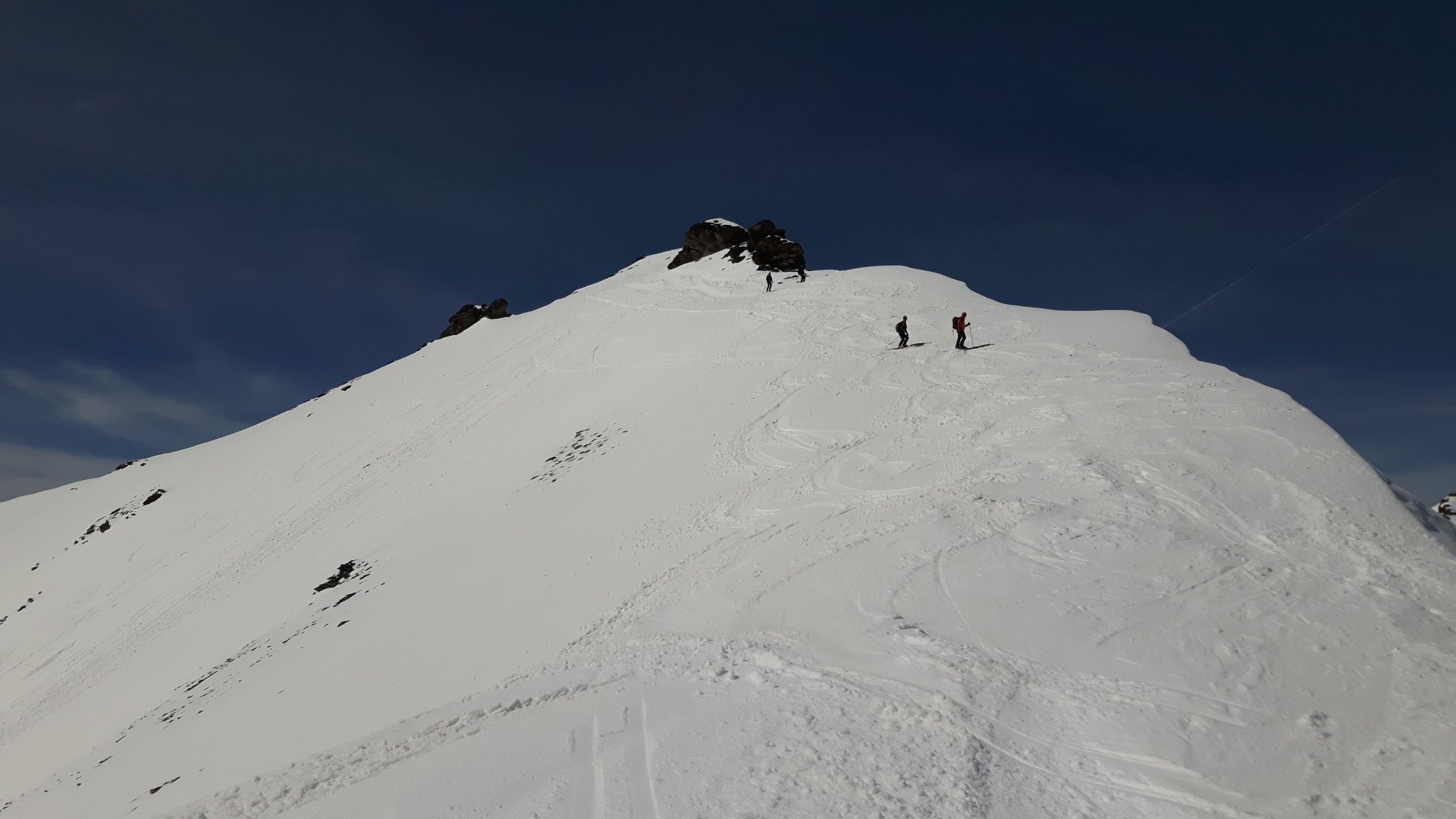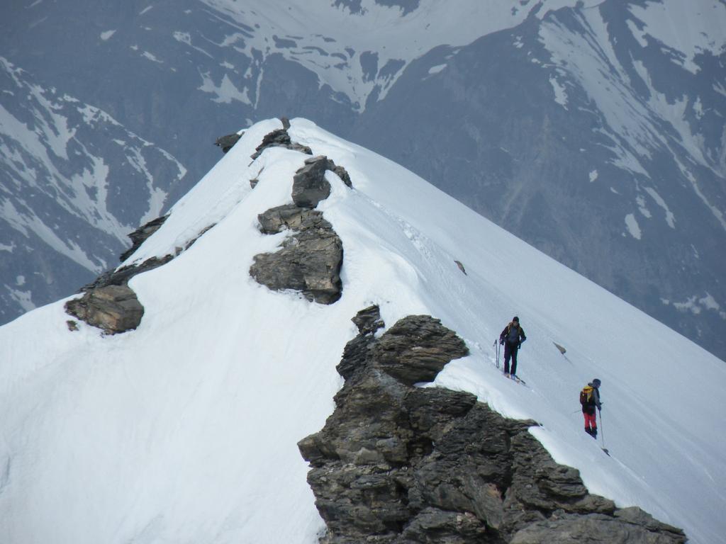 Per arrivare alla cima della Pointe du Lamet conviene raggiungere il colletto alla sua sinistra, e in breve sulla cresta si raggiungono le roccette del piccolo torrione sommitale. Per arrivare invece al Signal du Lamet, dal pendio glaciale finale, si traversa verso destra in direzione di una conca, risalendo l’ultimo pendio di neve mista a sfasciumi.