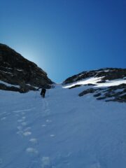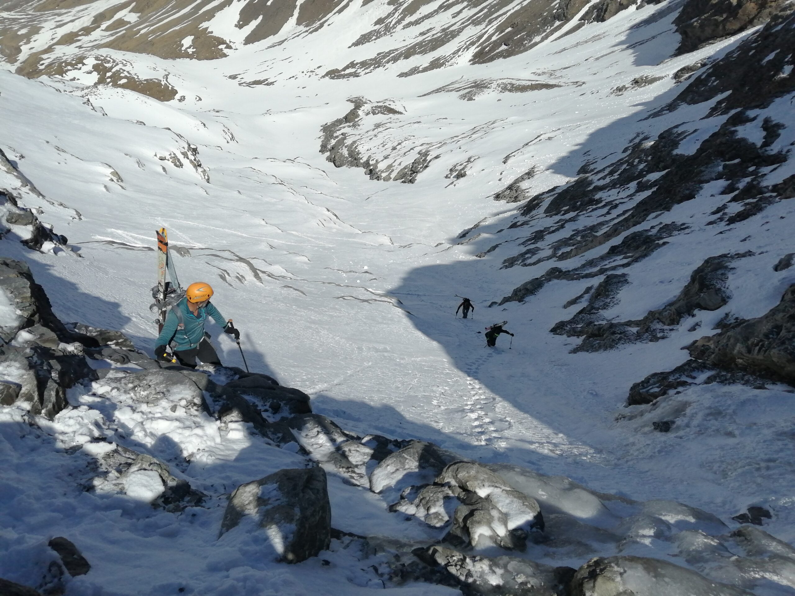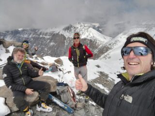 Strada aperta, 30 minuti di portage e poi ottima neve, il canale che da al ghiacciaio superiore per un paio di metri è in ghiaccio vivo ed è un problema sia in salita che in discesa quindi sarebbe figo avere almeno 2 chiodi e un cordino da 20 metri.. Noi senza niente abbiamo ravanato un attimo!!! Per il resto neve degna di essere chiamata primaverile……