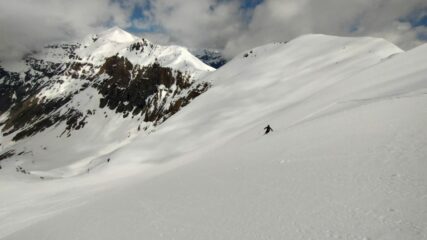 In discesa primo pendio su tre dita di farinosa compatta su fondo duro; canale su neve dura grippante preso sulla sx (tratto ripido breve).