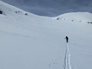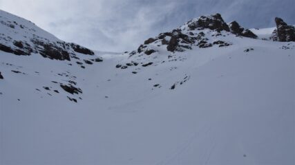 Scesi poco dopo le 11, pochi cm di polverella su fondo duro mooooolto bella! Canale su neve molto dura quindi siamo scesi più a sx, belle curve su neve man mano più bagnata ma sempre scorrevole e divertente.