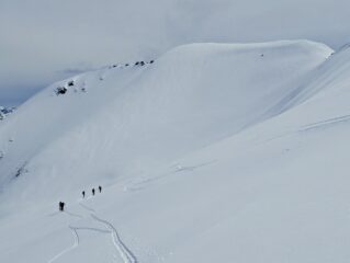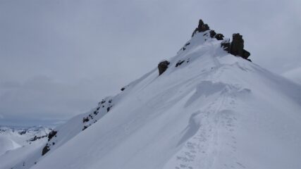 Si calzano gli sci poco sopra il Forte Roncia, salito il canale con gli sci (utili coltelli) fino a 50m dall’uscita dove abbiamo proseguito a piedi su ottime peste (ramponi facoltativi). Rimessi gli sci e saliti passando dalla cresta a destra della cima, ultimi 50m a piedi su buona traccia (possono tornare comodi i ramponi o picca).
