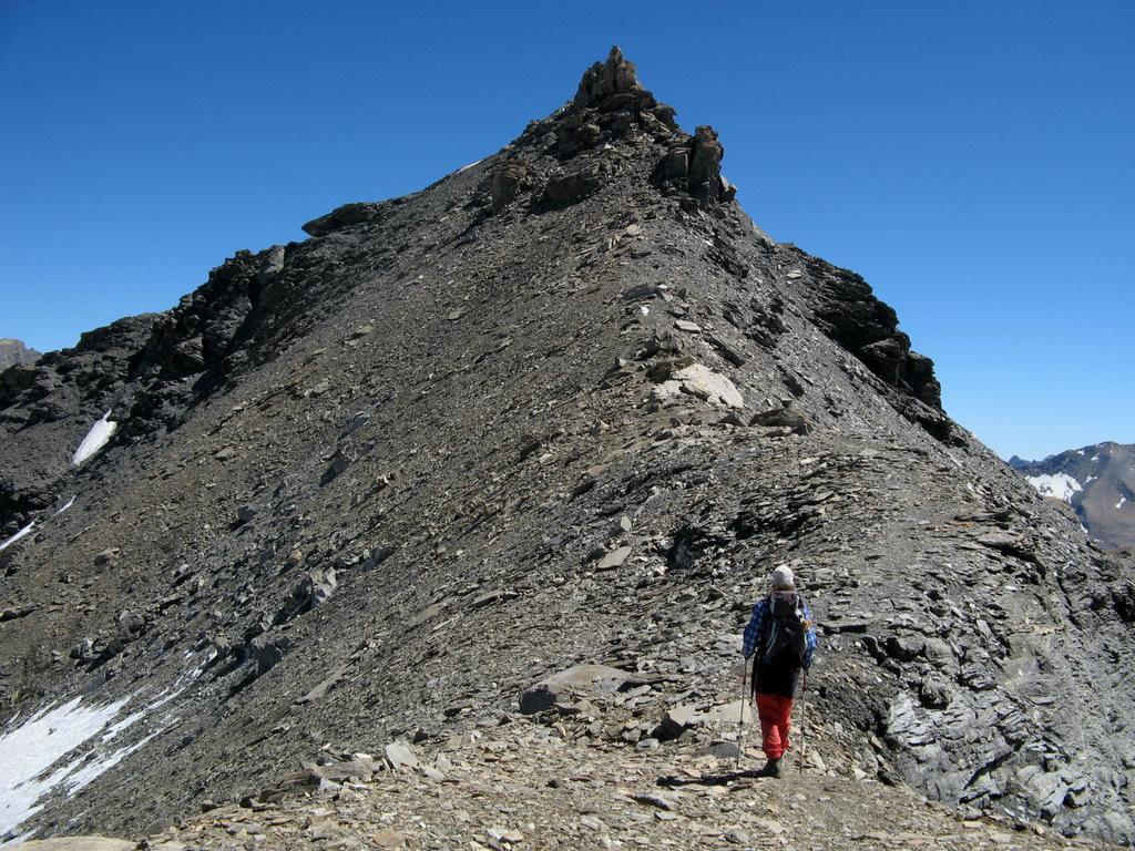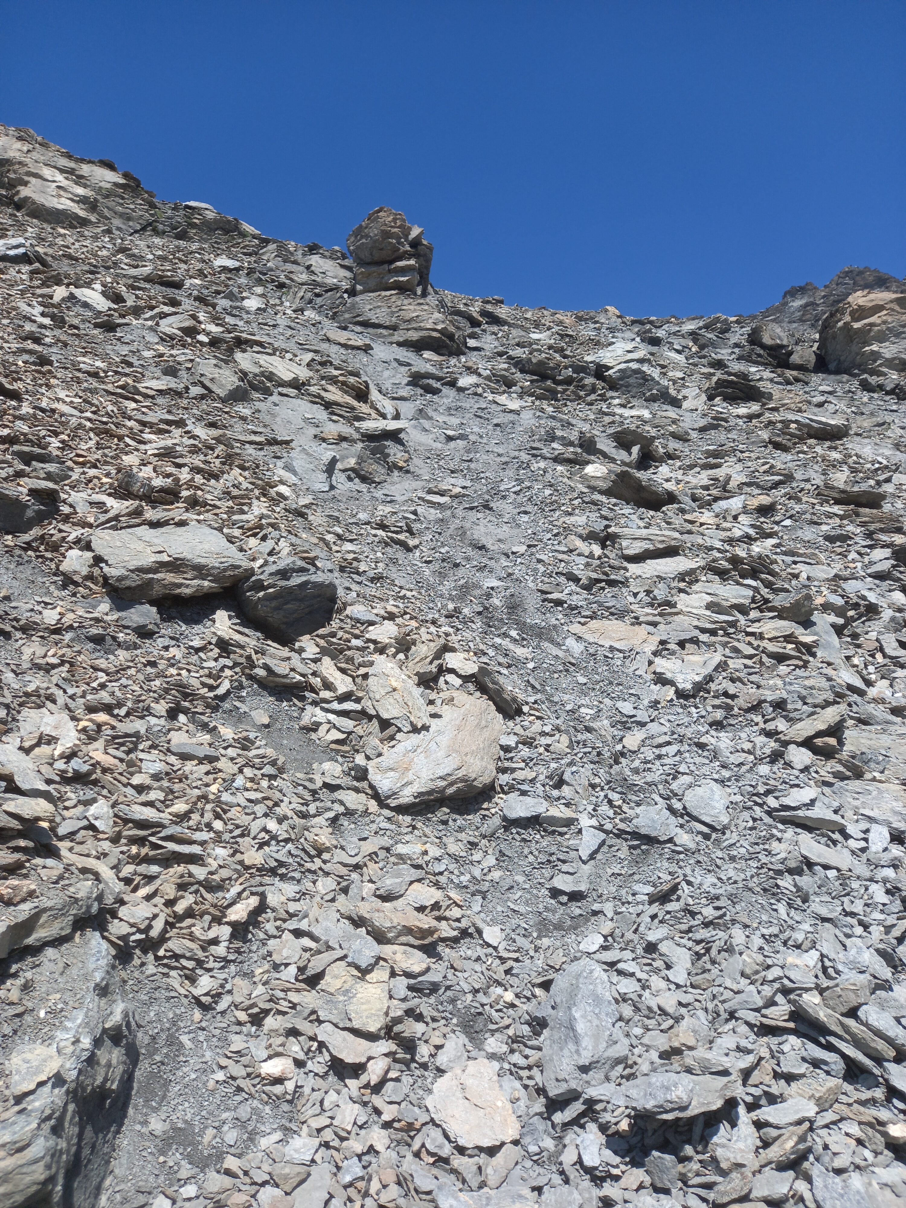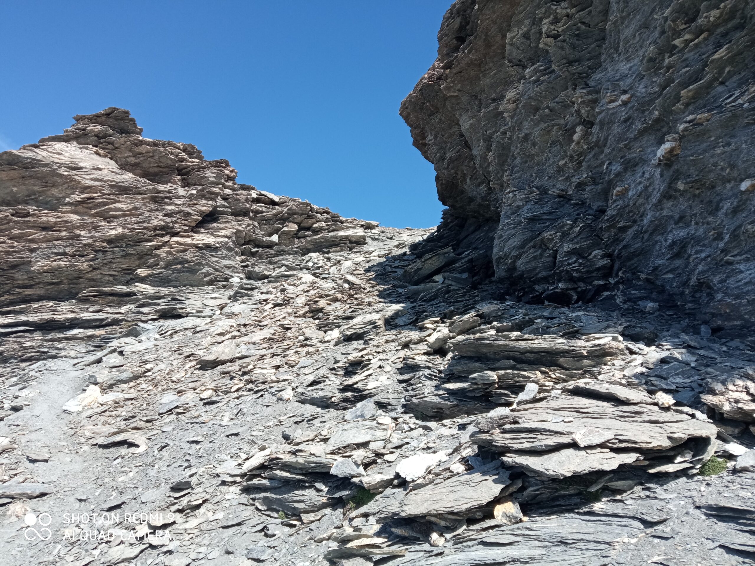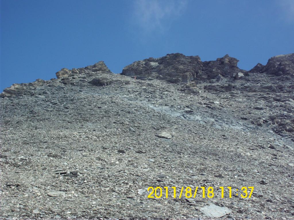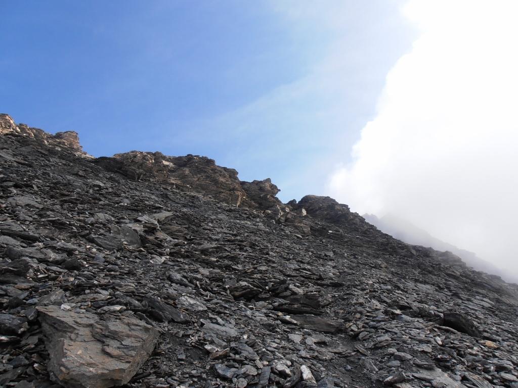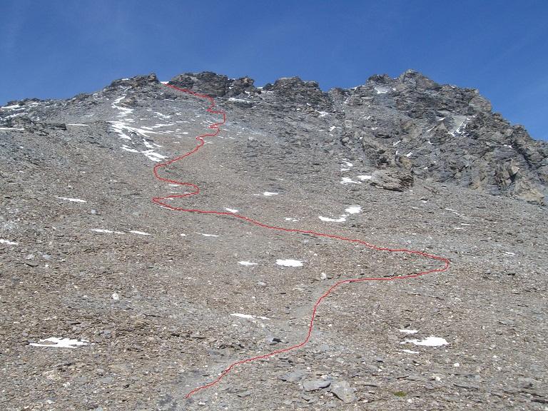 Dall’intaglio si continua passando a mezza costa sotto la Pointe du Lamet, finchè la traccia inizia a salire verso destra con decisione, risalendo una sorta di canalino, dove è frequente trovare il terreno ghiacciaio o verglassato perchè in ombra, e aiutandosi con le mani si perviene all’intaglio che permette di uscire sul versante opposto, proprio alla base del torrione sommitale della cima. Per salire in vetta si devono superare alcuni passi di I e II, ben gradinati, sul suddetto torrione 3505 m,.
