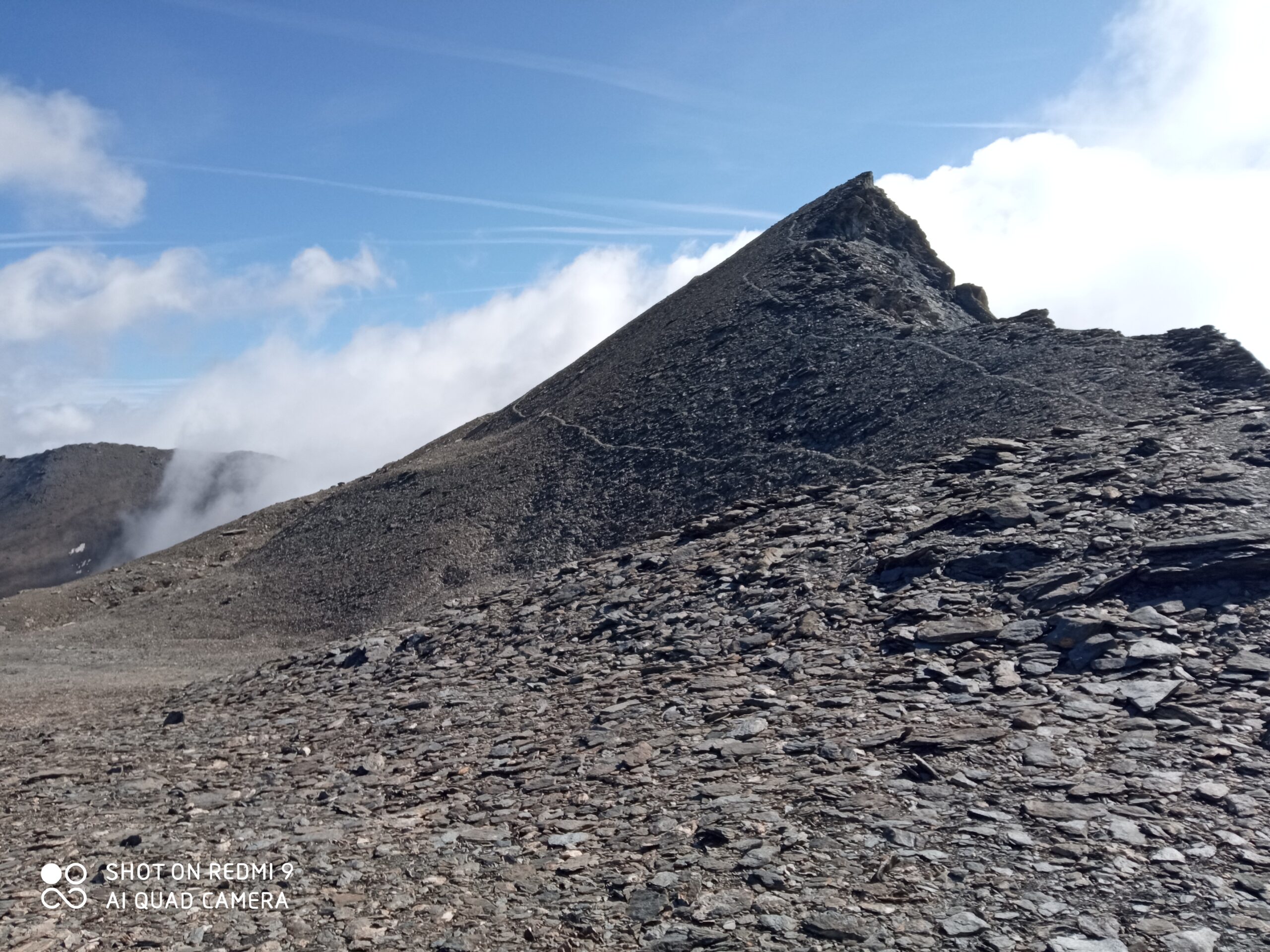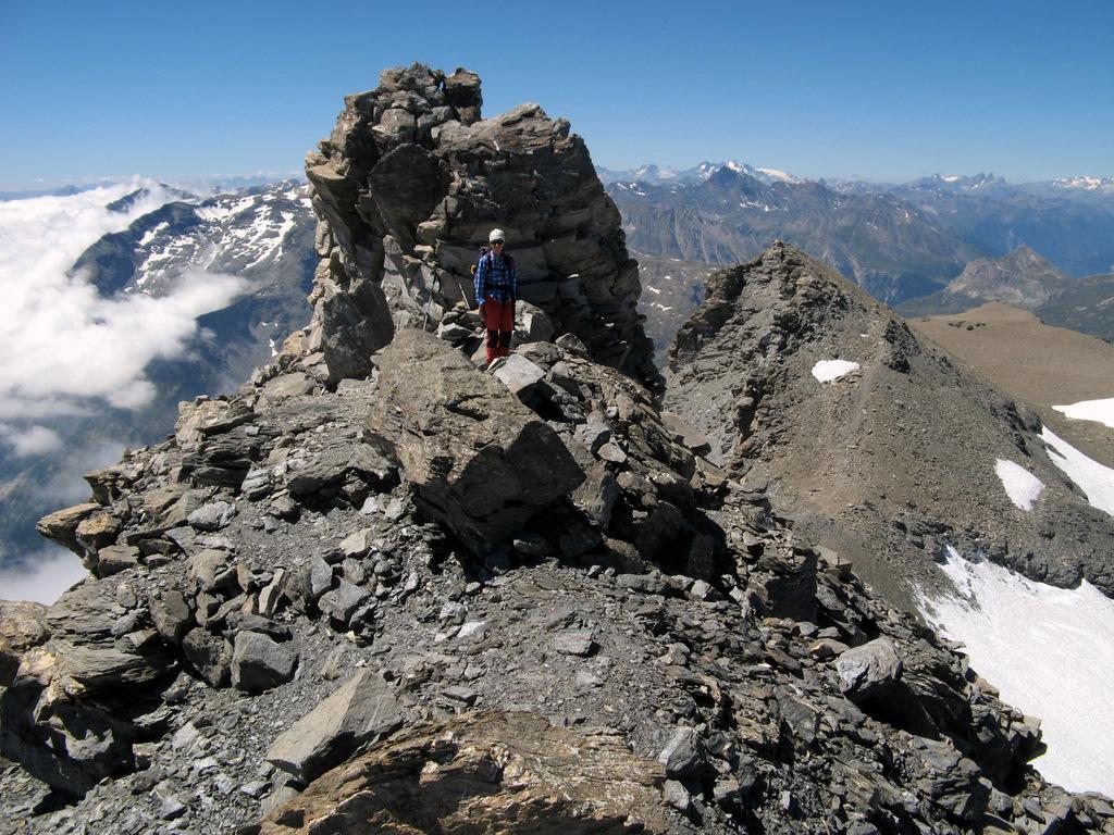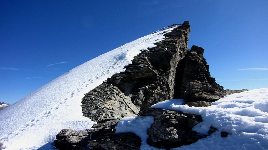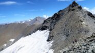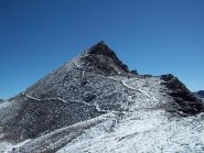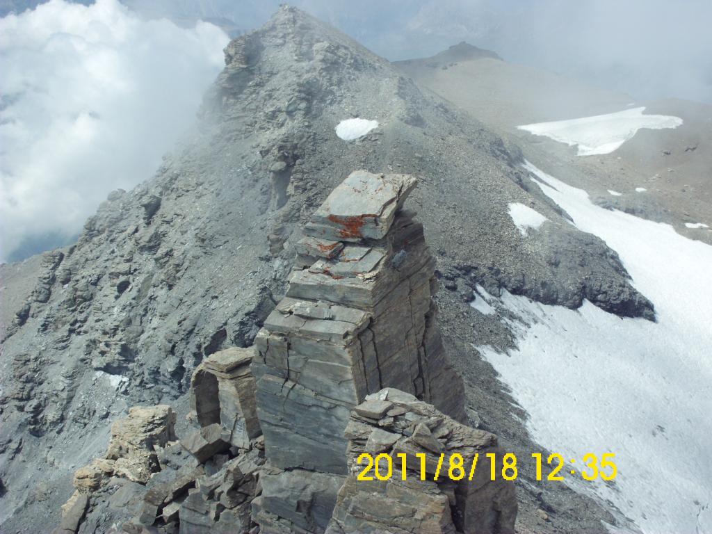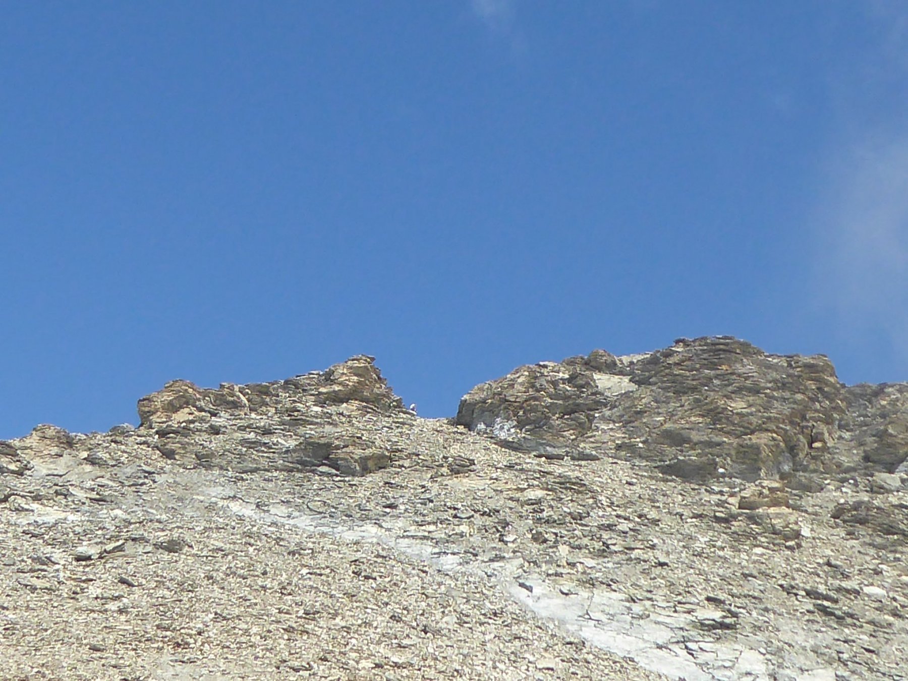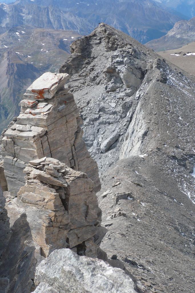 Dall’intaglio si continua passando a mezza costa sotto la Pointe du Lamet, finchè la traccia inizia a salire verso destra con decisione, risalendo una sorta di canalino, dove è frequente trovare il terreno ghiacciaio o verglassato perchè in ombra, e aiutandosi con le mani si perviene all’intaglio che permette di uscire sul versante opposto, proprio alla base del torrione sommitale della cima. Per salire in vetta si devono superare alcuni passi di I e II, ben gradinati, sul suddetto torrione 3505 m,.