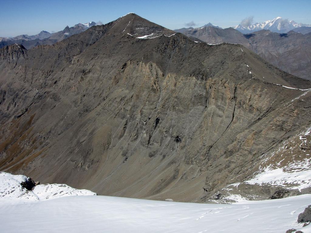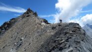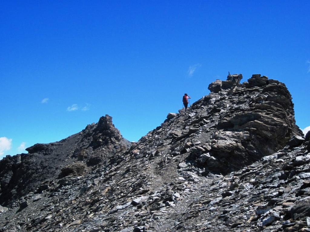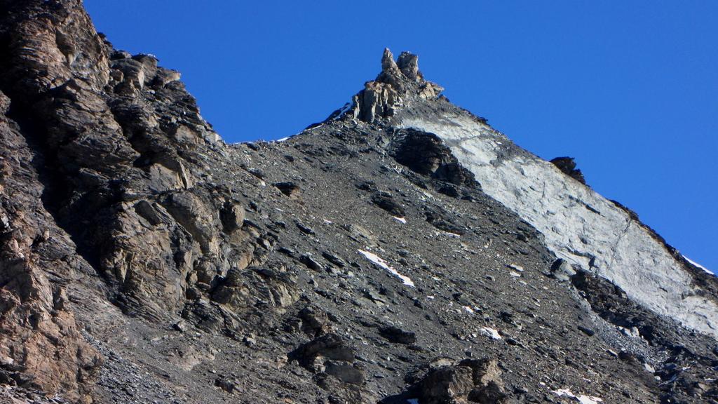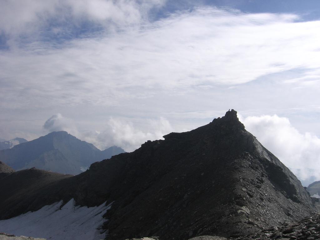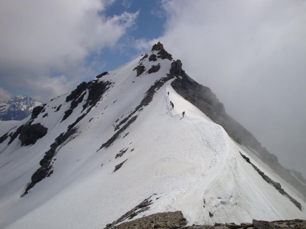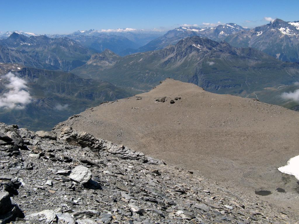 Dall’intaglio si continua passando a mezza costa sotto la Pointe du Lamet, finchè la traccia inizia a salire verso destra con decisione, risalendo una sorta di canalino, dove è frequente trovare il terreno ghiacciaio o verglassato perchè in ombra, e aiutandosi con le mani si perviene all’intaglio che permette di uscire sul versante opposto, proprio alla base del torrione sommitale della cima. Per salire in vetta si devono superare alcuni passi di I e II, ben gradinati, sul suddetto torrione 3505 m,.