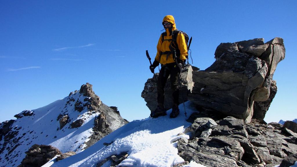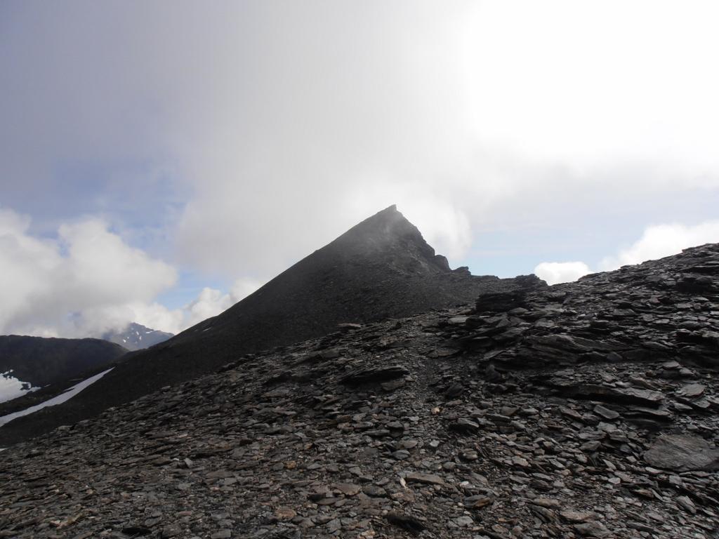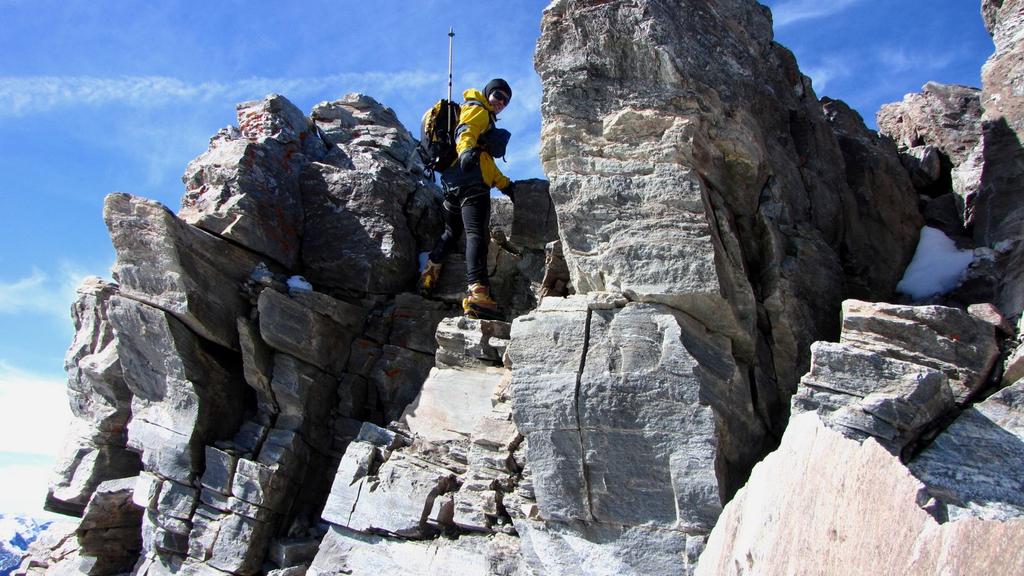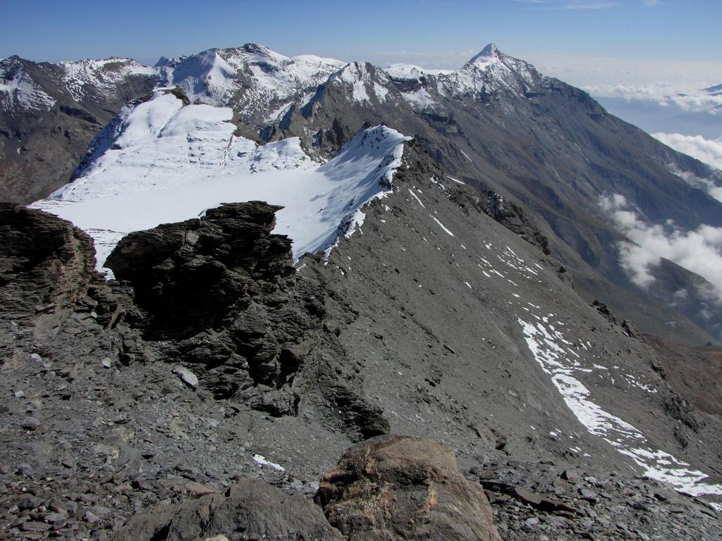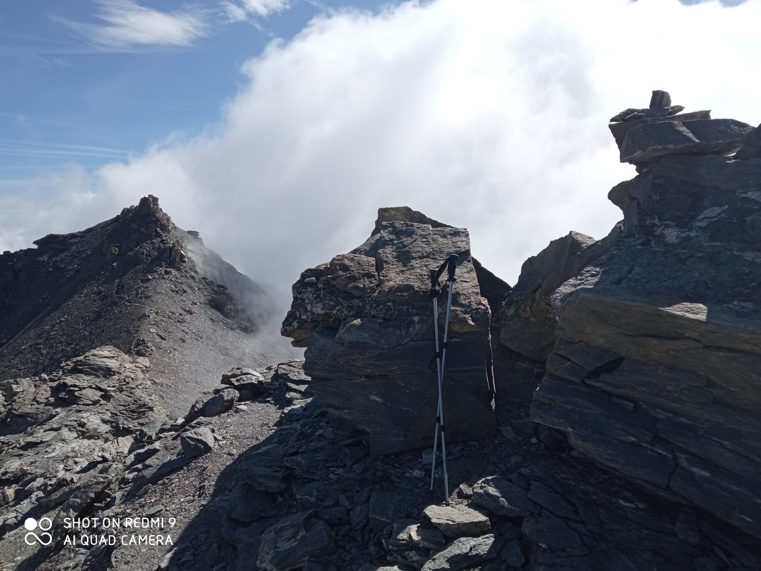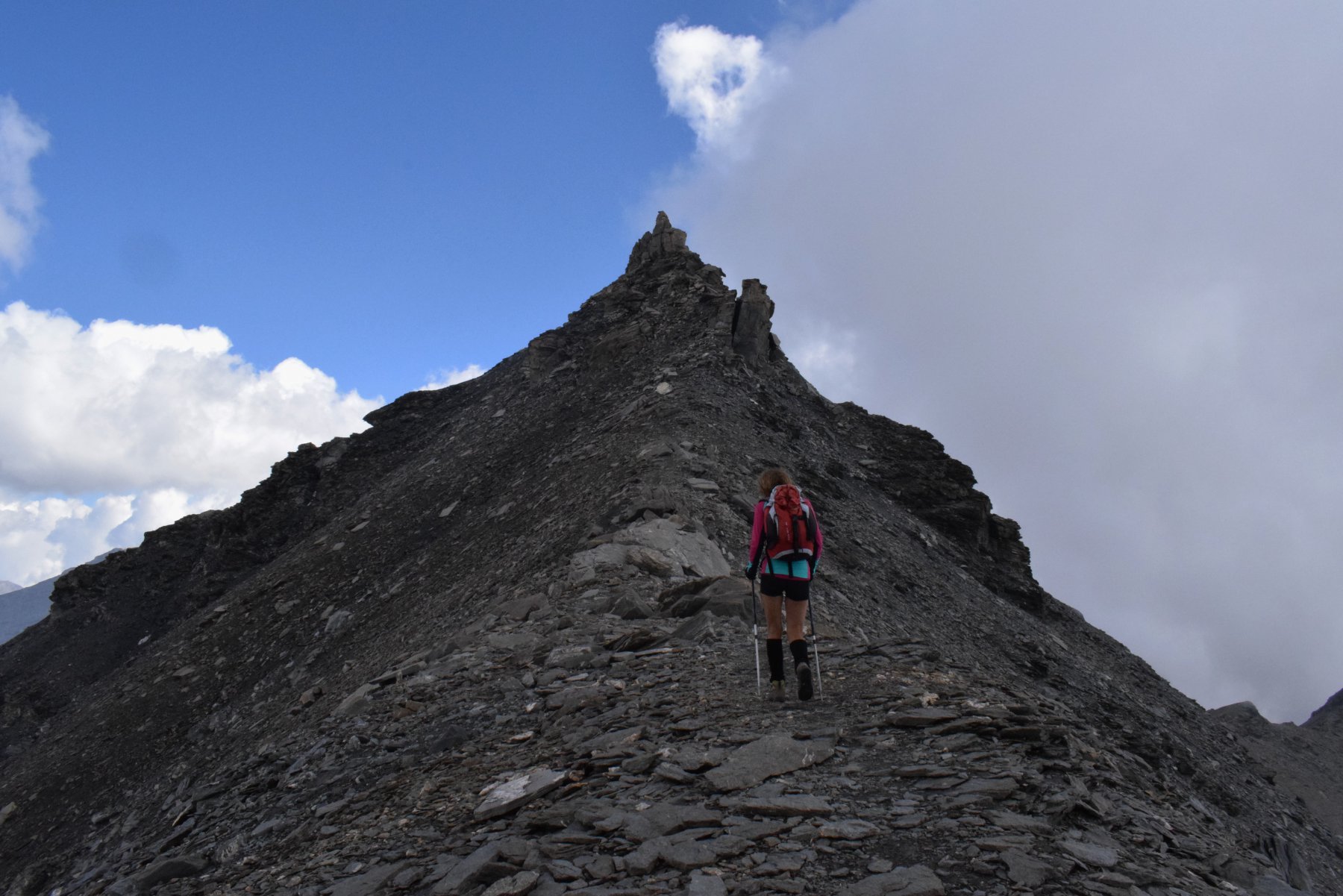 Dall’intaglio si continua passando a mezza costa sotto la Pointe du Lamet, finchè la traccia inizia a salire verso destra con decisione, risalendo una sorta di canalino, dove è frequente trovare il terreno ghiacciaio o verglassato perchè in ombra, e aiutandosi con le mani si perviene all’intaglio che permette di uscire sul versante opposto, proprio alla base del torrione sommitale della cima. Per salire in vetta si devono superare alcuni passi di I e II, ben gradinati, sul suddetto torrione 3505 m,.