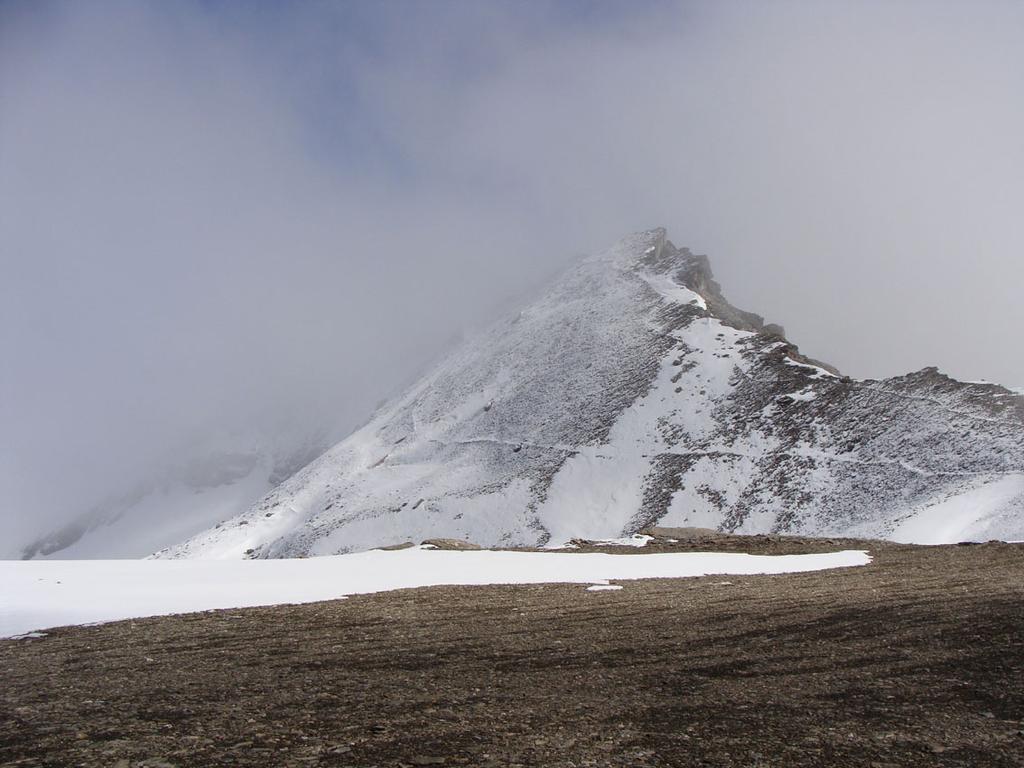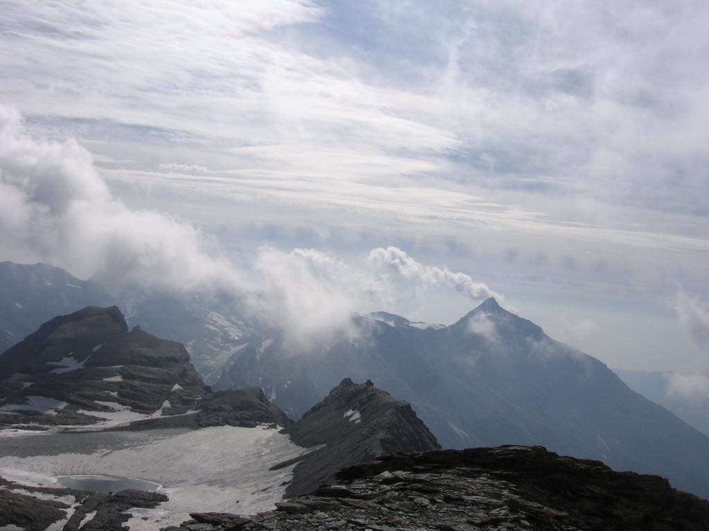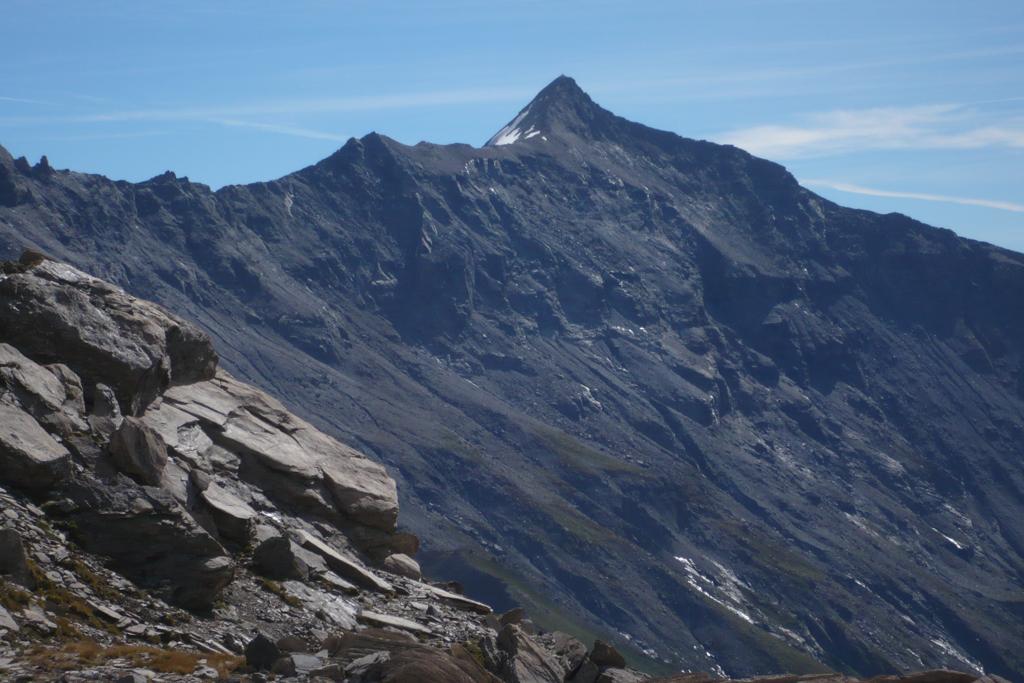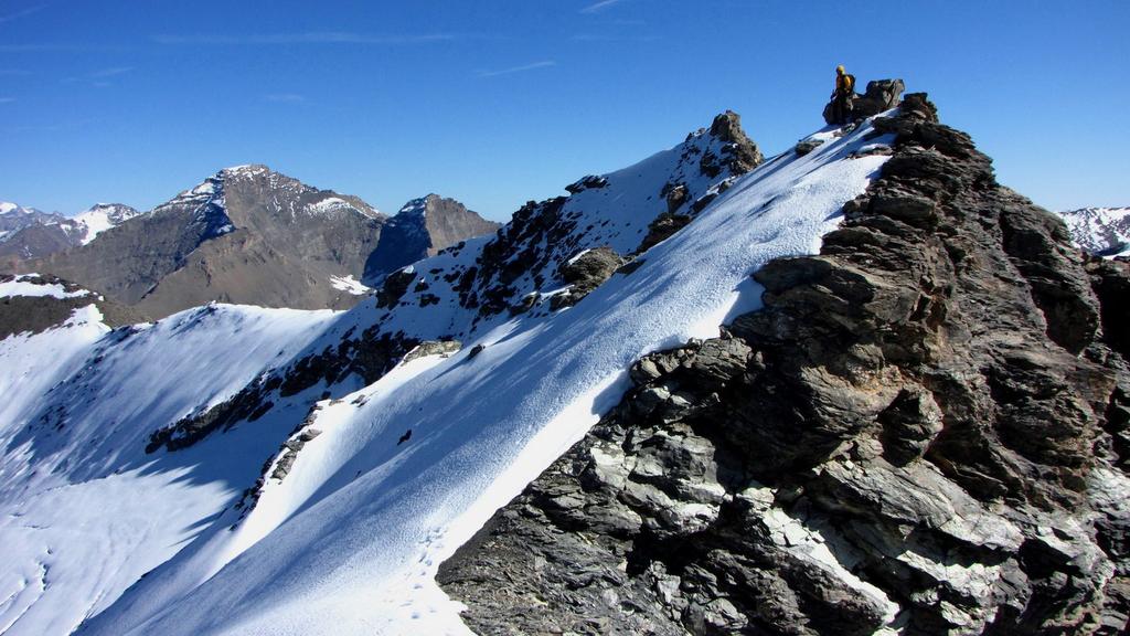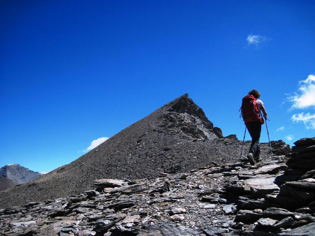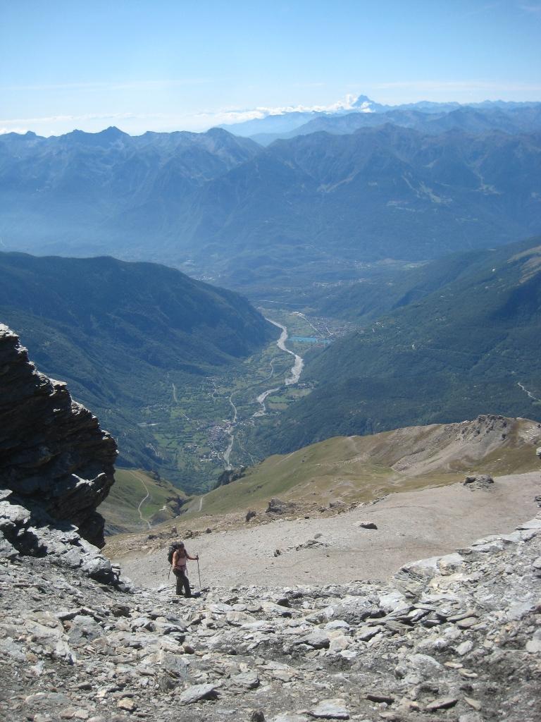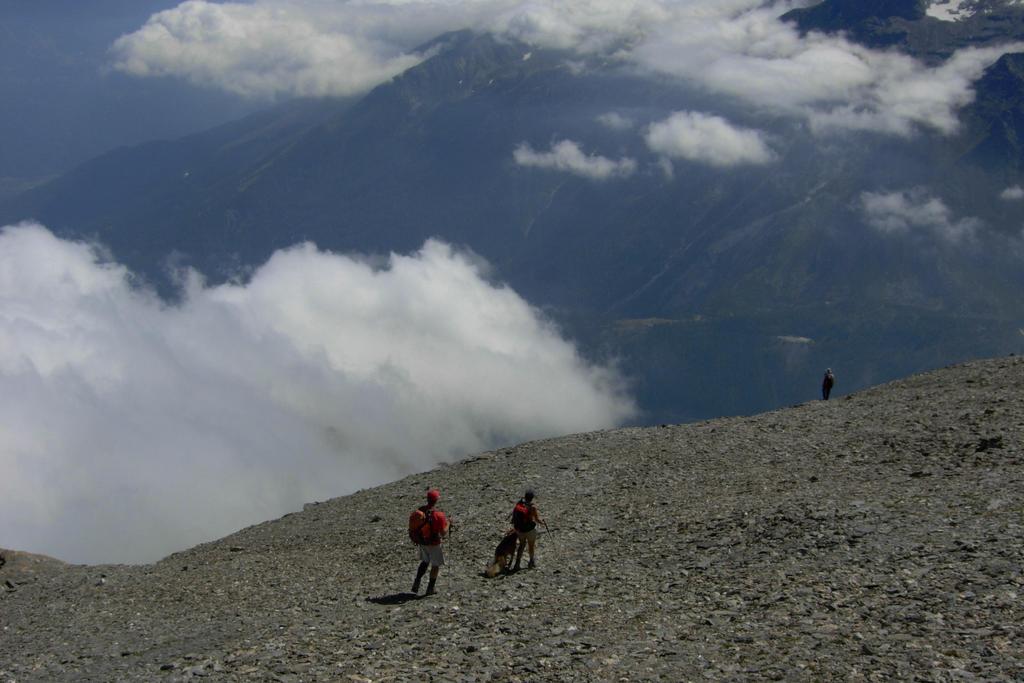 Dall’intaglio si continua passando a mezza costa sotto la Pointe du Lamet, finchè la traccia inizia a salire verso destra con decisione, risalendo una sorta di canalino, dove è frequente trovare il terreno ghiacciaio o verglassato perchè in ombra, e aiutandosi con le mani si perviene all’intaglio che permette di uscire sul versante opposto, proprio alla base del torrione sommitale della cima. Per salire in vetta si devono superare alcuni passi di I e II, ben gradinati, sul suddetto torrione 3505 m,.