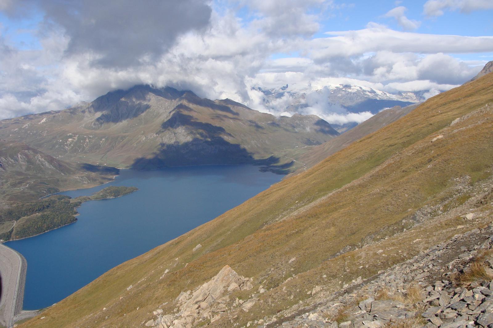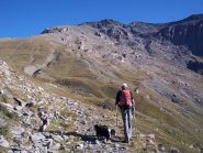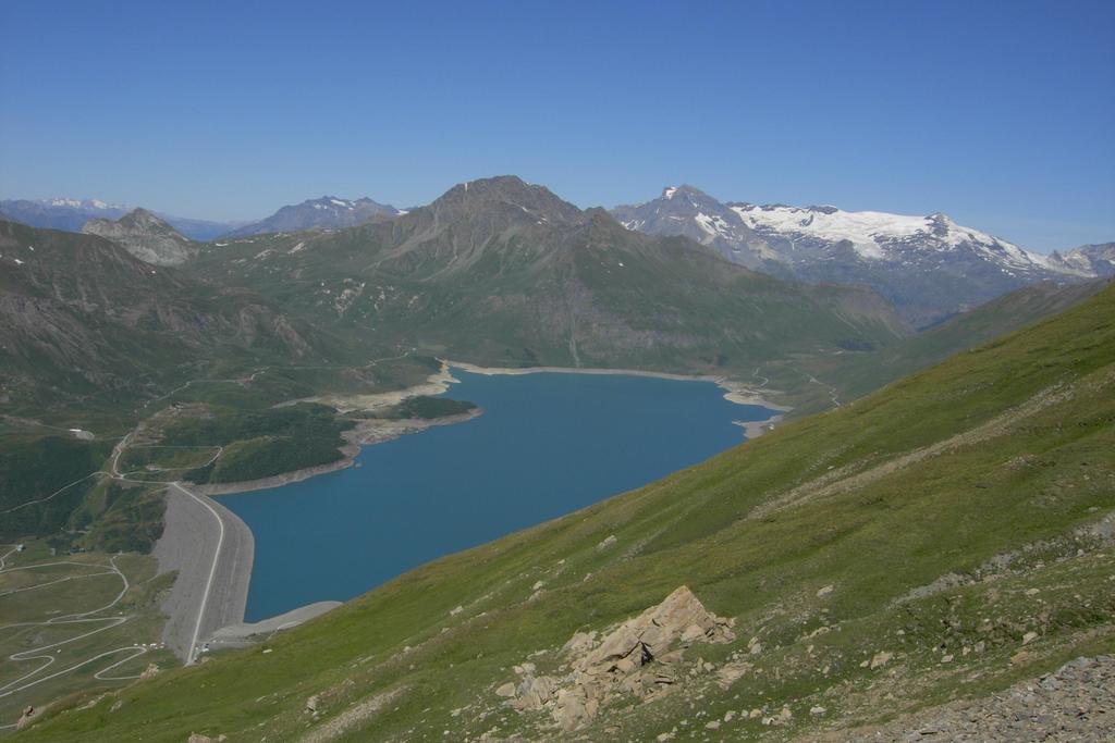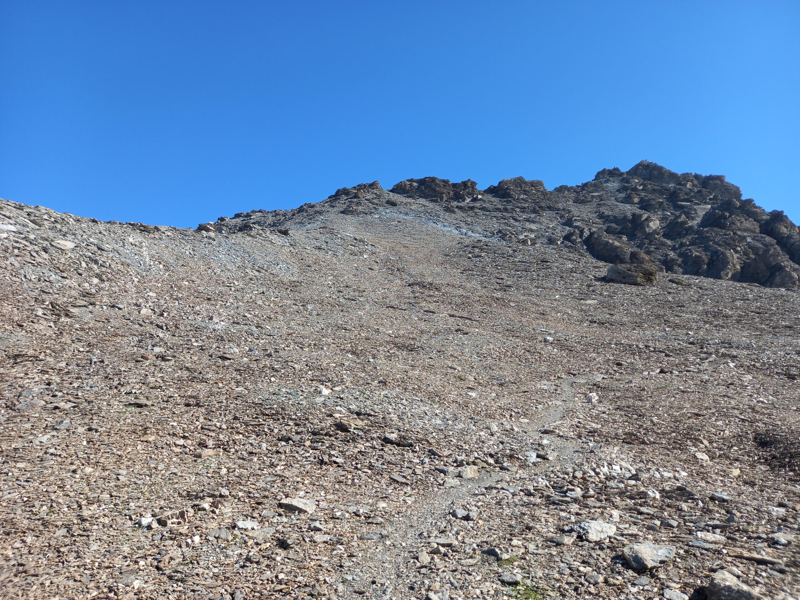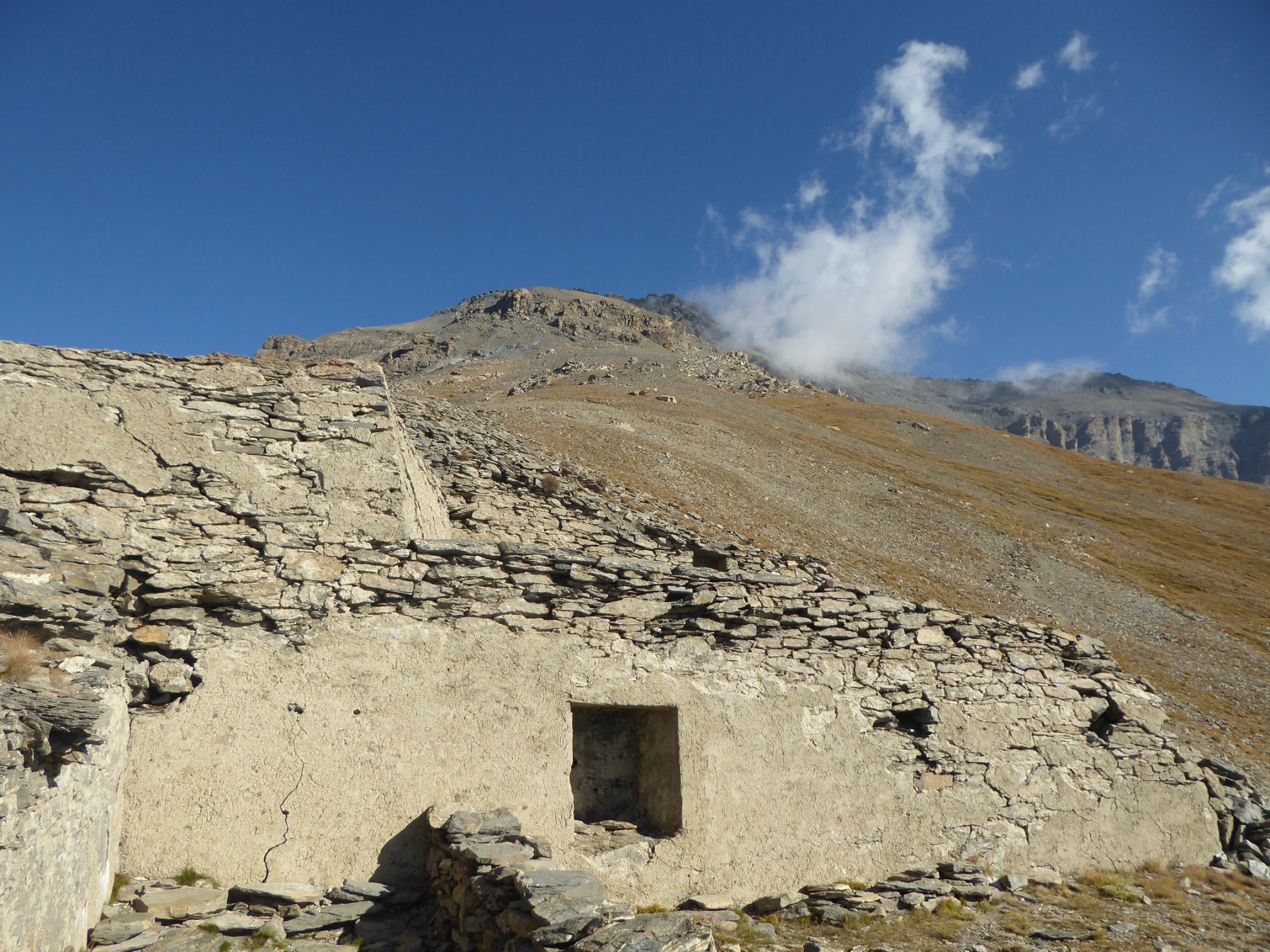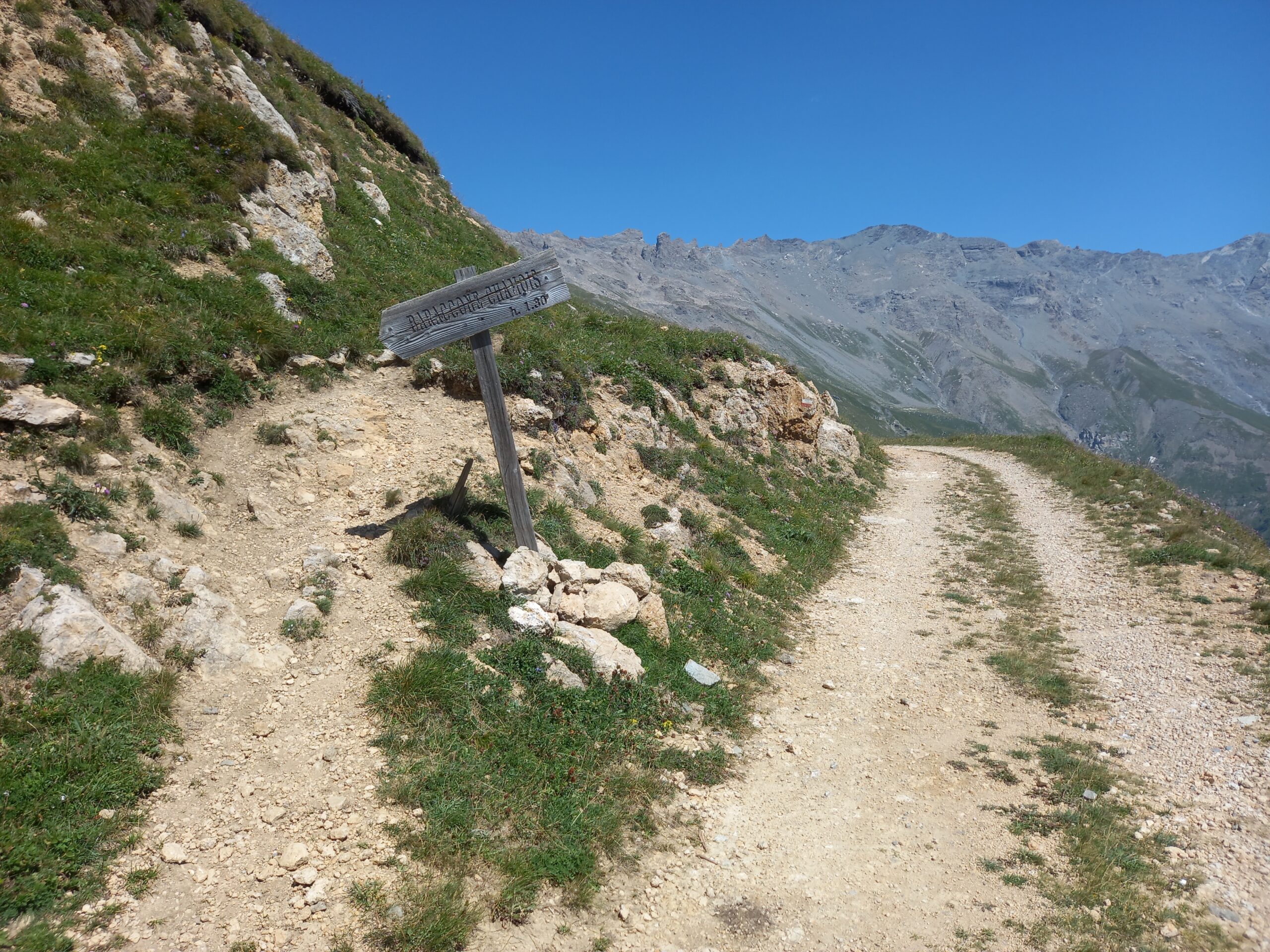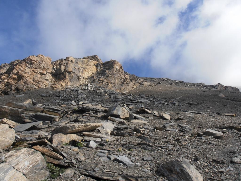 Sempre seguendo la mulattiera, o a piacimento tagliando i tornanti fuori traccia, si sale verso nord-ovest puntando alla sella dove sono presenti alcuni resti di fortificazioni a 2670 m. Il sentiero prosegue momentaneamente sul versante rivolto verso la diga del Moncenisio, toccando in breve una seconda casermetta a 2750 m. A questo punto proseguire sulla destra della casermetta, ritornando sul versante della montagna fin’ora percorso, seguendo la traccia abbastanza marcata tra magri pascoli e i primi affioramenti rocciosi. Ci si sposta quindi in pieno versante sud, e quando l’ambiente diventa completamente detritico si affronta un primo tratto molto ripido e faticoso, dove la vecchia mulattiera è ormai scomparsa, ed in particolare in un tratto si sale davvero con fatica su sfasciumi mobili e ripidi, seppur senza pericoli. Si prosegue in direzione di una barriera rocciosa, che si aggira abbastanza comodamente sulla destra, per poi sbucare su un pendio, sempre detritico, molto più dolce dove il sentiero torna più agevole. Si sale questo pendio, via via più ripido puntando ad uno stretto intaglio ben evidente, raggiungibile con un breve canalino anche qui molto ripido e di terreno friabile. Sbucati all’intaglio si apre il plateau di nevai e detriti 3430 m a breve distanza dal Signal du Lac (a sinistra) e sotto il Signal du Lamet a destra. Una traccia piuttosto evidente percorre a mezza costa il pendio ovest del Signal du Lamet (volendo una traccia prosegue sul crestone e permette di salire in cima 3483 m), e continua un po’ più labile e scoscesa sino alla piccola depressione tra Signal e Pointe du Lamet. Attenzione perchè qui nel 2017 si è verificato un imponente crollo del Signal du Lamet verso la Val Cenischia, che ha cancellato una parte di sentiero rendendo un breve passaggio un po’ aereo ma evitabile abbassandosi a sinistra. Prestare attenzione perchè il terreno continua a essere in movimento e si verificheranno ulteriori smottamenti.