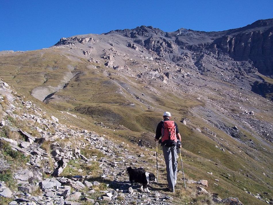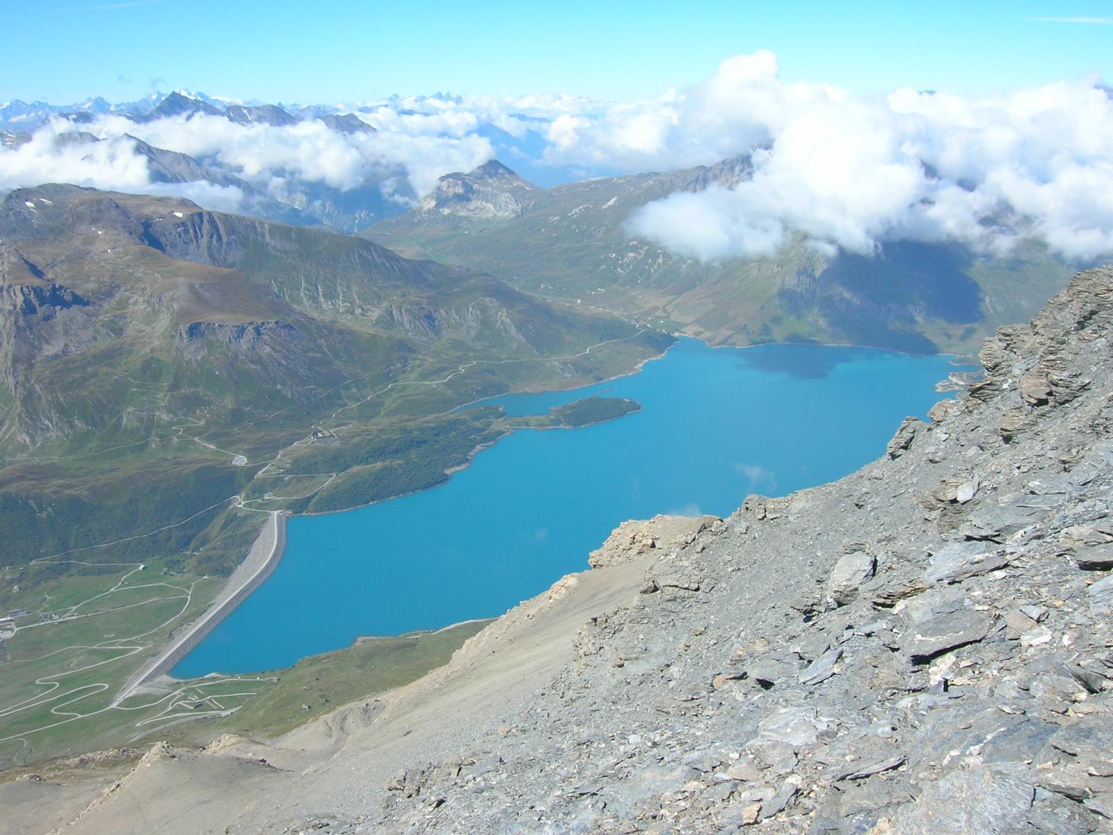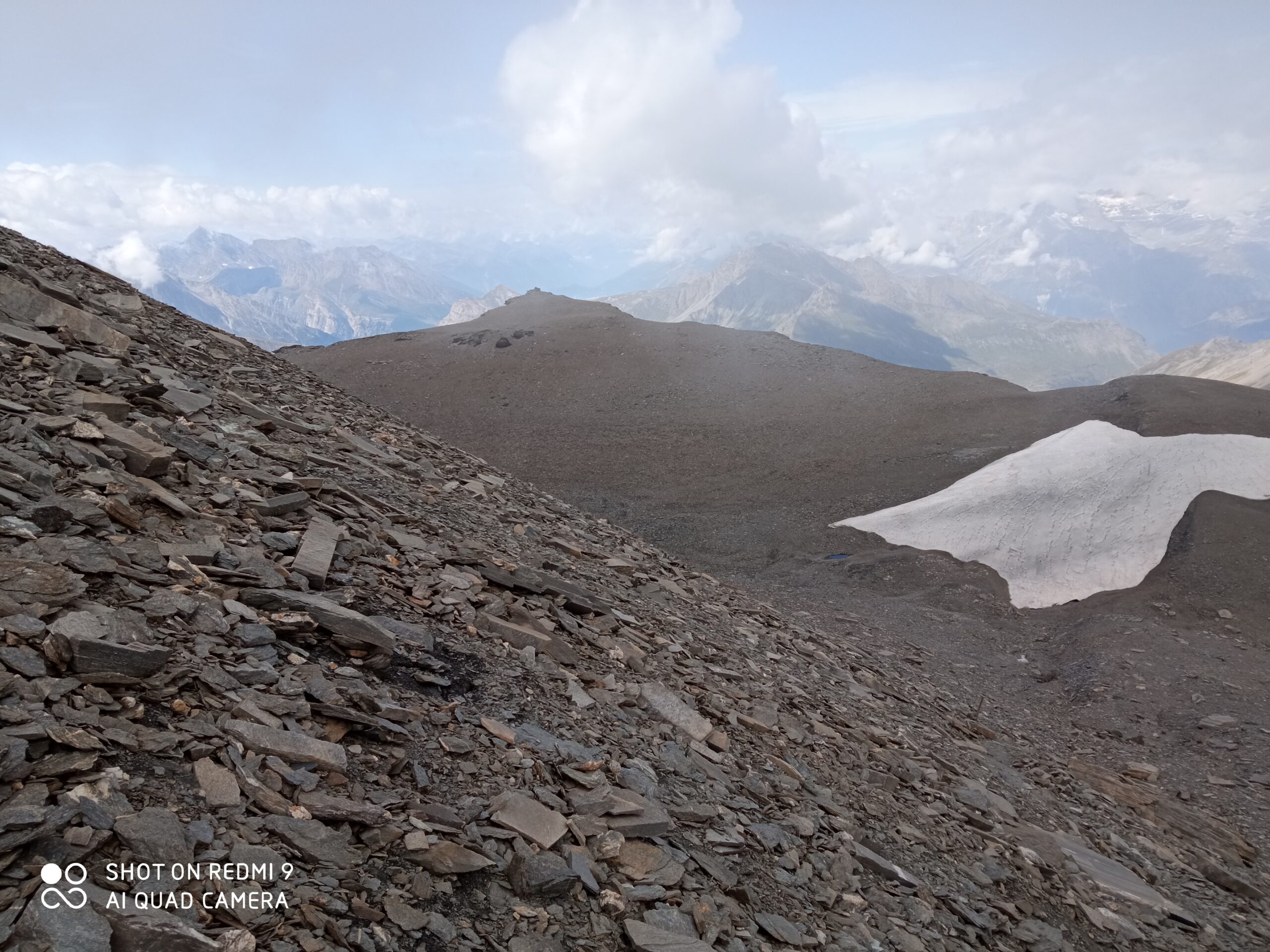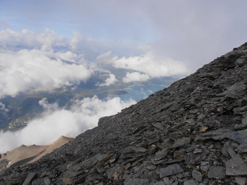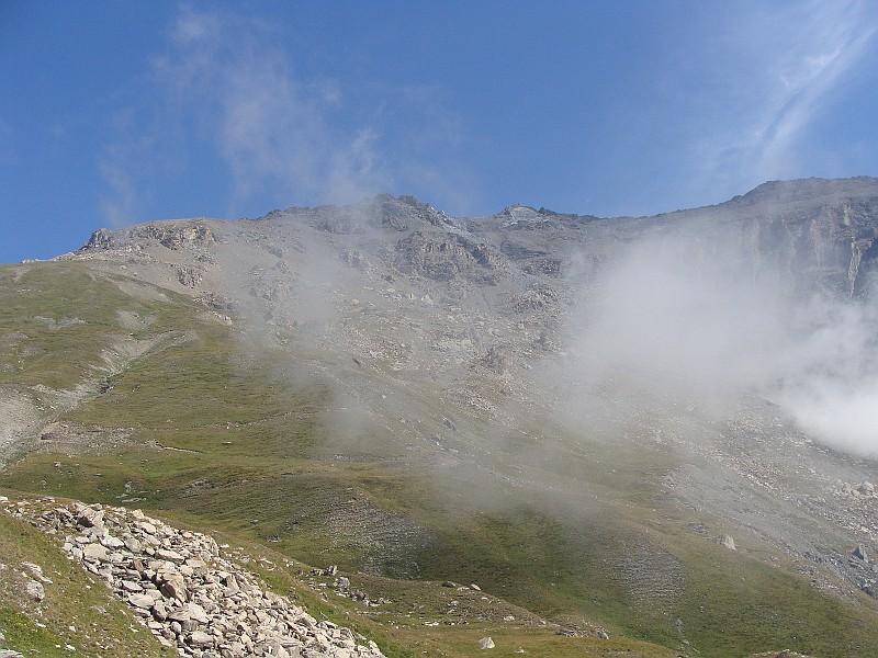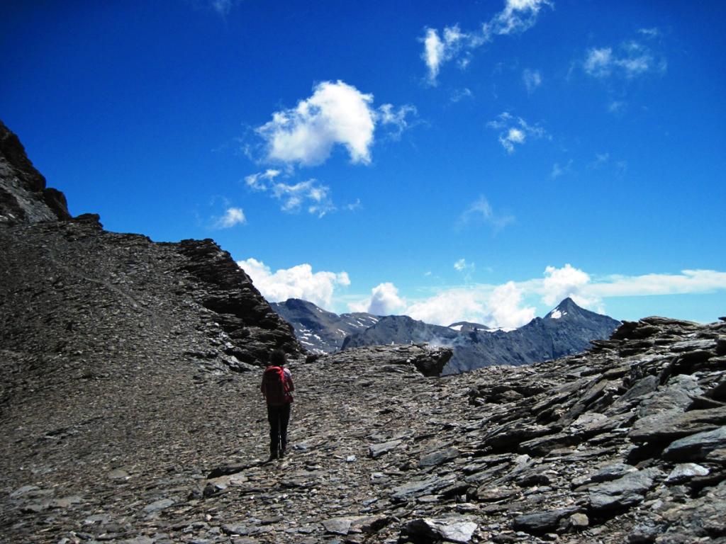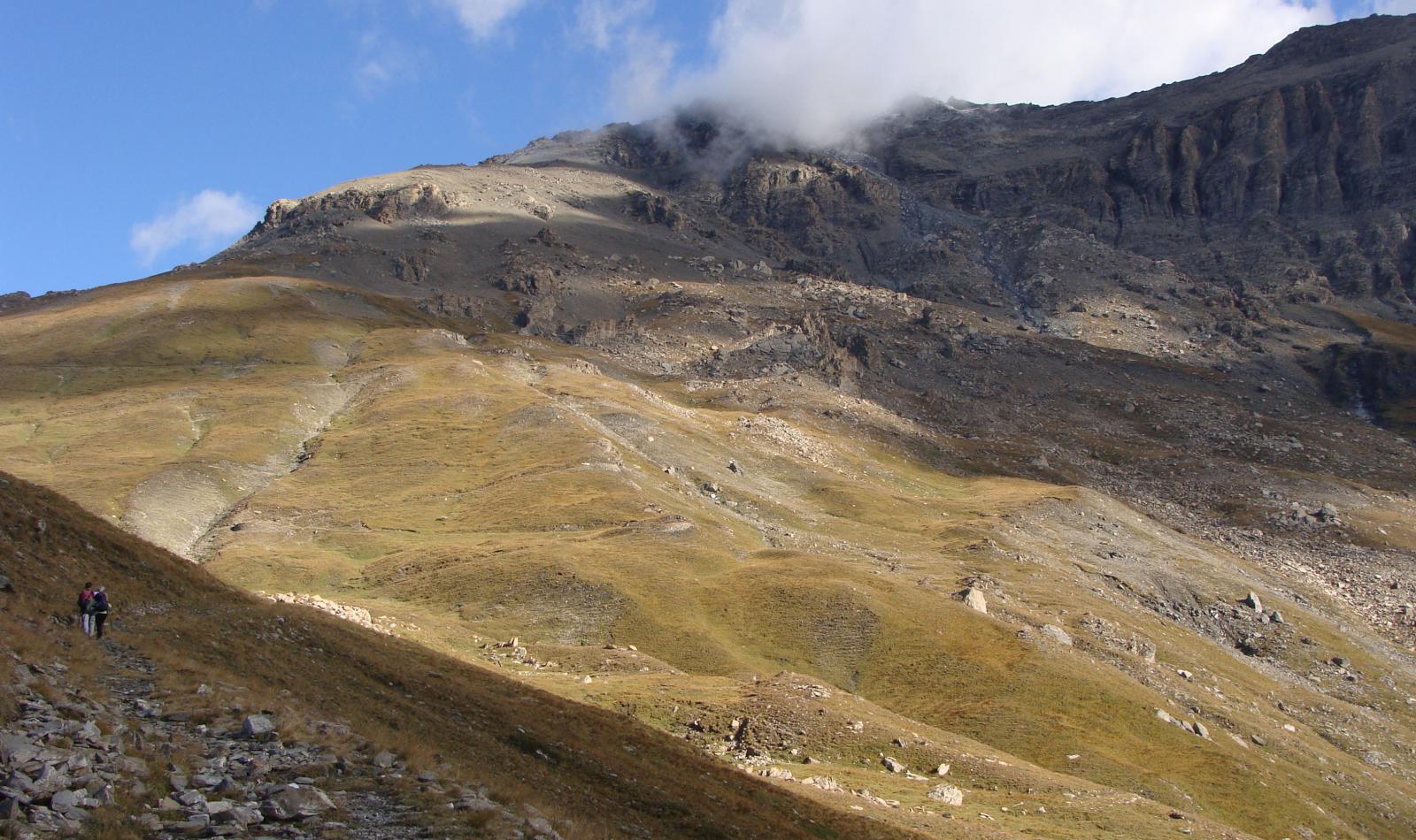 Sempre seguendo la mulattiera, o a piacimento tagliando i tornanti fuori traccia, si sale verso nord-ovest puntando alla sella dove sono presenti alcuni resti di fortificazioni a 2670 m. Il sentiero prosegue momentaneamente sul versante rivolto verso la diga del Moncenisio, toccando in breve una seconda casermetta a 2750 m. A questo punto proseguire sulla destra della casermetta, ritornando sul versante della montagna fin’ora percorso, seguendo la traccia abbastanza marcata tra magri pascoli e i primi affioramenti rocciosi. Ci si sposta quindi in pieno versante sud, e quando l’ambiente diventa completamente detritico si affronta un primo tratto molto ripido e faticoso, dove la vecchia mulattiera è ormai scomparsa, ed in particolare in un tratto si sale davvero con fatica su sfasciumi mobili e ripidi, seppur senza pericoli. Si prosegue in direzione di una barriera rocciosa, che si aggira abbastanza comodamente sulla destra, per poi sbucare su un pendio, sempre detritico, molto più dolce dove il sentiero torna più agevole. Si sale questo pendio, via via più ripido puntando ad uno stretto intaglio ben evidente, raggiungibile con un breve canalino anche qui molto ripido e di terreno friabile. Sbucati all’intaglio si apre il plateau di nevai e detriti 3430 m a breve distanza dal Signal du Lac (a sinistra) e sotto il Signal du Lamet a destra. Una traccia piuttosto evidente percorre a mezza costa il pendio ovest del Signal du Lamet (volendo una traccia prosegue sul crestone e permette di salire in cima 3483 m), e continua un po’ più labile e scoscesa sino alla piccola depressione tra Signal e Pointe du Lamet. Attenzione perchè qui nel 2017 si è verificato un imponente crollo del Signal du Lamet verso la Val Cenischia, che ha cancellato una parte di sentiero rendendo un breve passaggio un po’ aereo ma evitabile abbassandosi a sinistra. Prestare attenzione perchè il terreno continua a essere in movimento e si verificheranno ulteriori smottamenti.