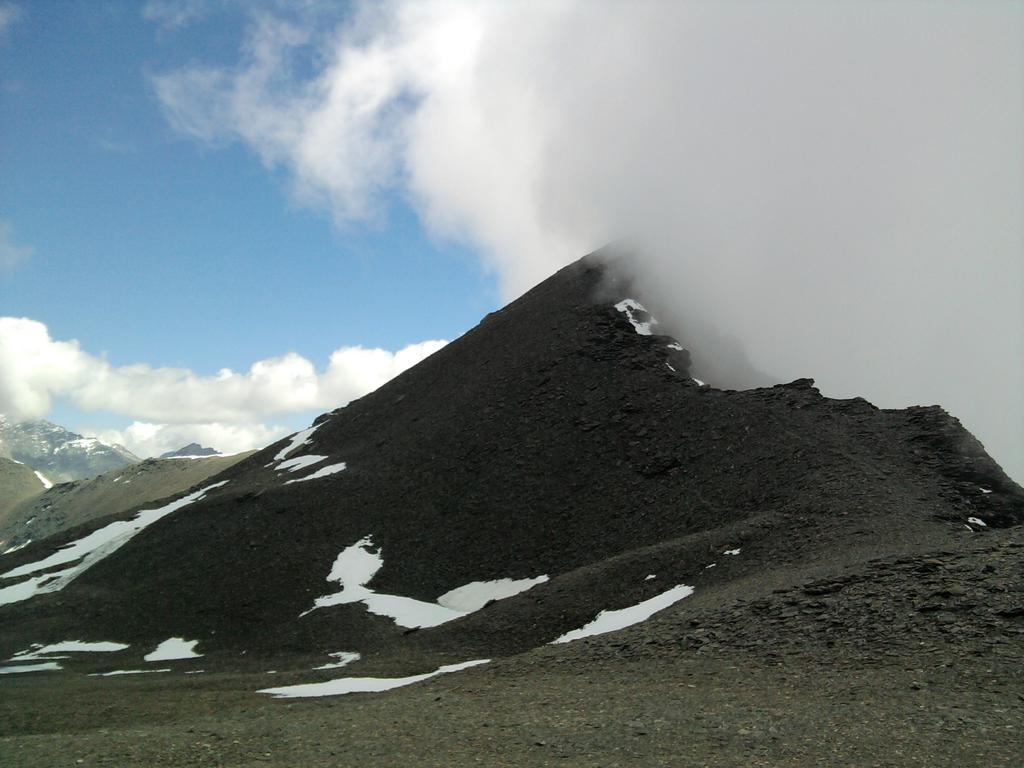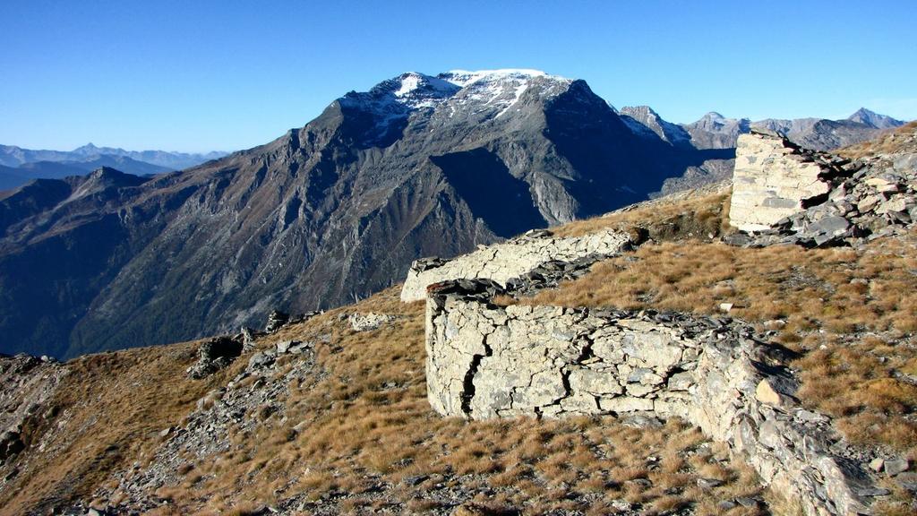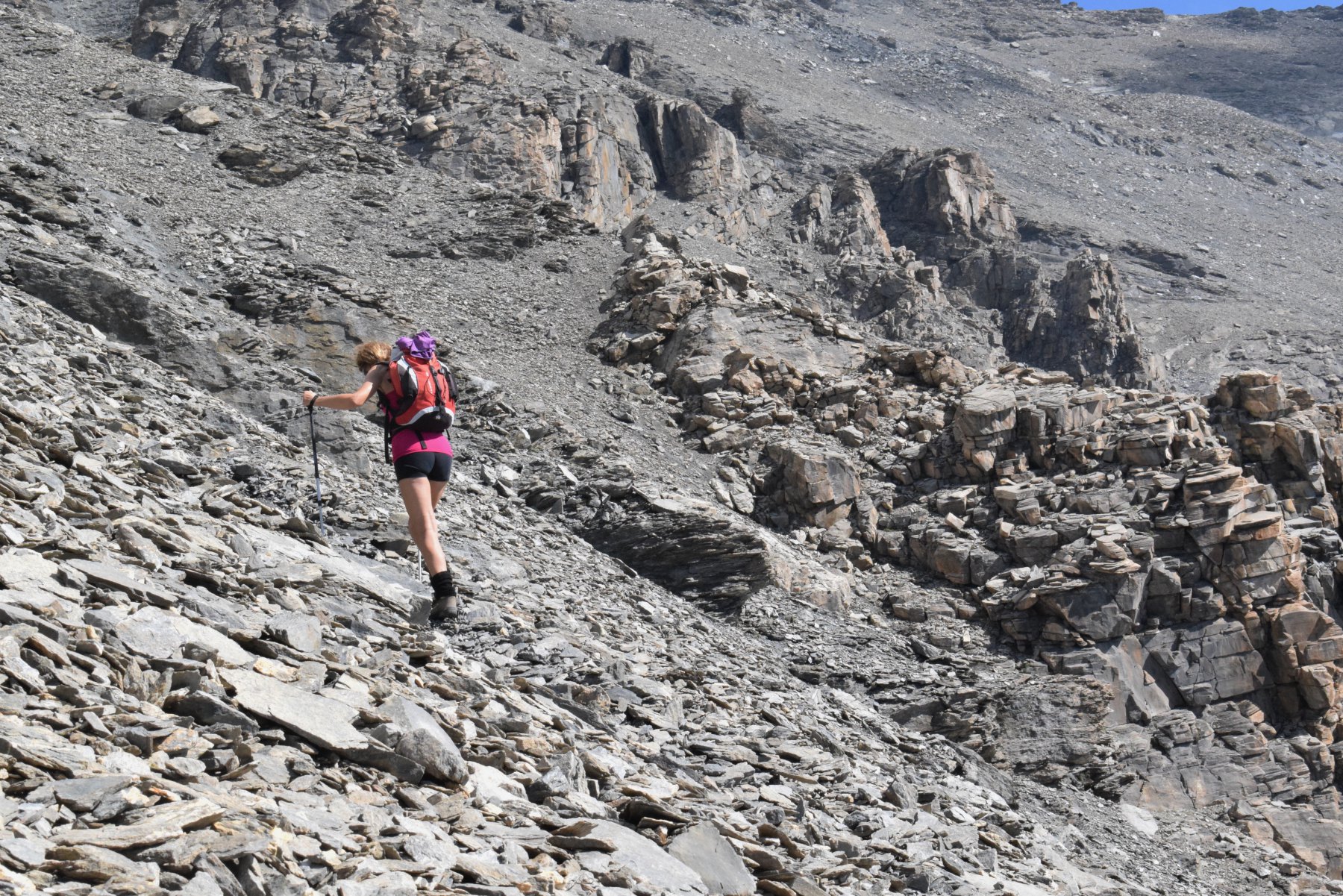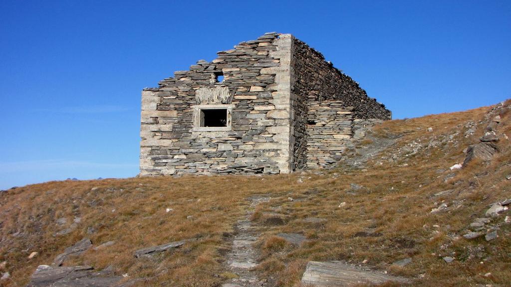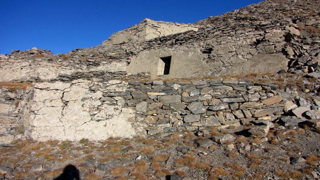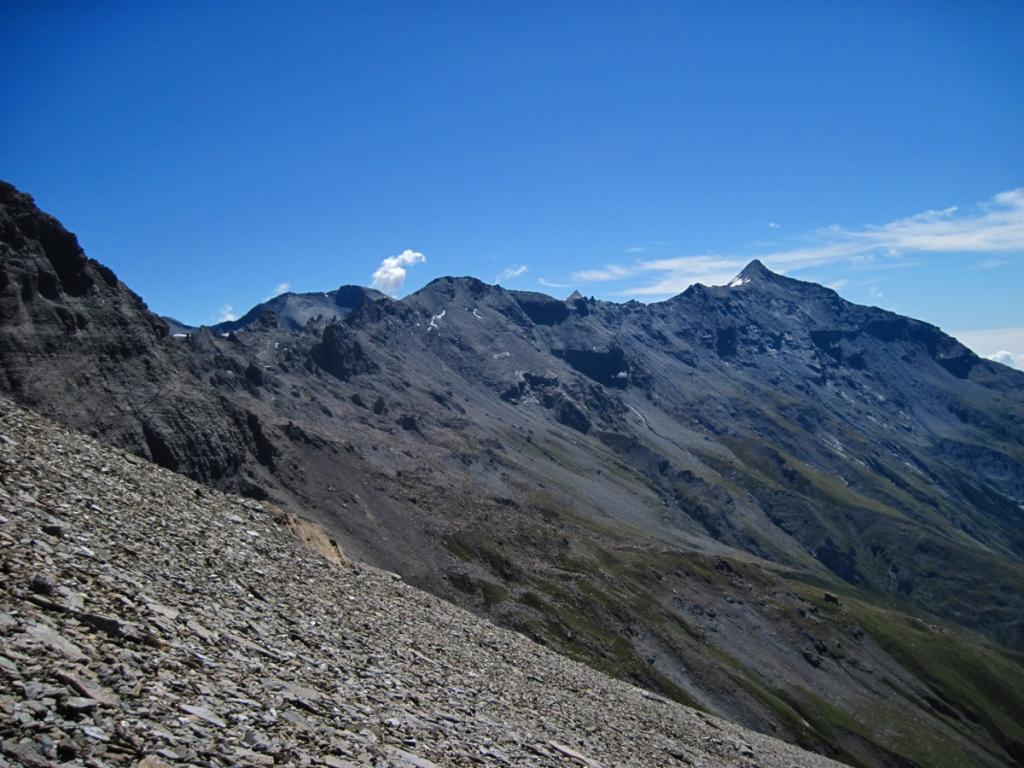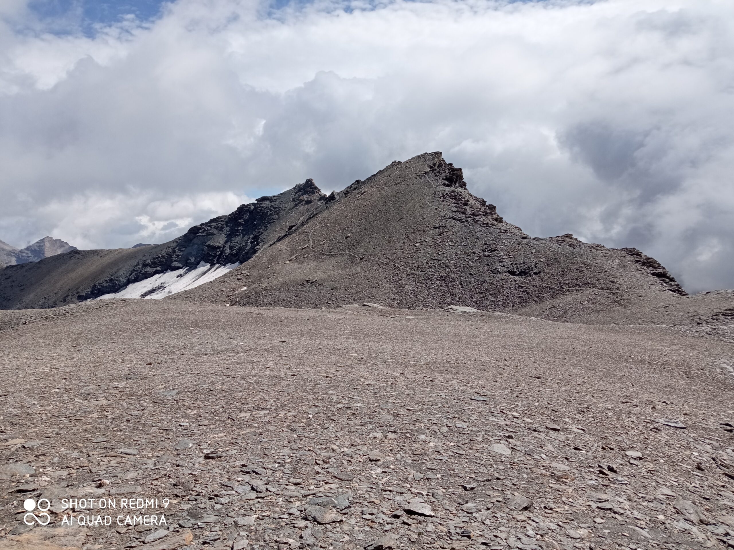Sempre seguendo la mulattiera, o a piacimento tagliando i tornanti fuori traccia, si sale verso nord-ovest puntando alla sella dove sono presenti alcuni resti di fortificazioni a 2670 m. Il sentiero prosegue momentaneamente sul versante rivolto verso la diga del Moncenisio, toccando in breve una seconda casermetta a 2750 m. A questo punto proseguire sulla destra della casermetta, ritornando sul versante della montagna fin’ora percorso, seguendo la traccia abbastanza marcata tra magri pascoli e i primi affioramenti rocciosi. Ci si sposta quindi in pieno versante sud, e quando l’ambiente diventa completamente detritico si affronta un primo tratto molto ripido e faticoso, dove la vecchia mulattiera è ormai scomparsa, ed in particolare in un tratto si sale davvero con fatica su sfasciumi mobili e ripidi, seppur senza pericoli. Si prosegue in direzione di una barriera rocciosa, che si aggira abbastanza comodamente sulla destra, per poi sbucare su un pendio, sempre detritico, molto più dolce dove il sentiero torna più agevole. Si sale questo pendio, via via più ripido puntando ad uno stretto intaglio ben evidente, raggiungibile con un breve canalino anche qui molto ripido e di terreno friabile. Sbucati all’intaglio si apre il plateau di nevai e detriti 3430 m a breve distanza dal Signal du Lac (a sinistra) e sotto il Signal du Lamet a destra. Una traccia piuttosto evidente percorre a mezza costa il pendio ovest del Signal du Lamet (volendo una traccia prosegue sul crestone e permette di salire in cima 3483 m), e continua un po’ più labile e scoscesa sino alla piccola depressione tra Signal e Pointe du Lamet. Attenzione perchè qui nel 2017 si è verificato un imponente crollo del Signal du Lamet verso la Val Cenischia, che ha cancellato una parte di sentiero rendendo un breve passaggio un po’ aereo ma evitabile abbassandosi a sinistra. Prestare attenzione perchè il terreno continua a essere in movimento e si verificheranno ulteriori smottamenti.